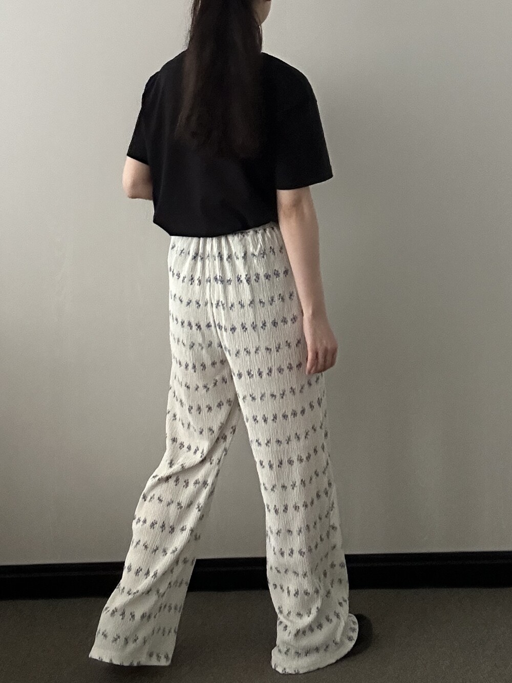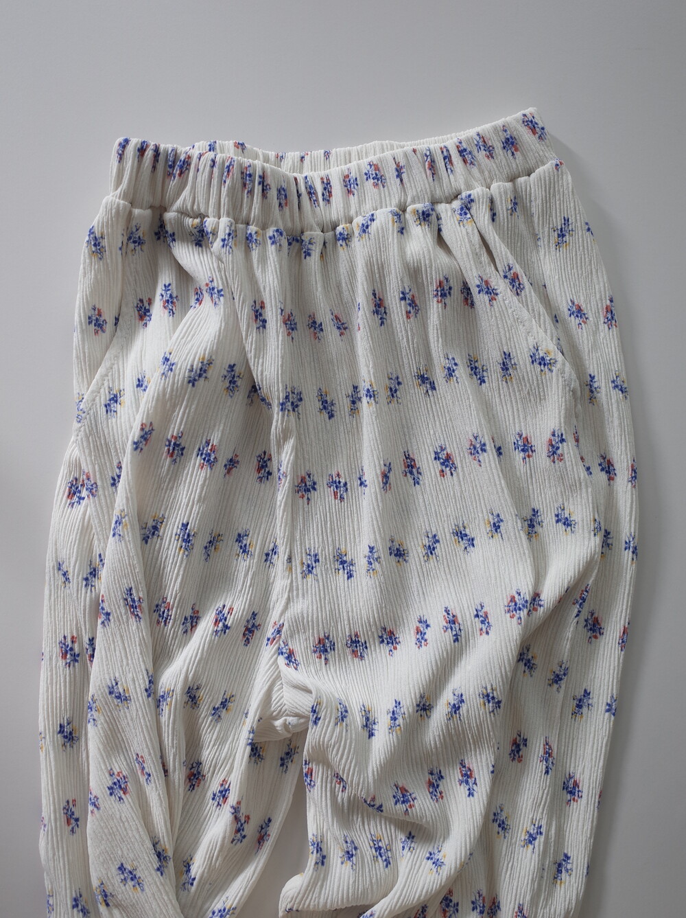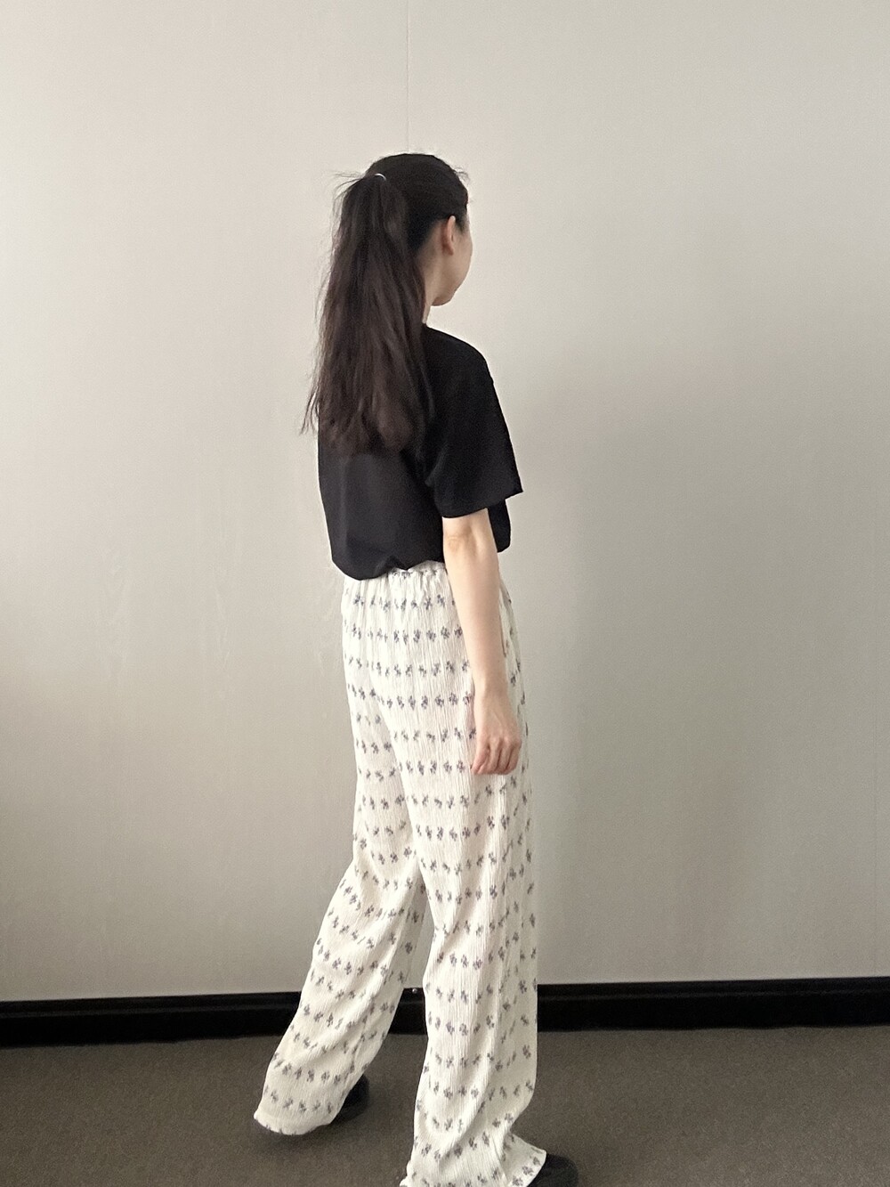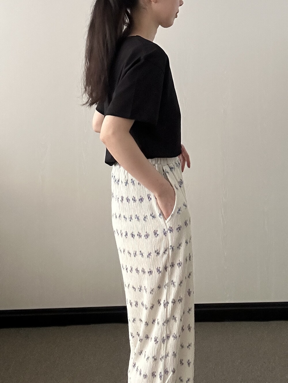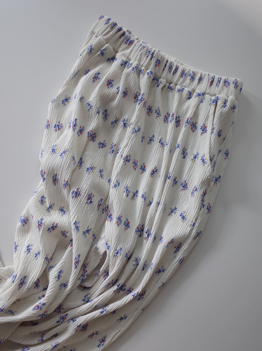 얇은 플리츠 주름에 귀여운 플라워 나염이 되어있는 시원한 팬츠입니다.