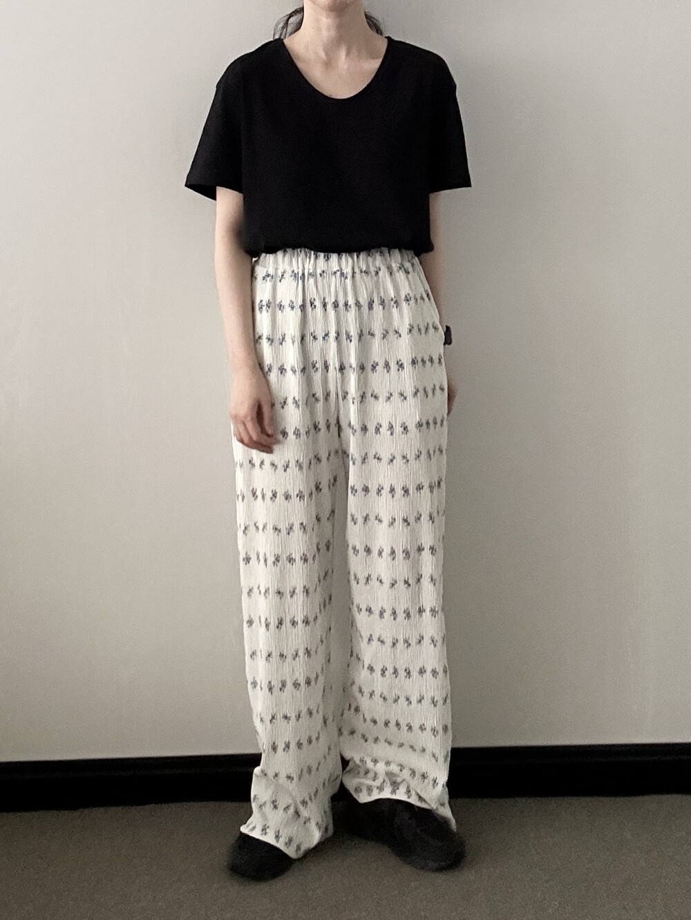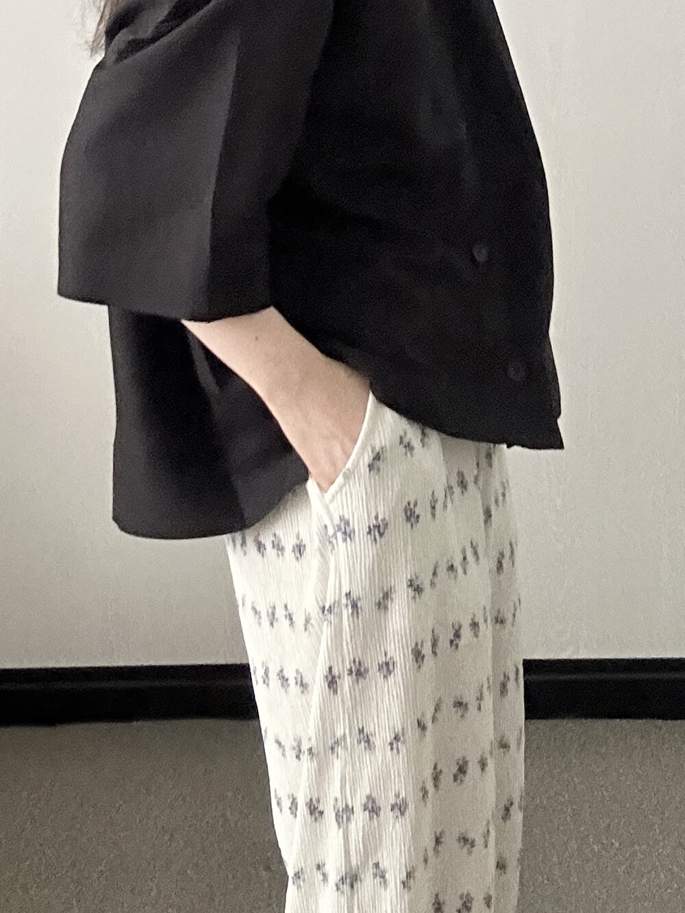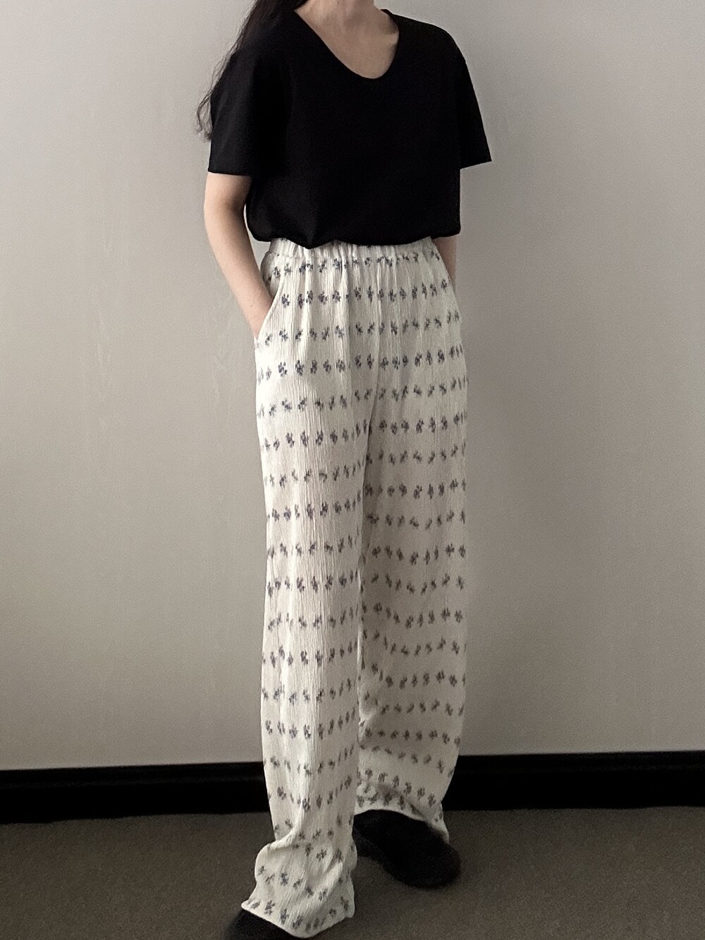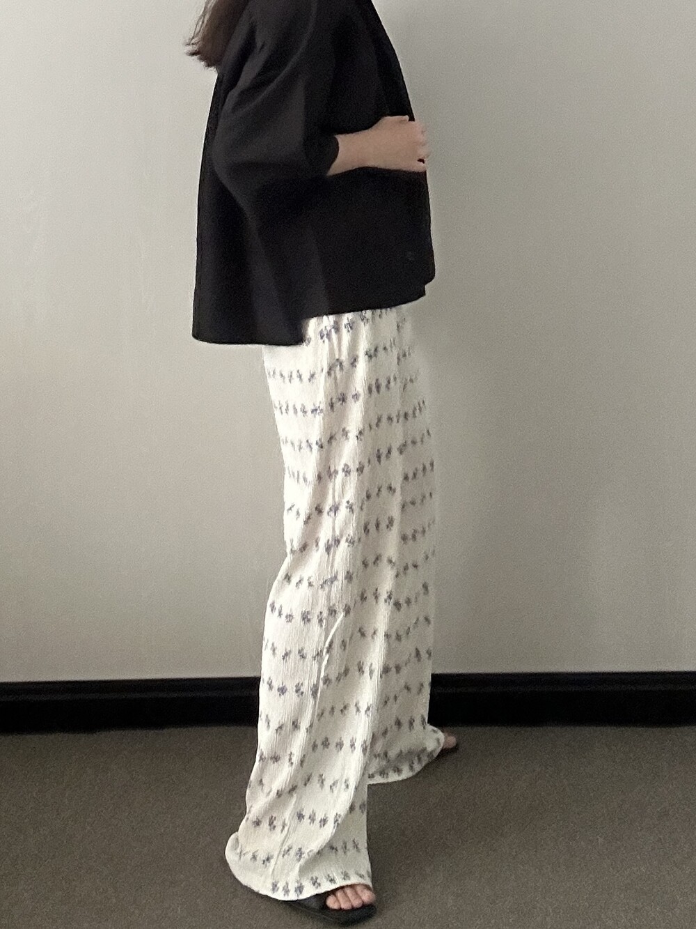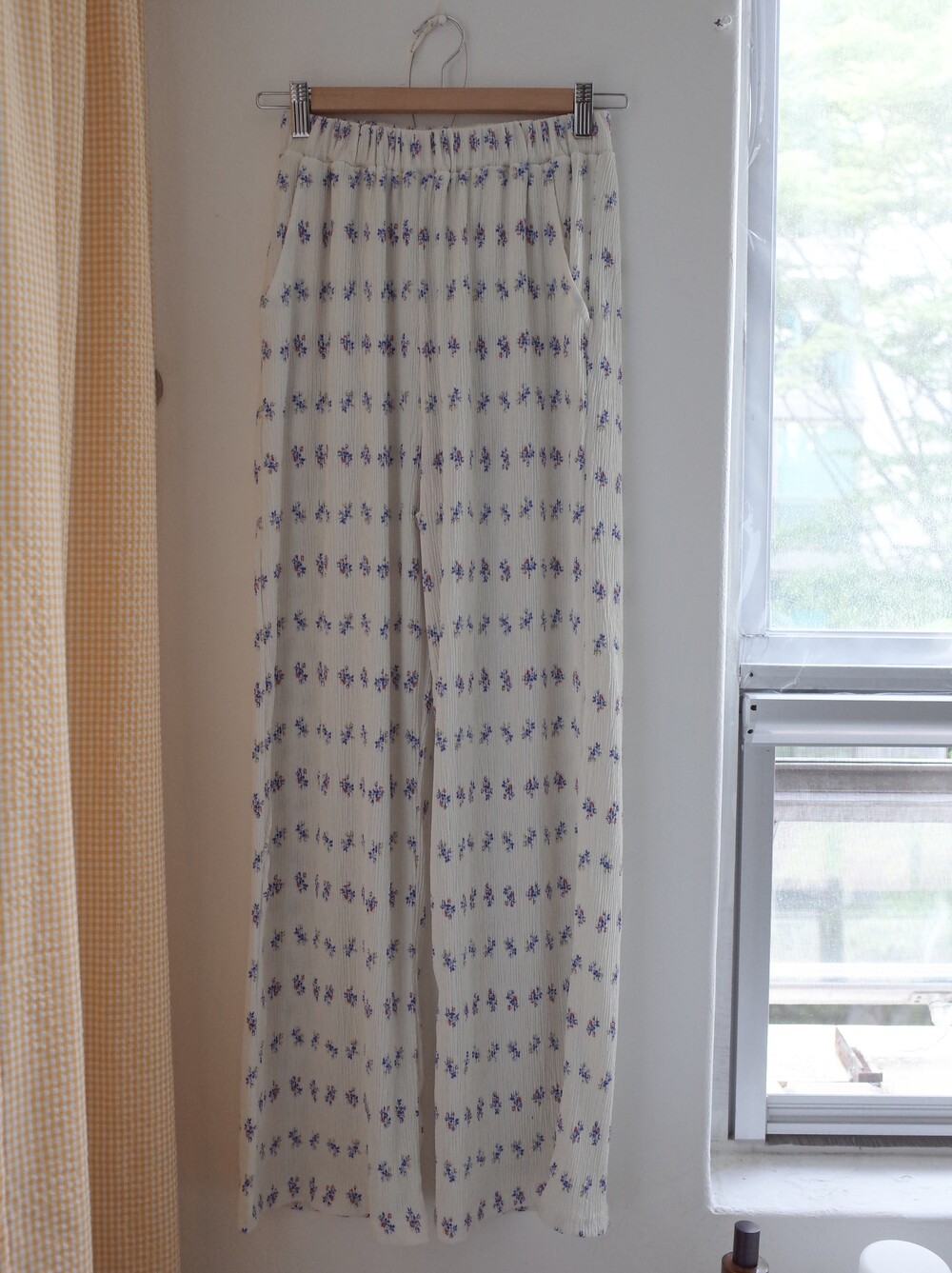 얇은 플리츠 주름에 귀여운 플라워 나염이 되어있는 시원한 팬츠입니다.