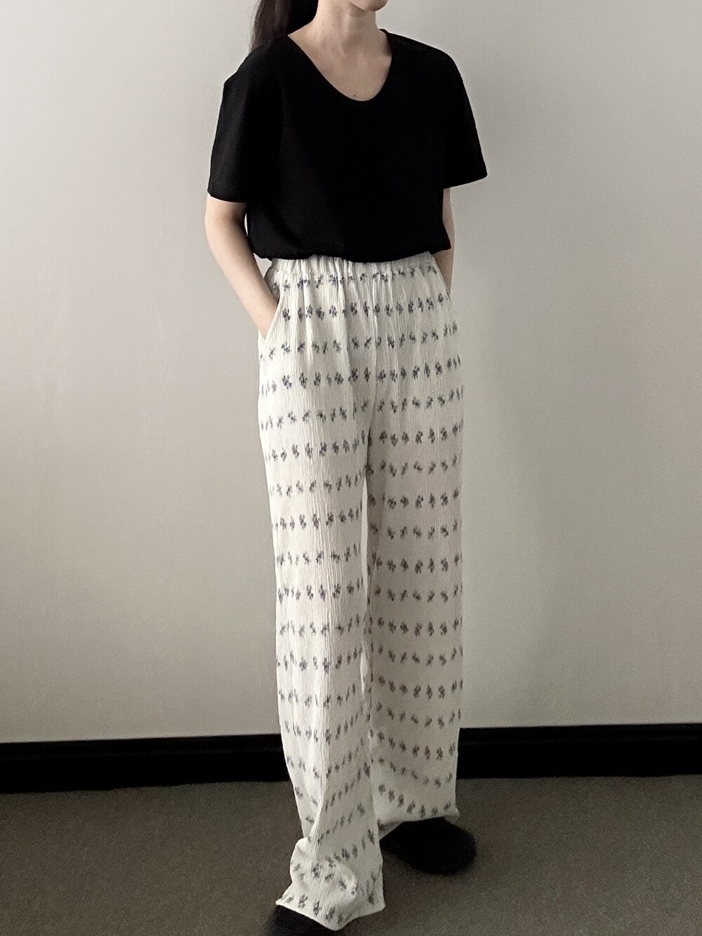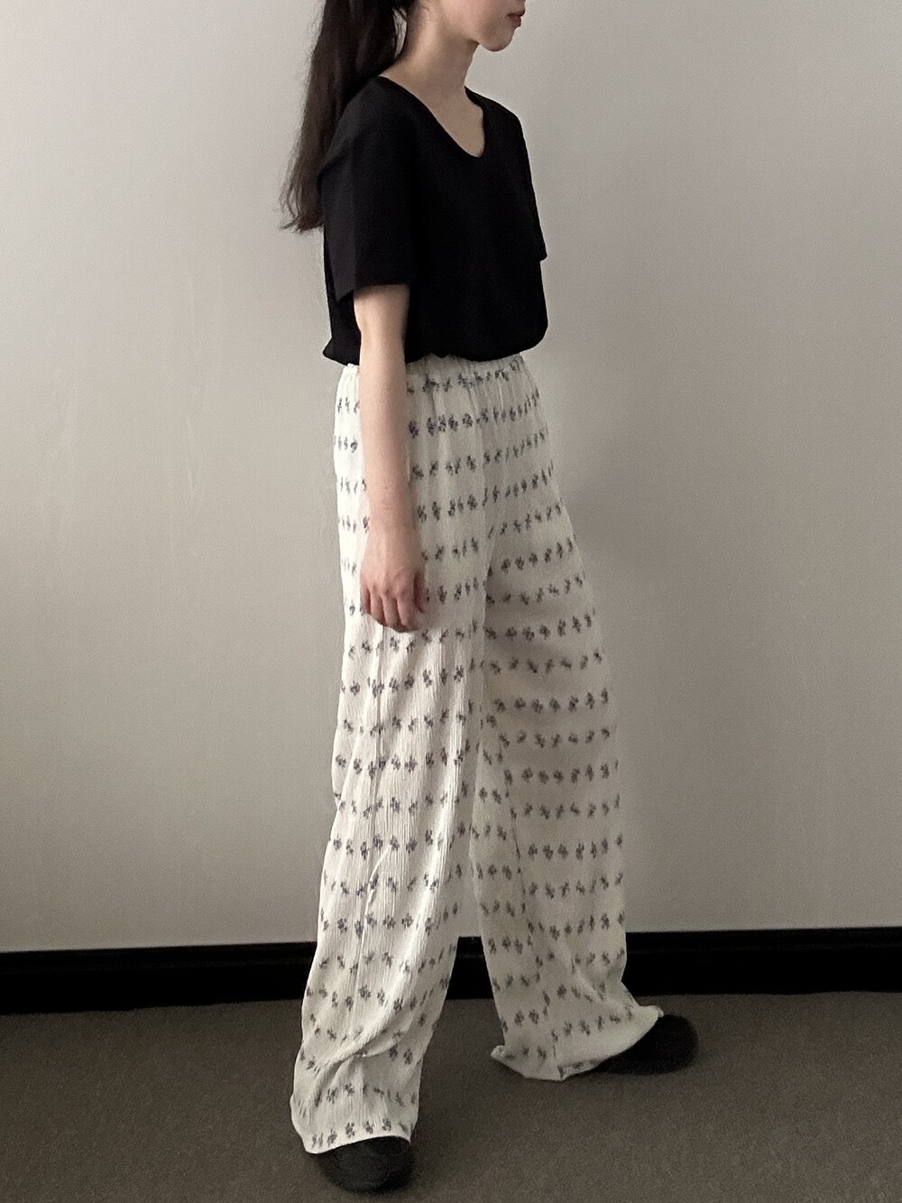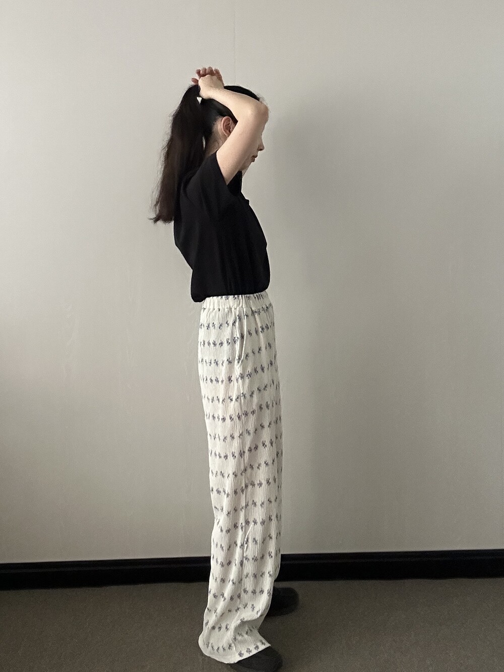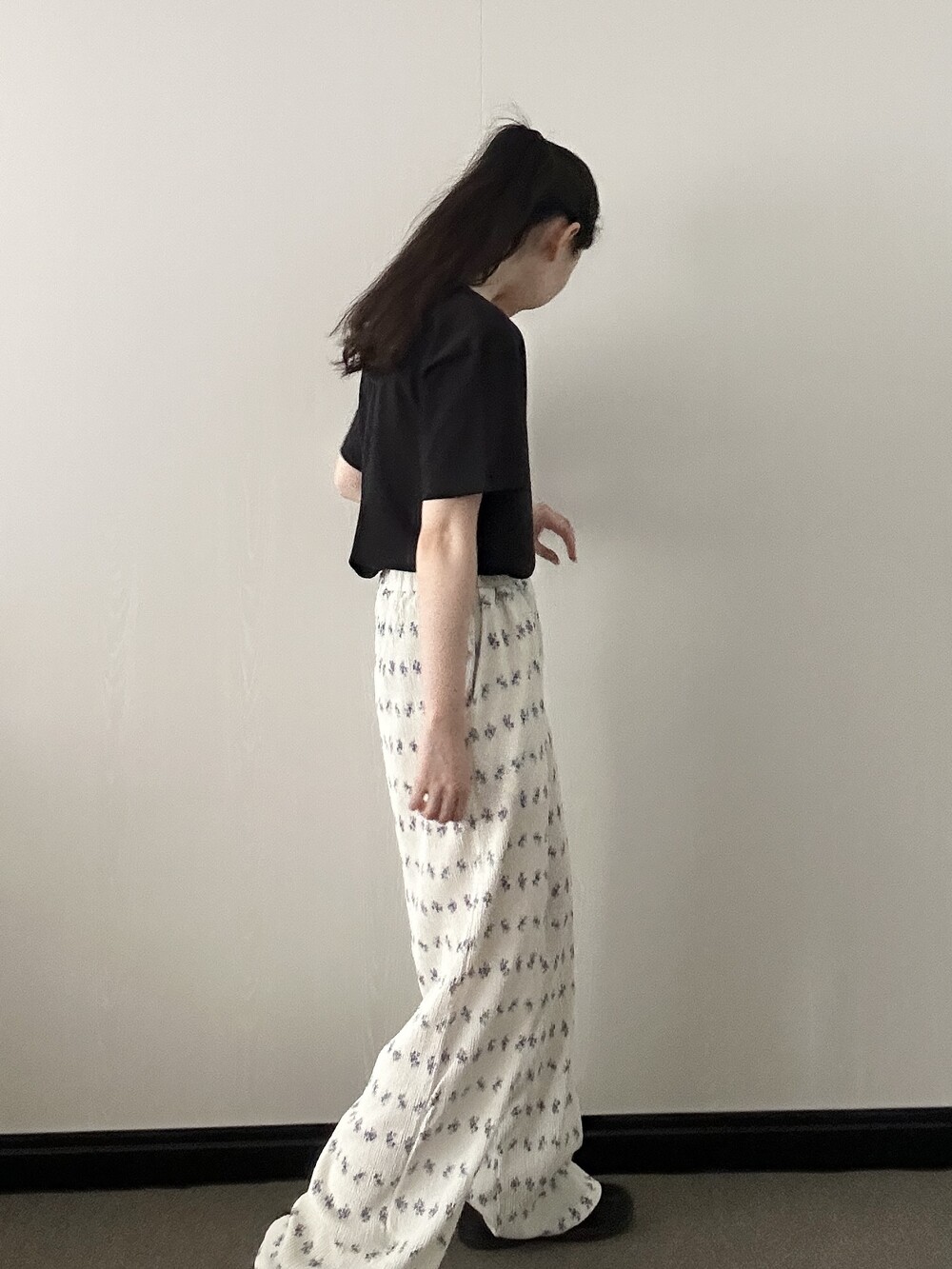 얇은 플리츠 주름에 귀여운 플라워 나염이 되어있는 시원한 팬츠입니다.