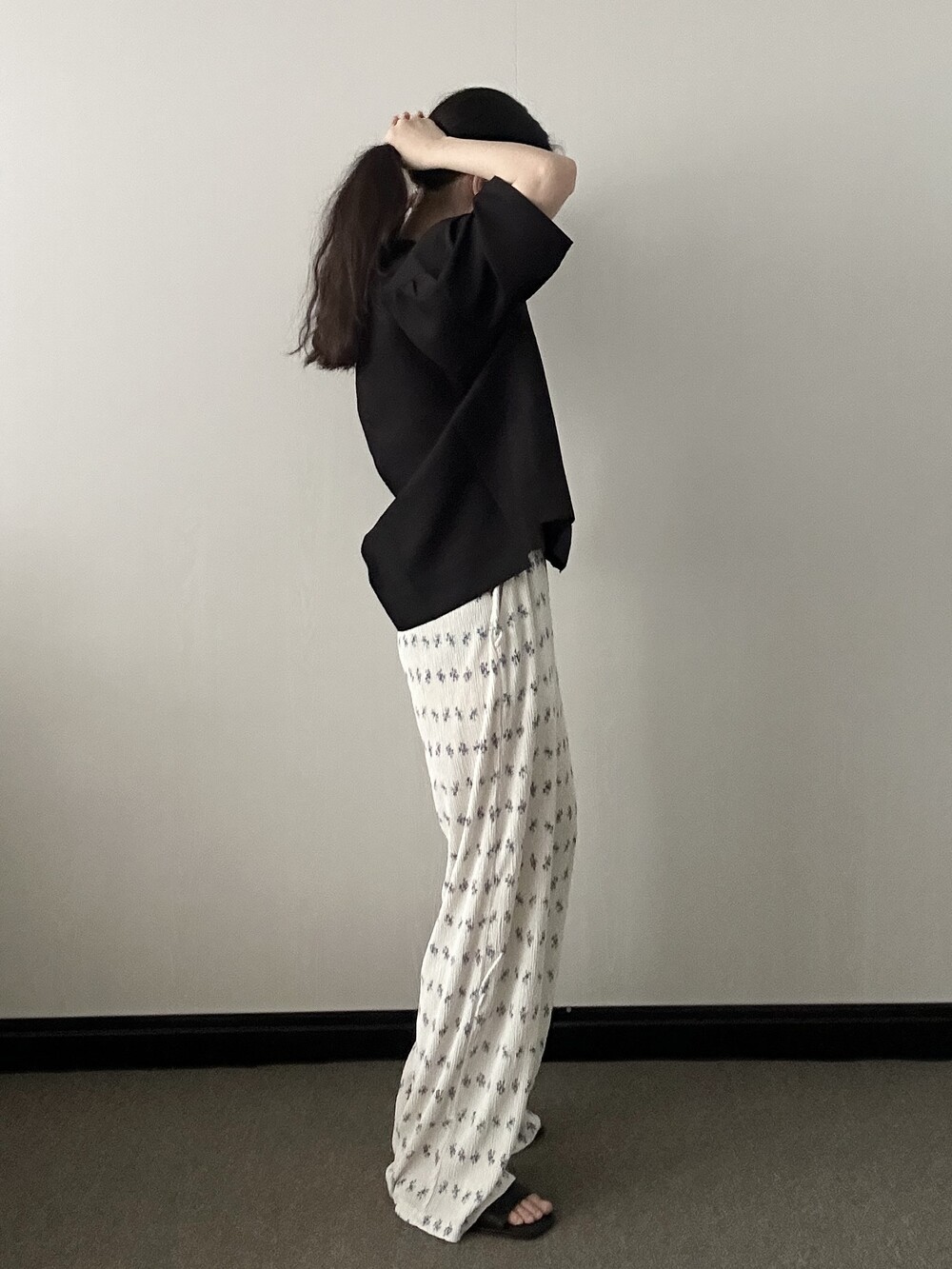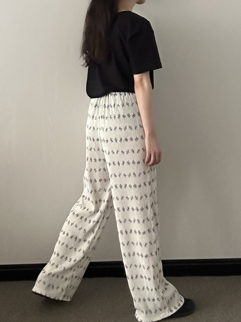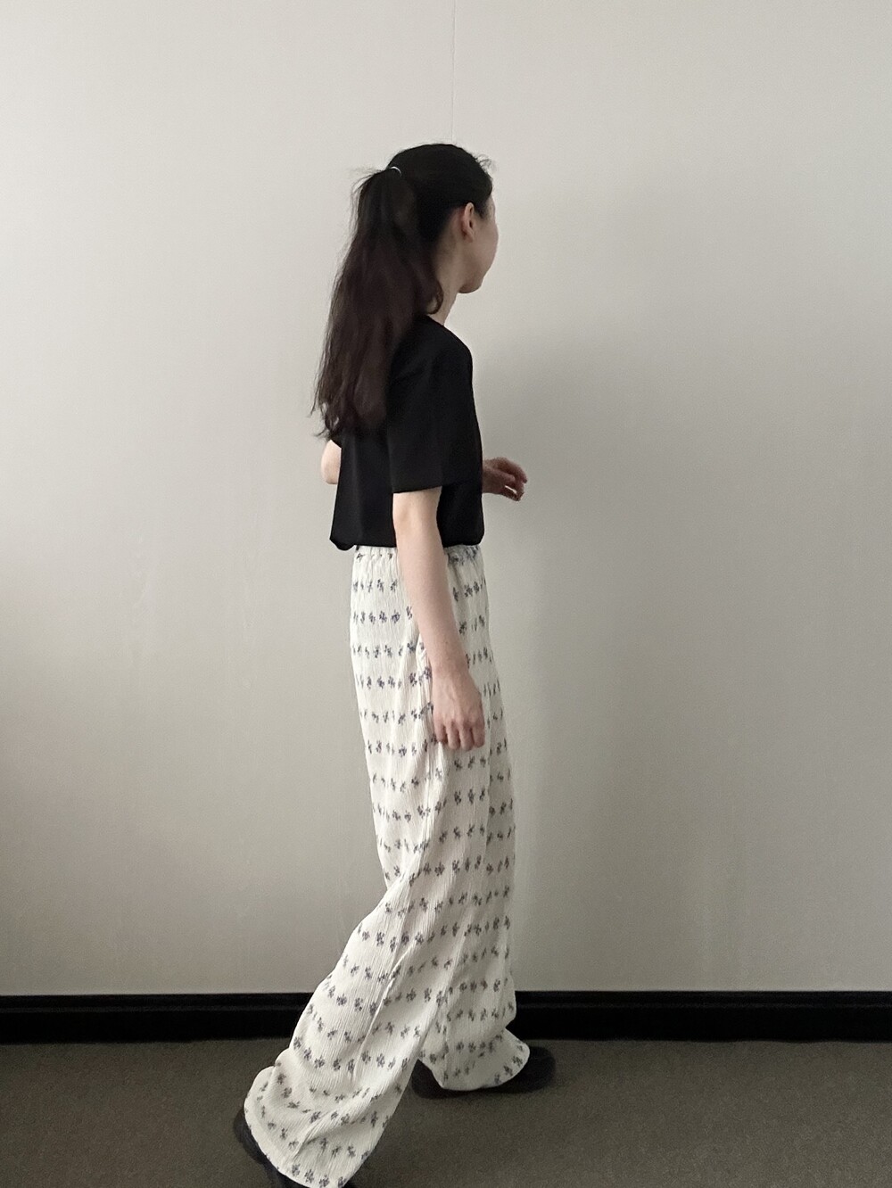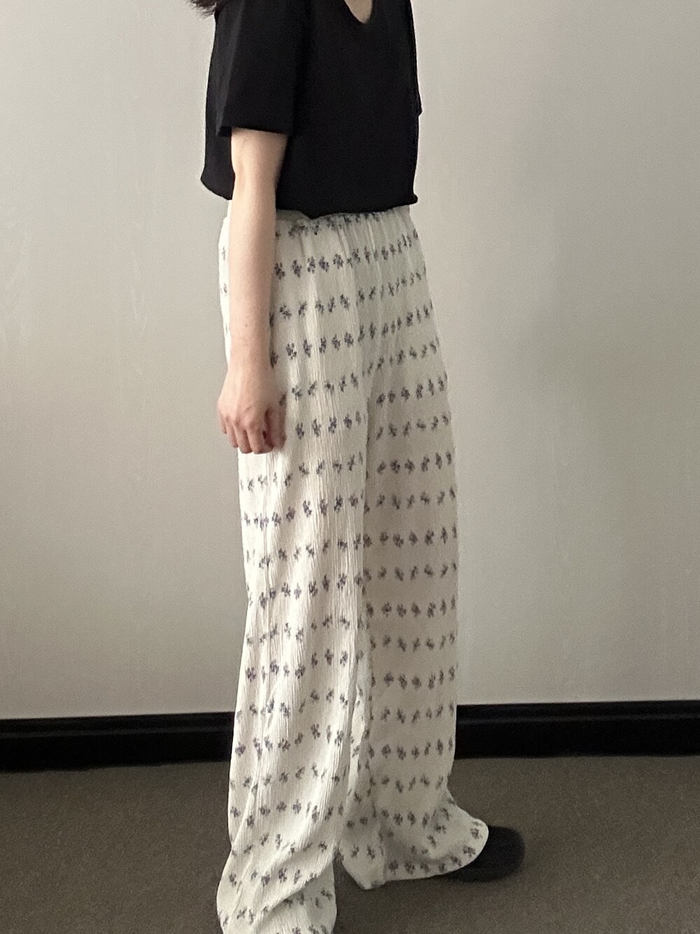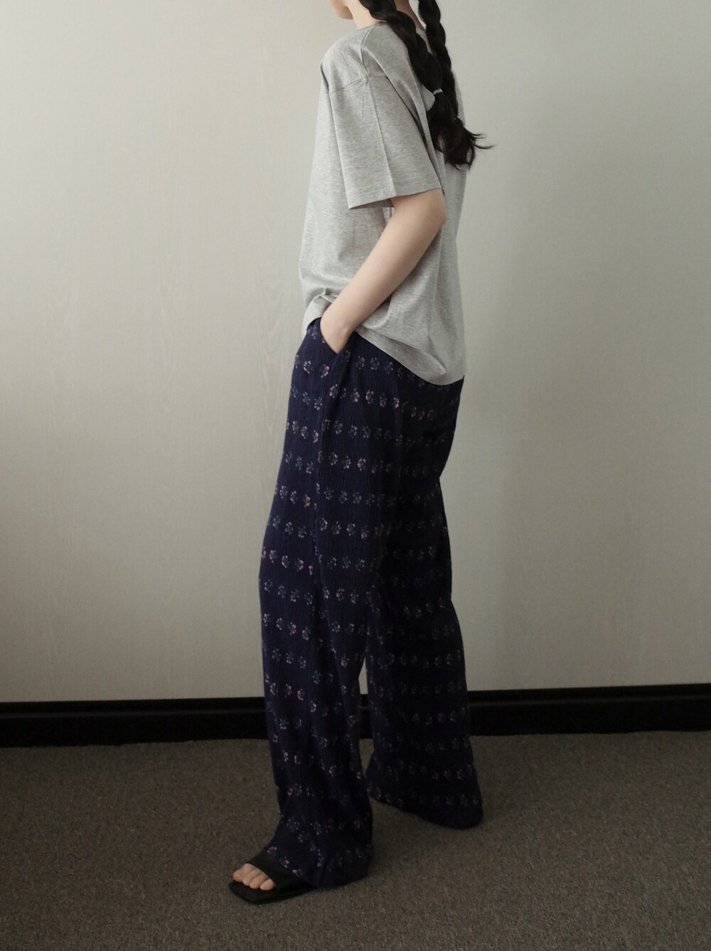 얇은 플리츠 주름에 귀여운 플라워 나염이 되어있는 시원한 팬츠입니다.