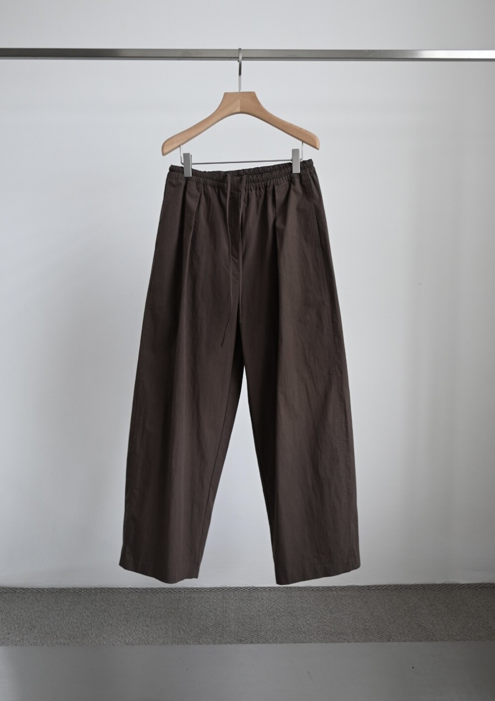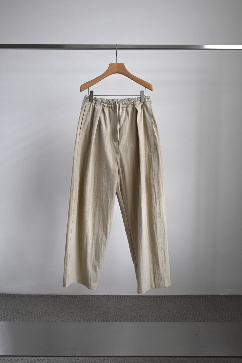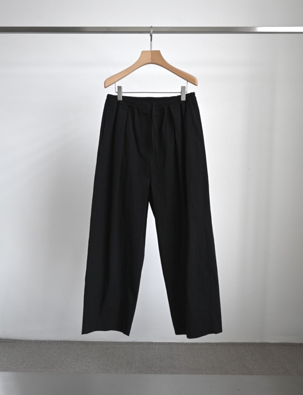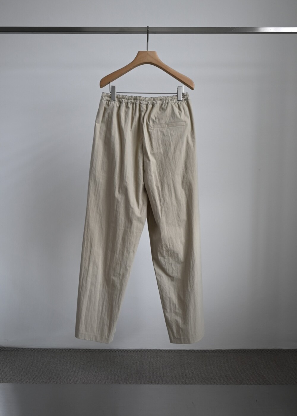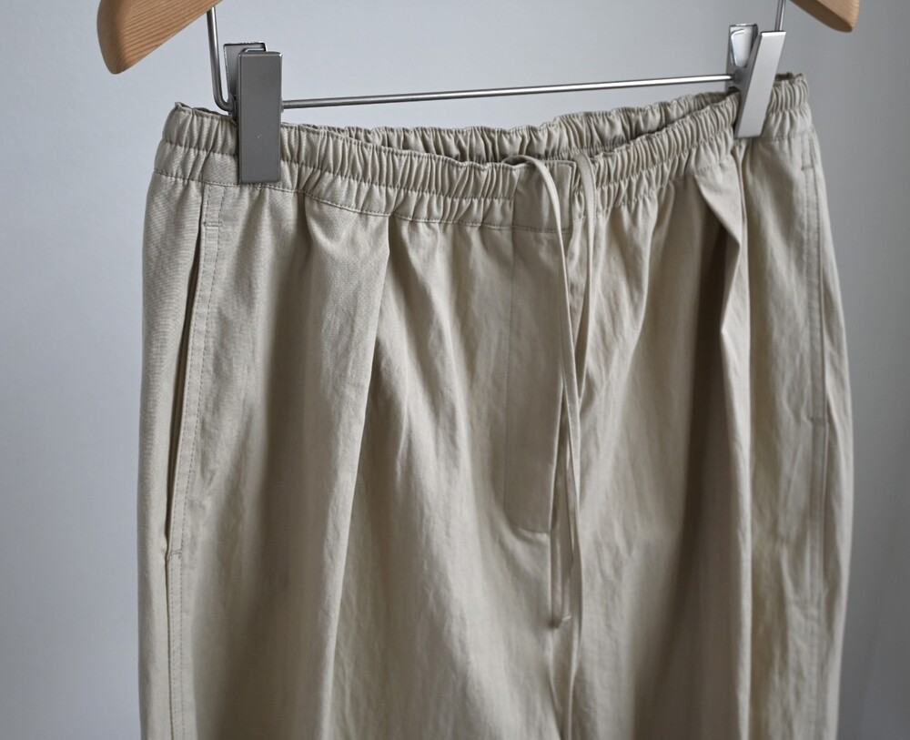 밴딩 팬츠이지만 앞 지퍼 디테일과 단추 디테일, 웨이스트 라인에 핀턱을 넣어주어 퀄리티를 높였습니다.