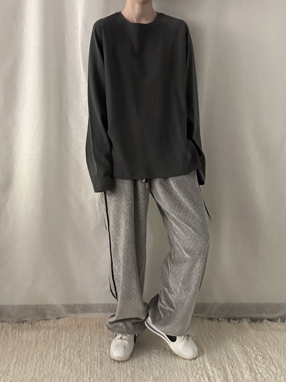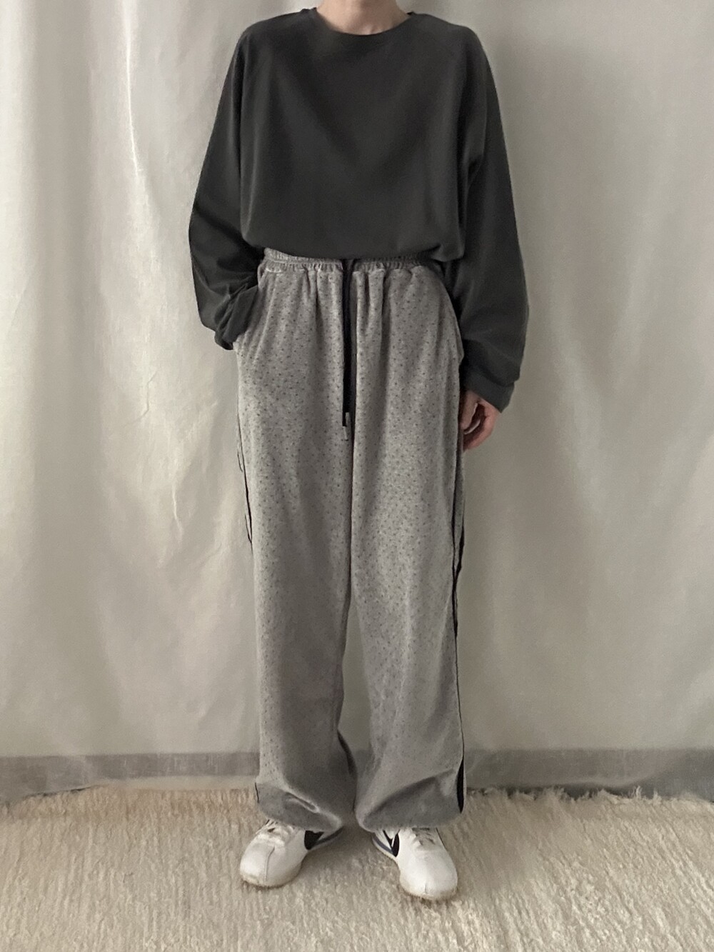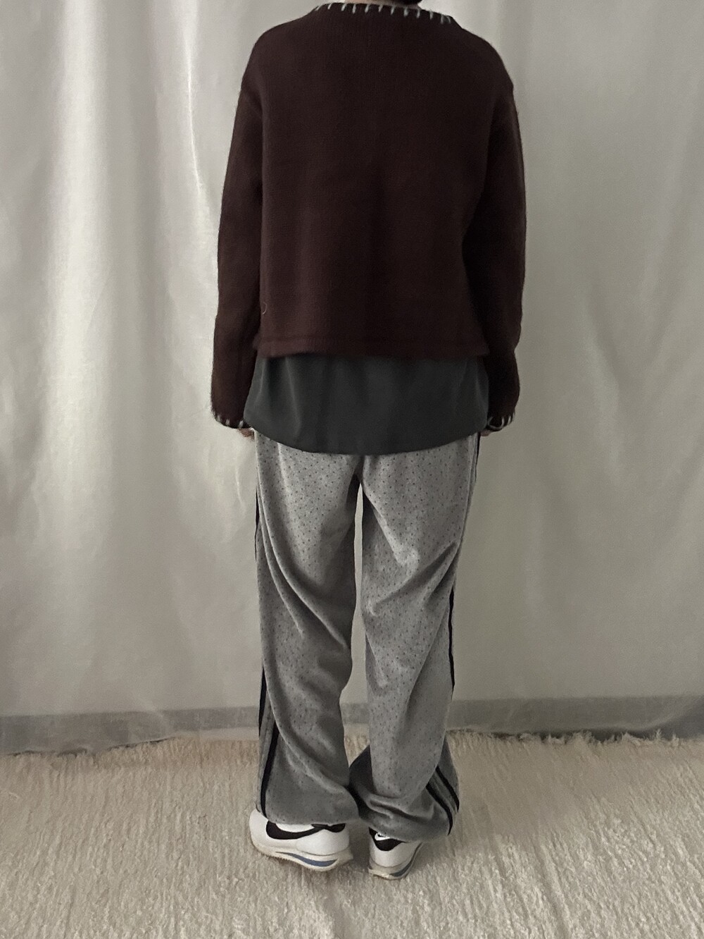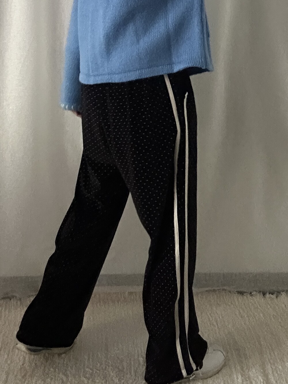 부드러운 벨벳 터치감이 느껴지는 트랙 팬츠예요.