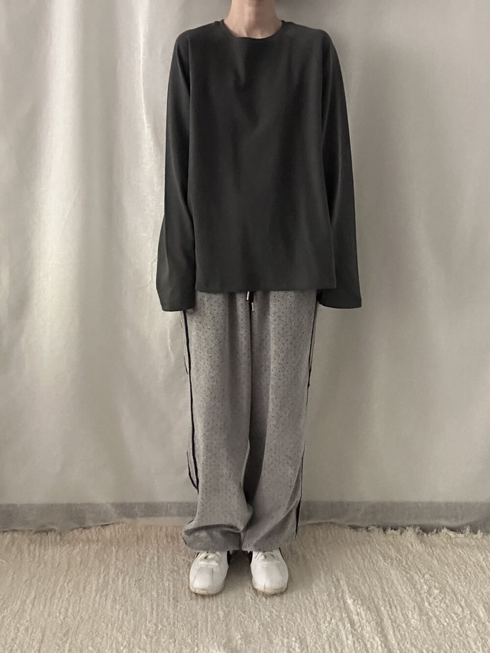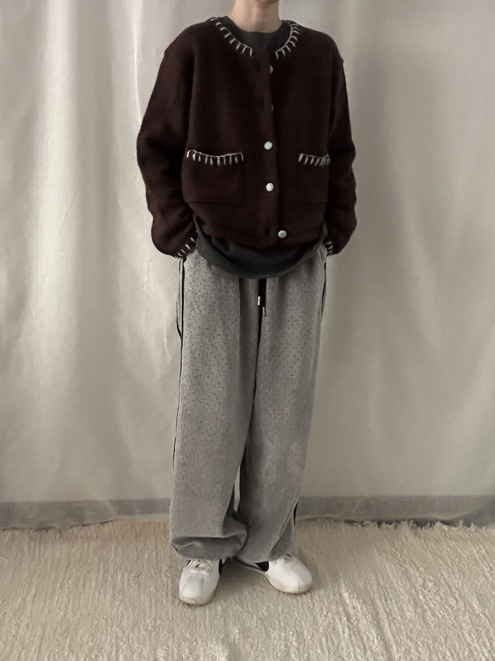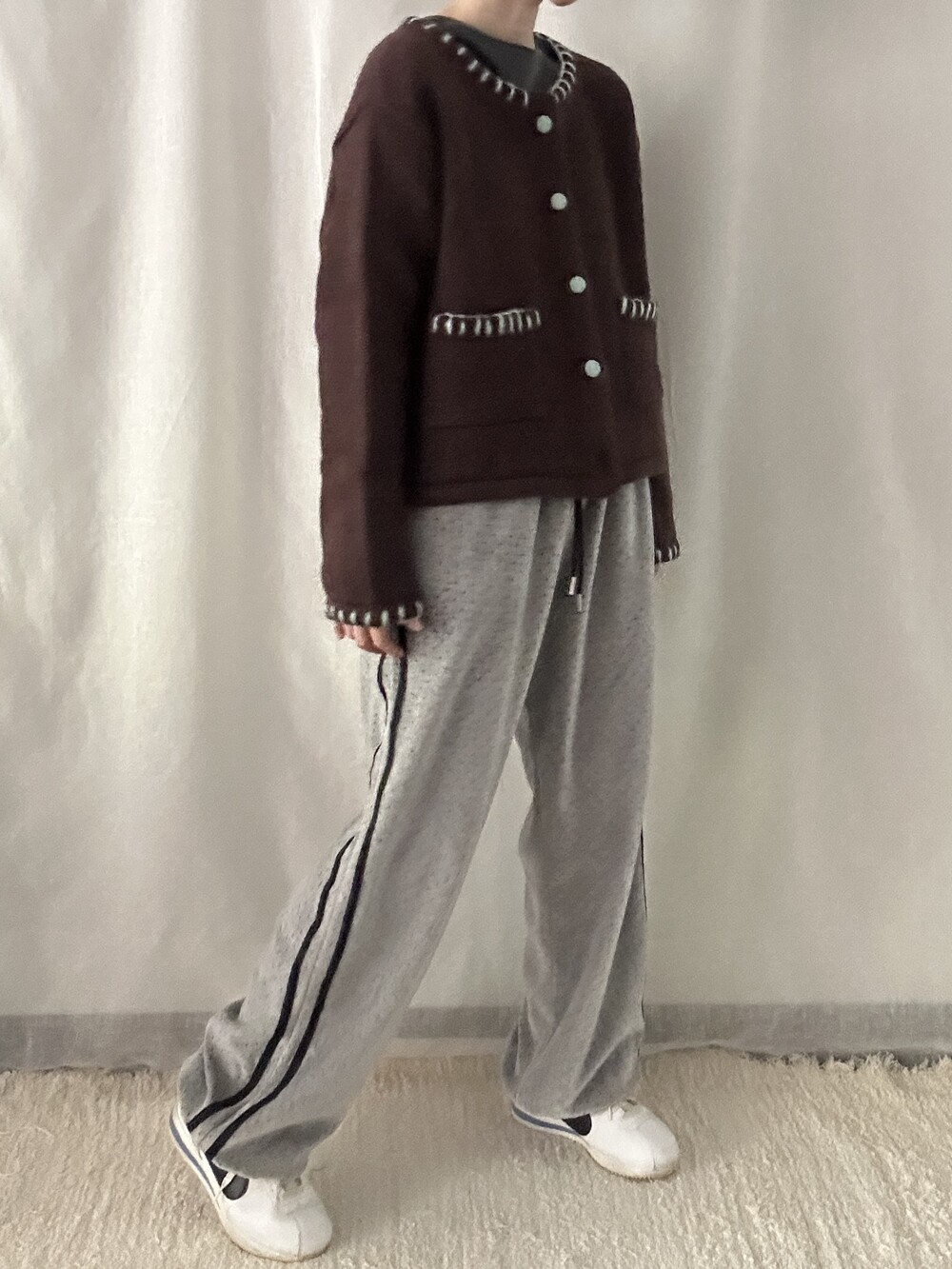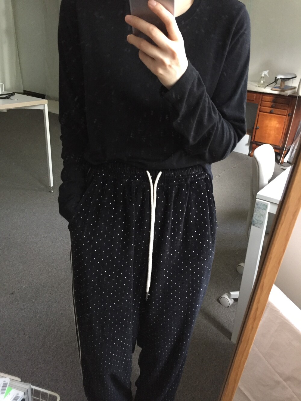 부드러운 벨벳 터치감이 느껴지는 트랙 팬츠예요.