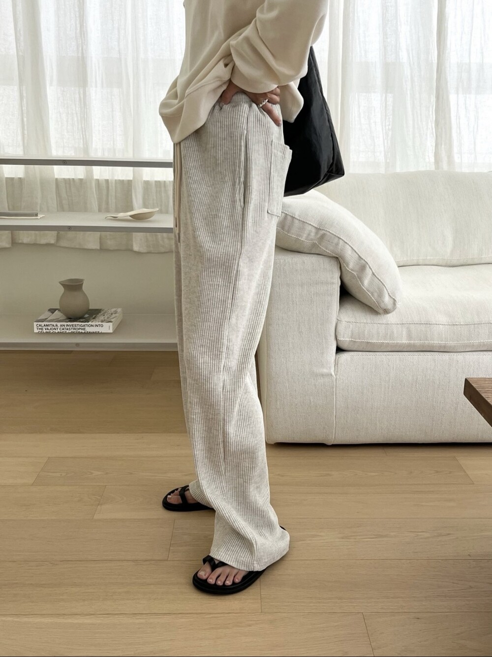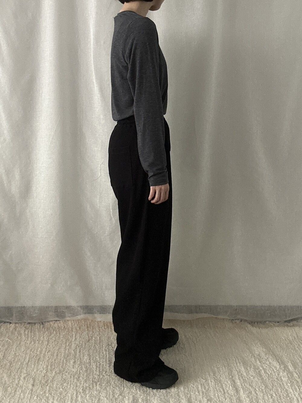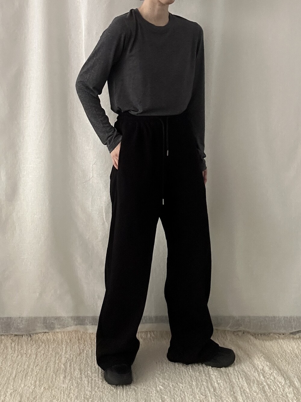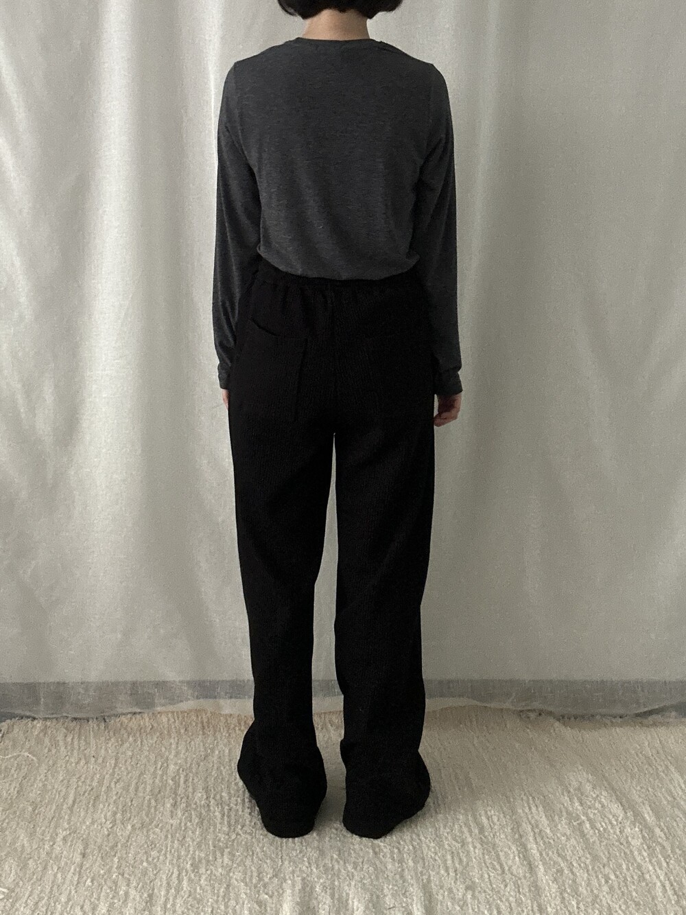 투박하지 않고 유연한 느낌의 조직감에 과하지 않은 와이드 핏이라 편안하면서도 멋스럽게 착용하기 좋습니다. 뒷부분에 포켓이 들어가 힙 부분의 라인이 부담스럽지 않습니다. 티셔츠나 맨투맨과 매치해 트레이닝룩이나 산책룩으로 활용해도 좋고 블라우스, 스웨터와 매치해도 좋아 다양한 무드로 활용 가능합니다.