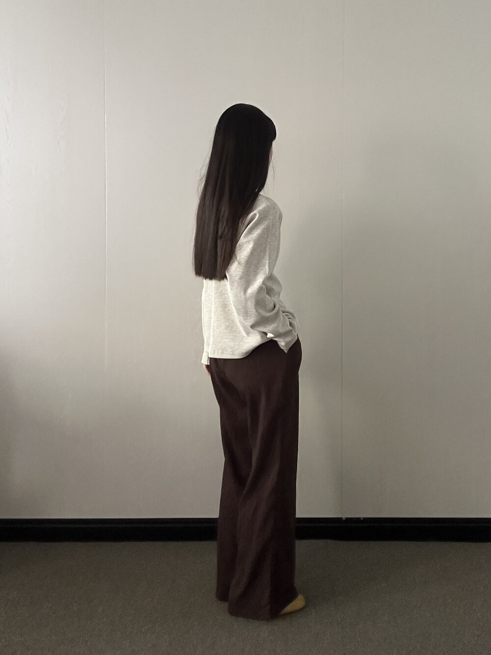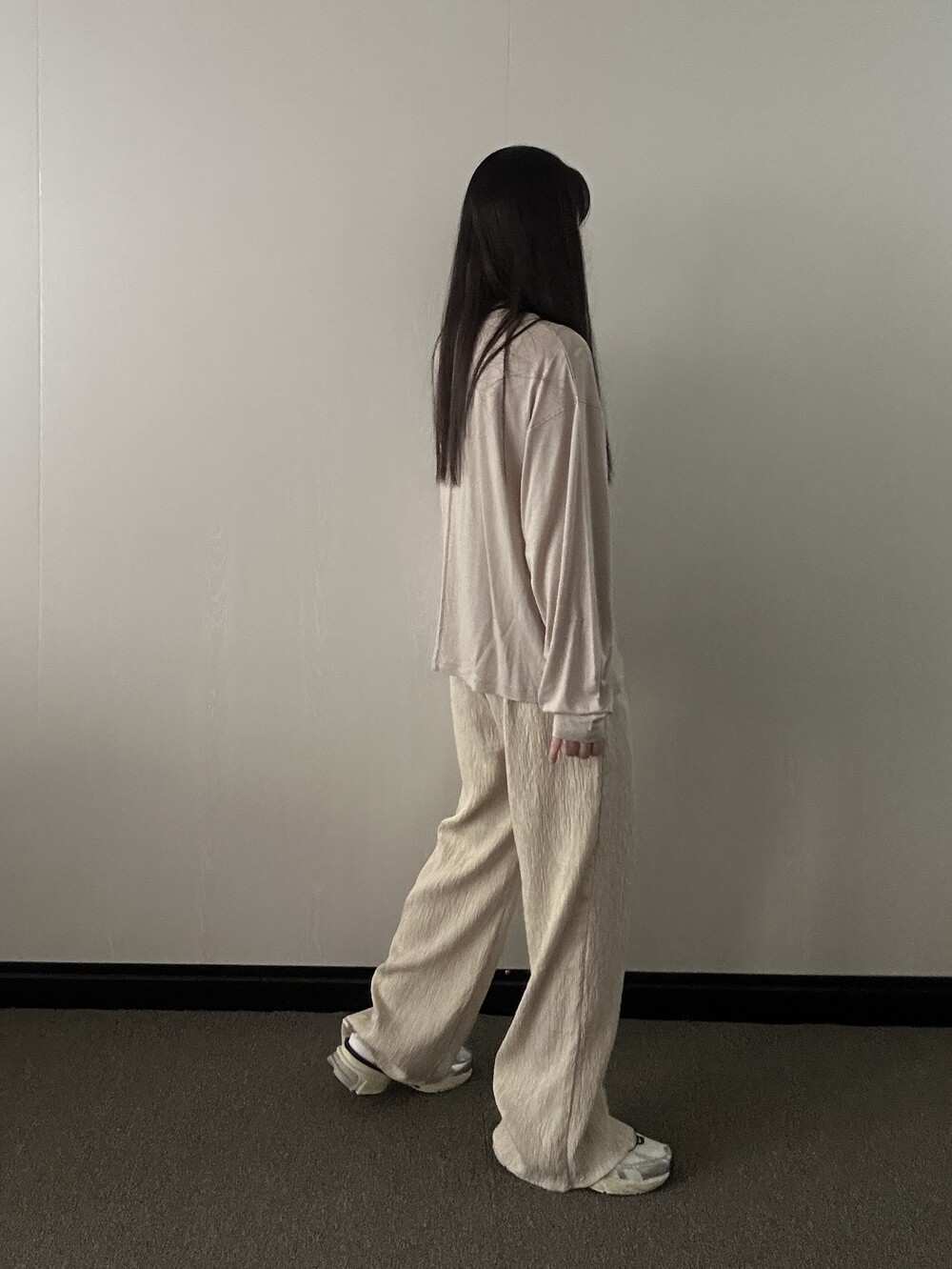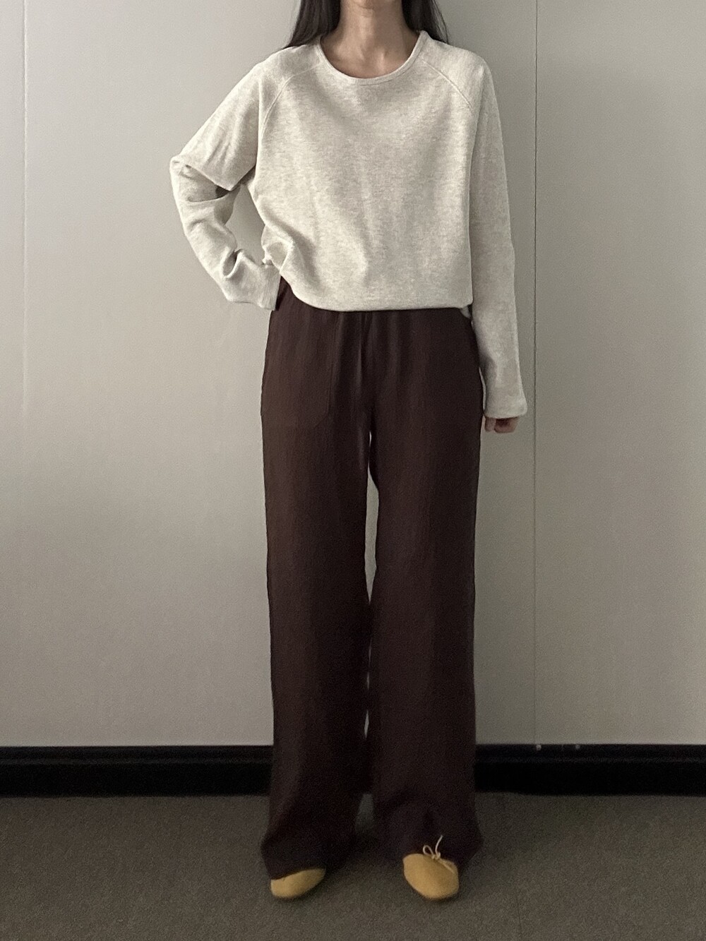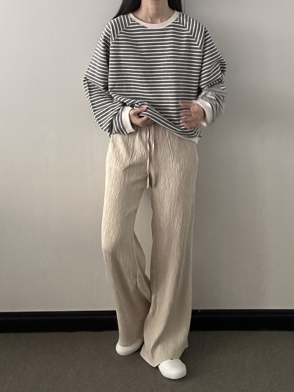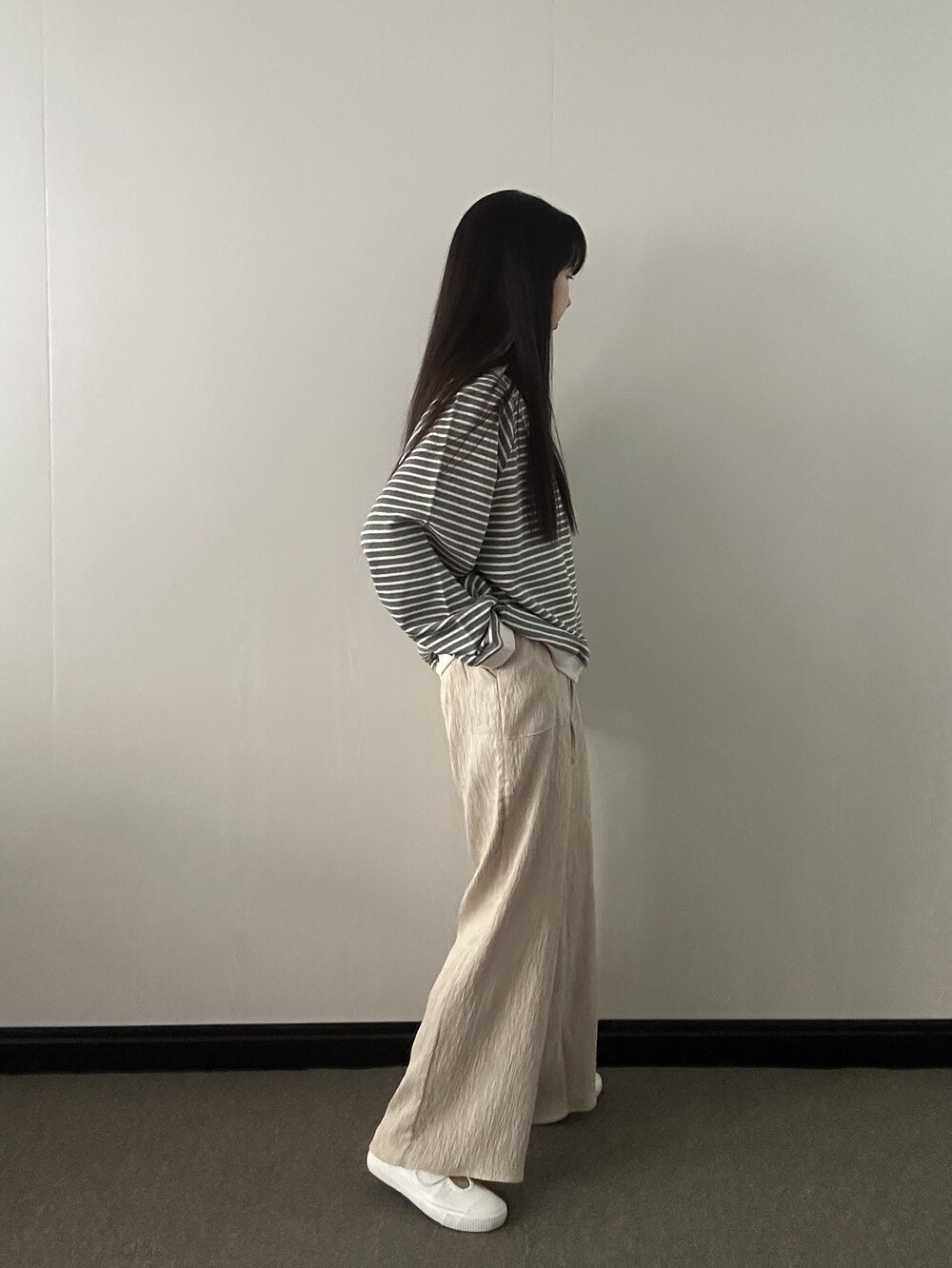 과하지 않은 와이드 롱 팬츠로 롱 셔츠나 원피스와 레이어드해도 좋습니다.