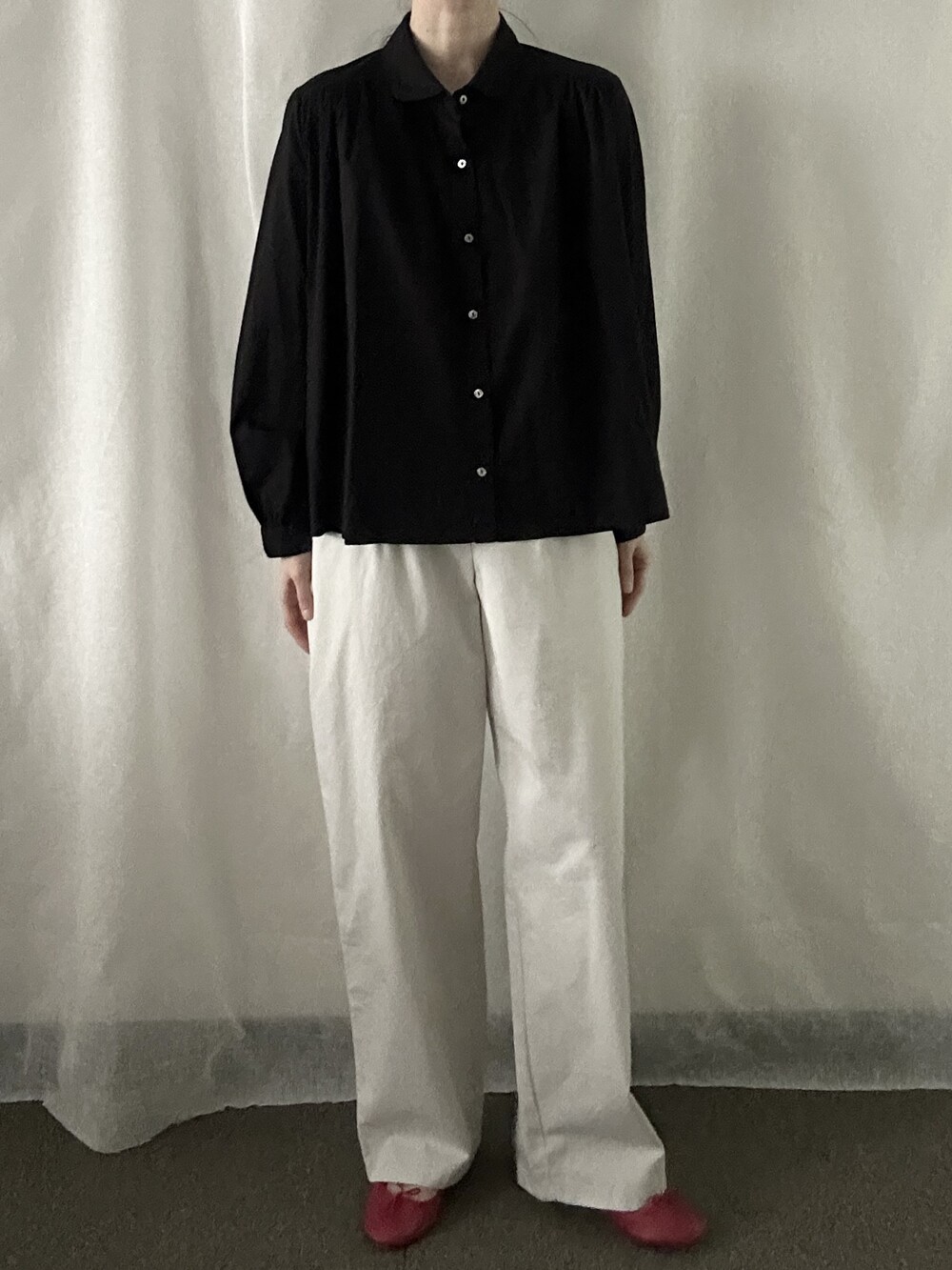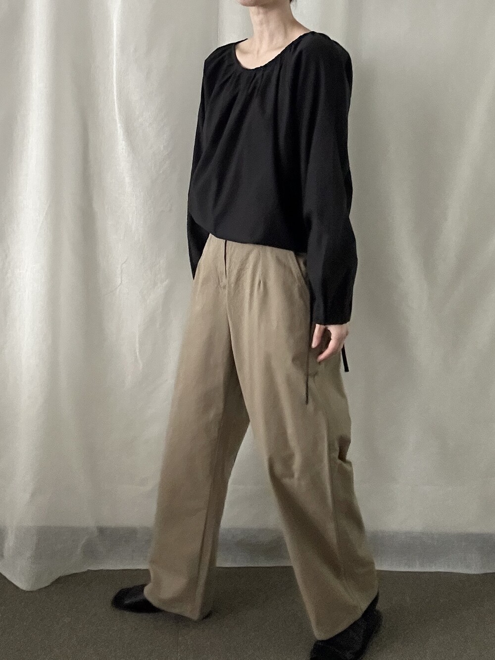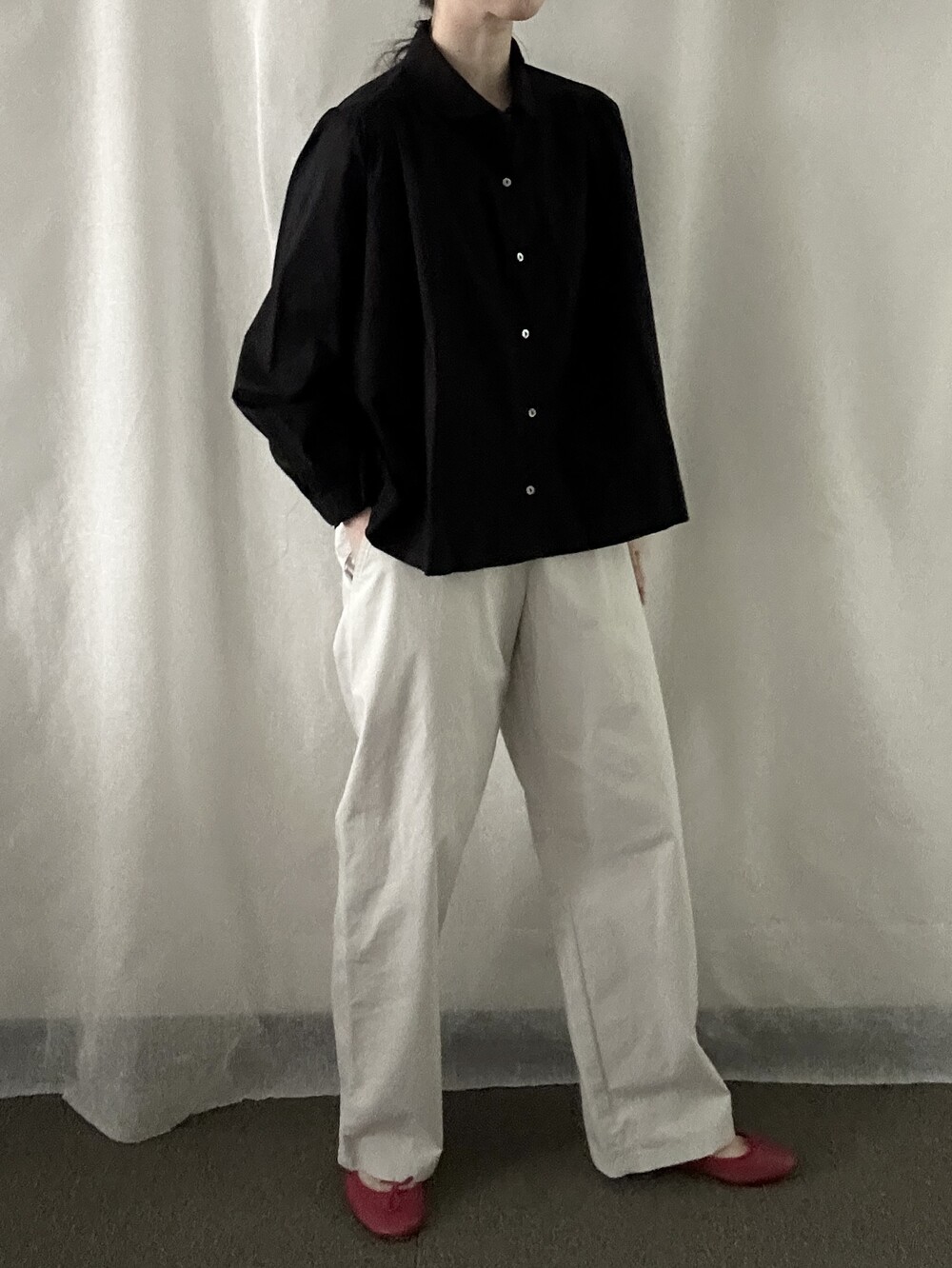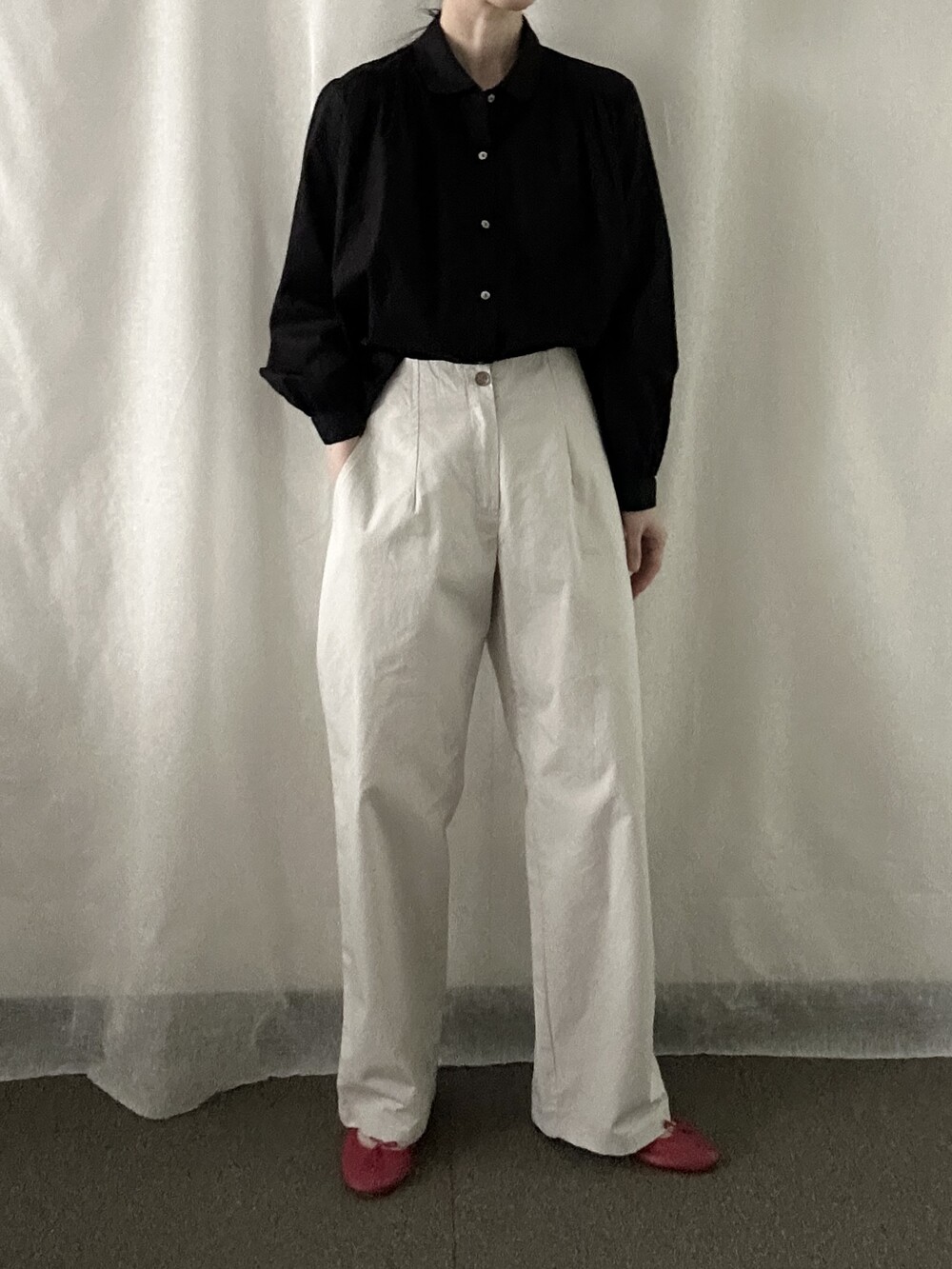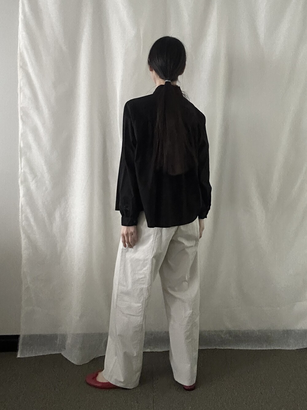 너무 얇지도 도톰하지도 않은 두께감에 빳빳하지 않은 적당히 유연한 소재로 주름마저도 내추럴해보여 마음에 들었던 제품입니다.