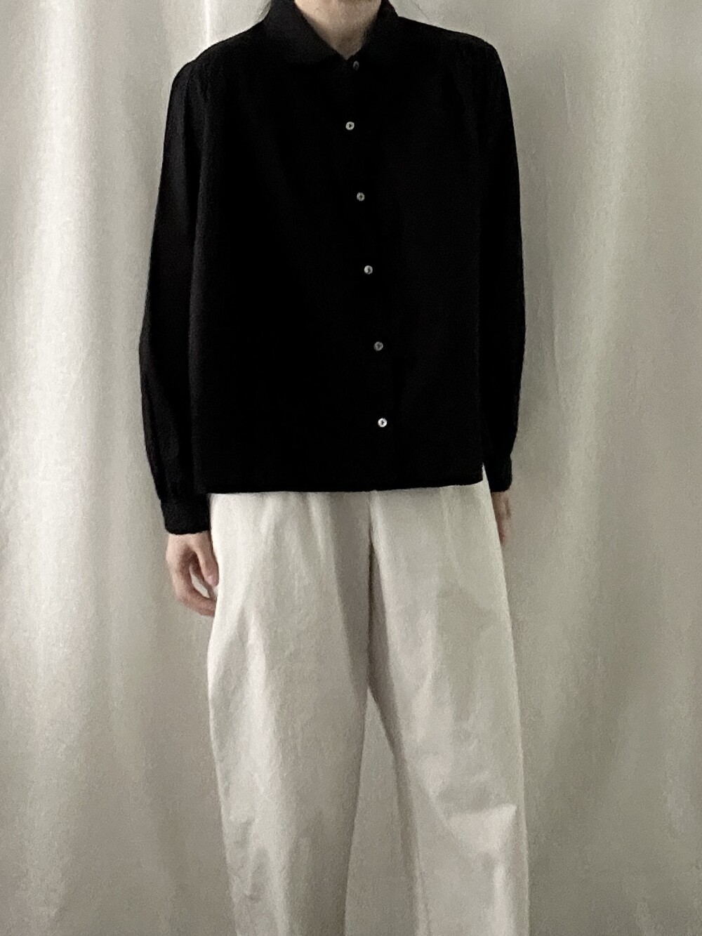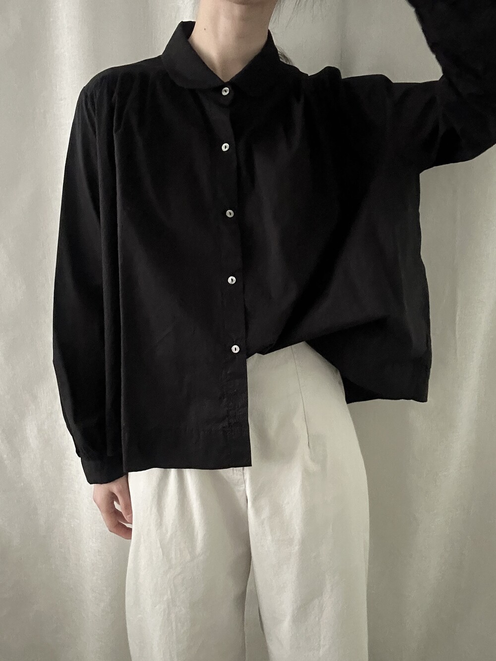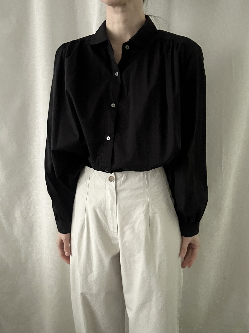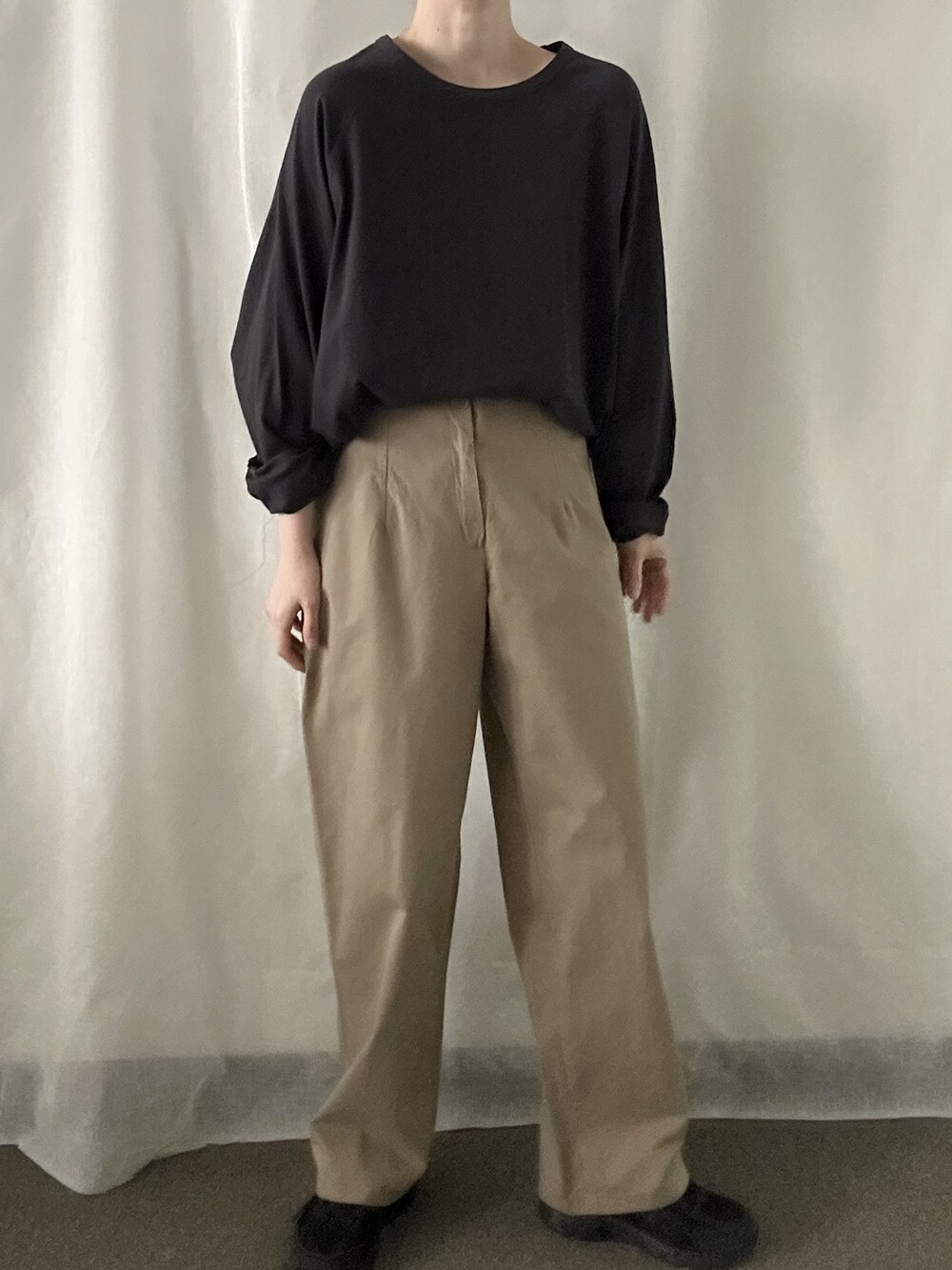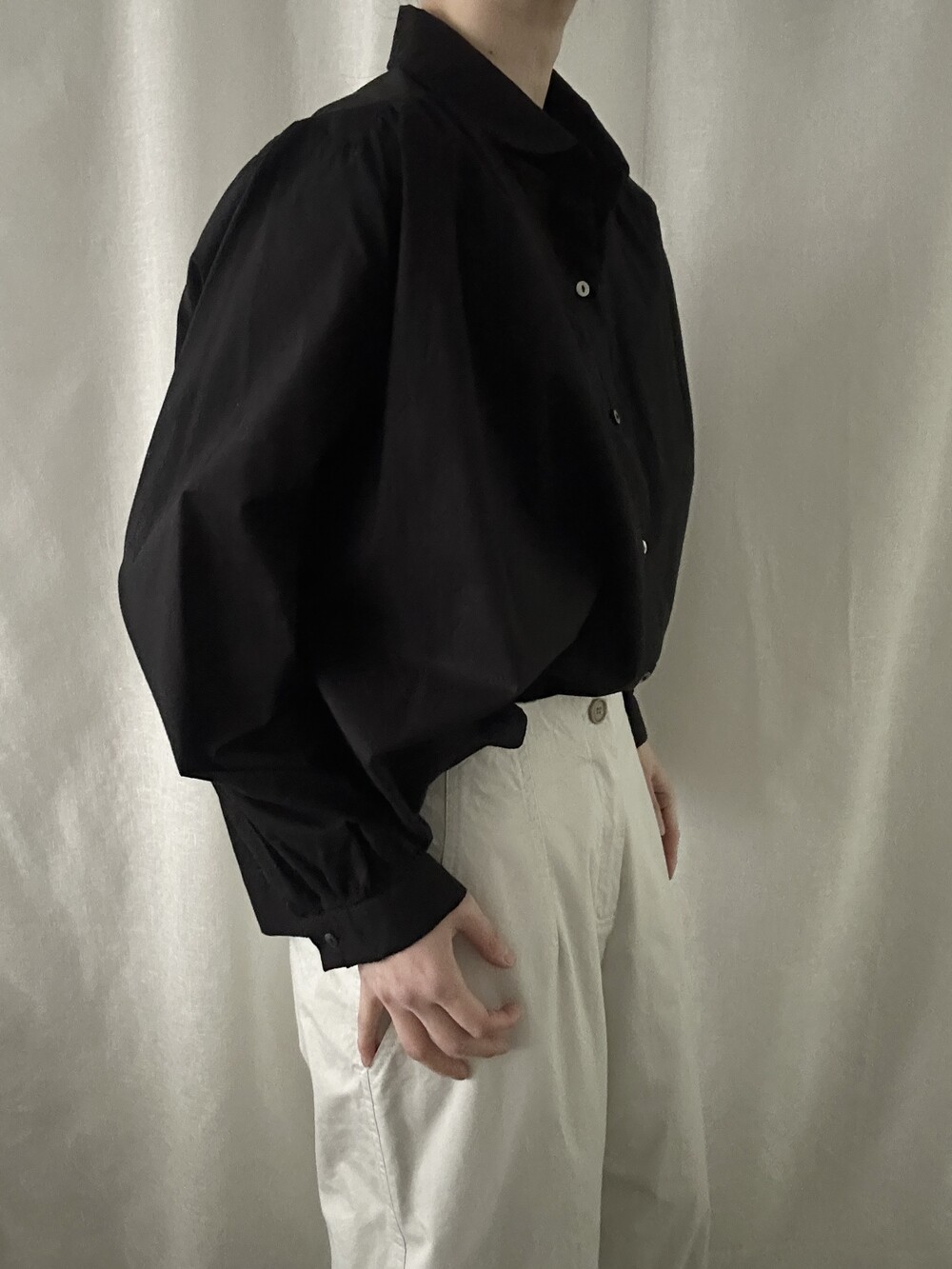 너무 얇지도 도톰하지도 않은 두께감에 빳빳하지 않은 적당히 유연한 소재로 주름마저도 내추럴해보여 마음에 들었던 제품입니다.