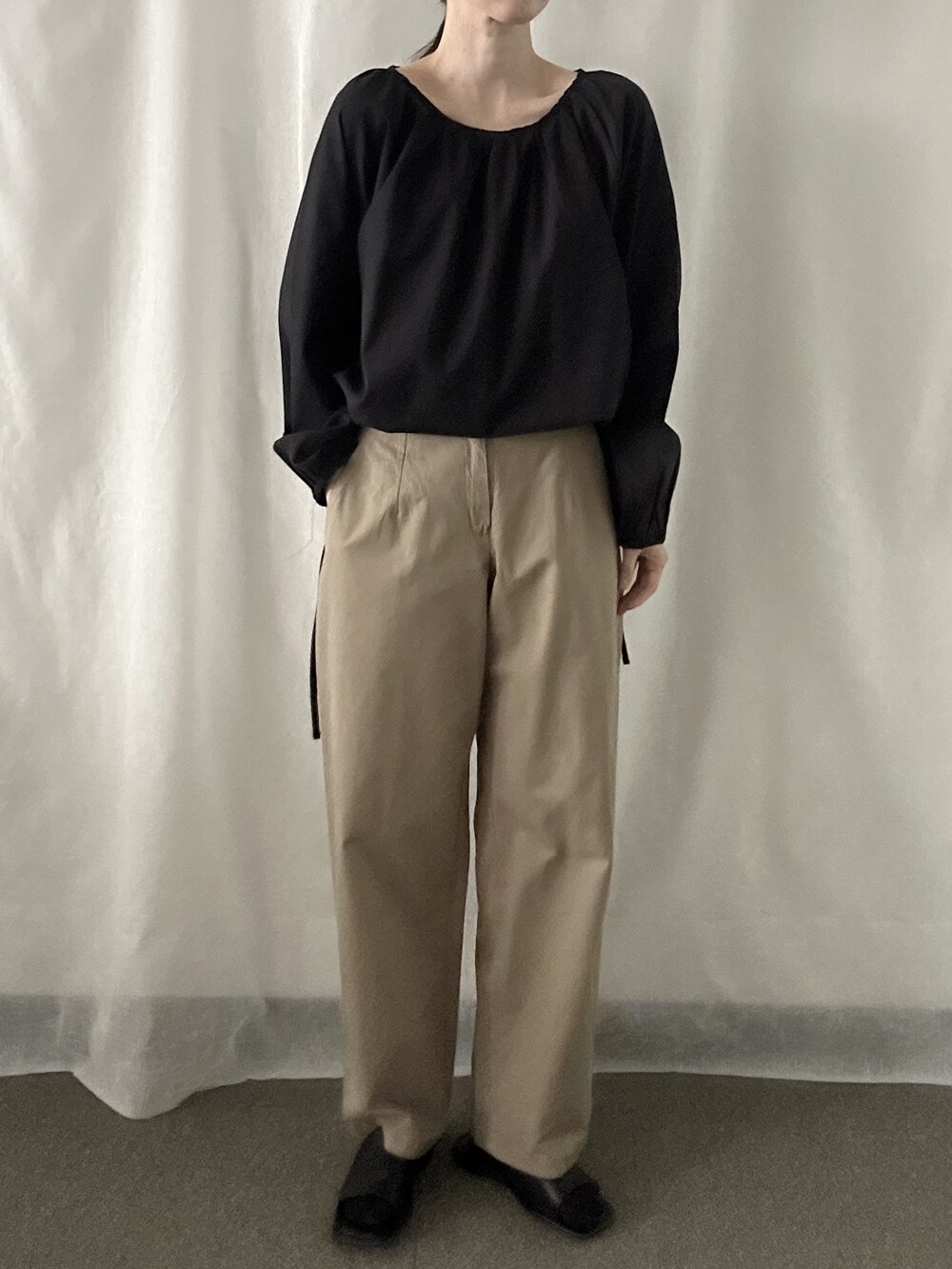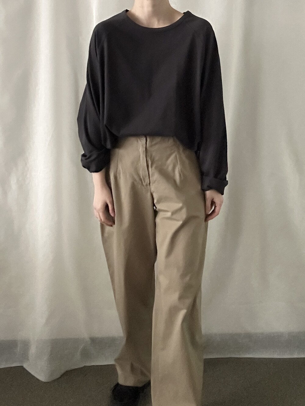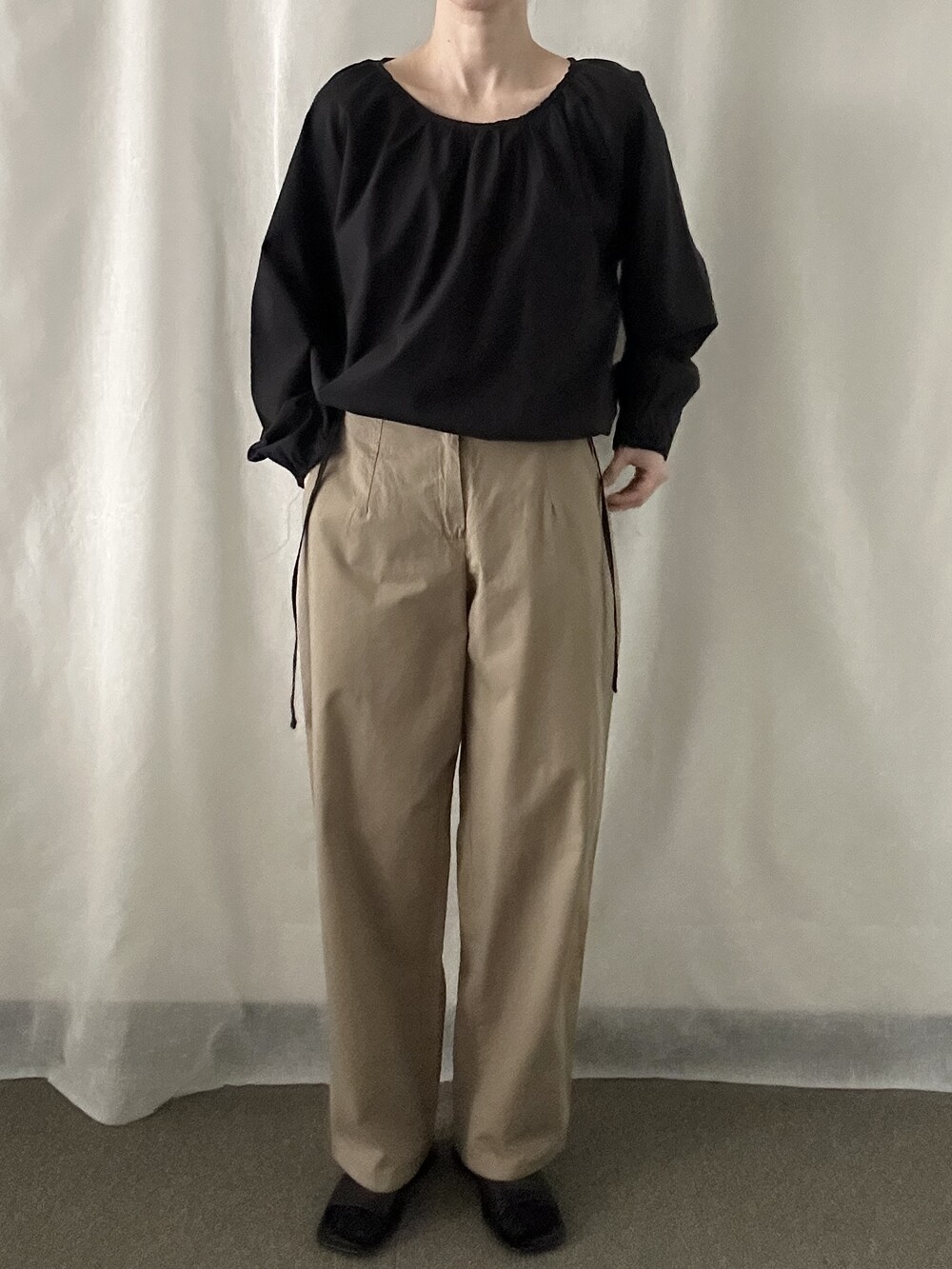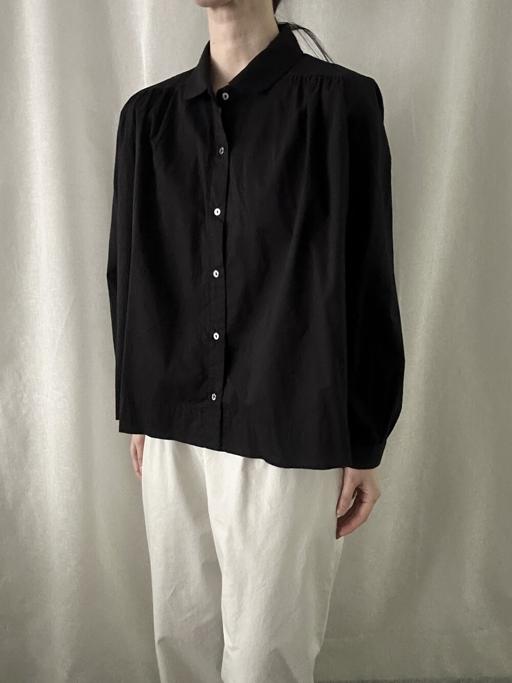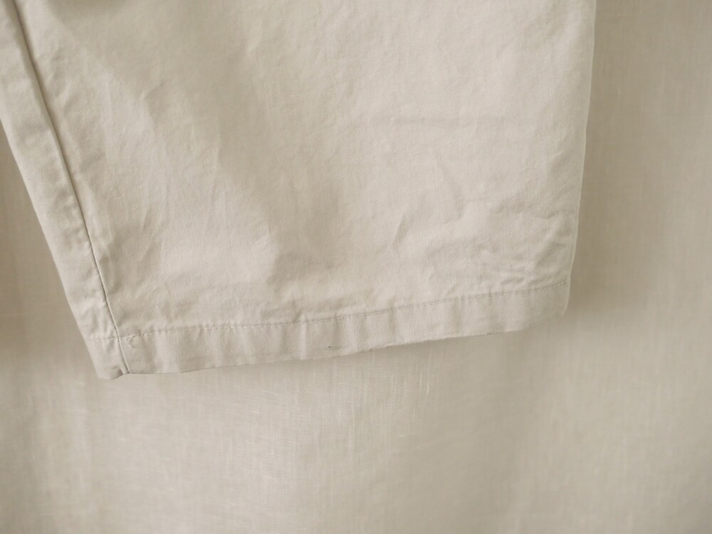 너무 얇지도 도톰하지도 않은 두께감에 빳빳하지 않은 적당히 유연한 소재로 주름마저도 내추럴해보여 마음에 들었던 제품입니다.