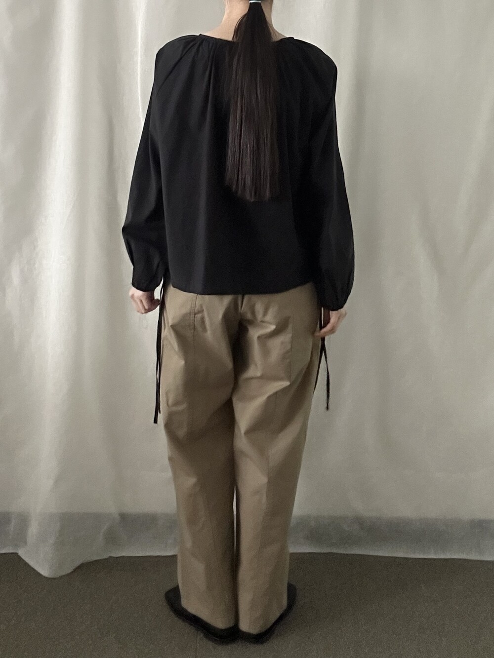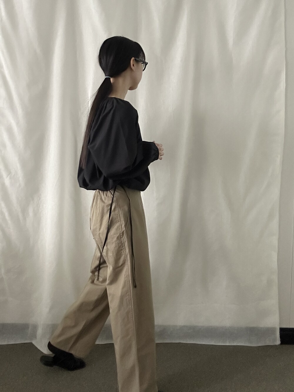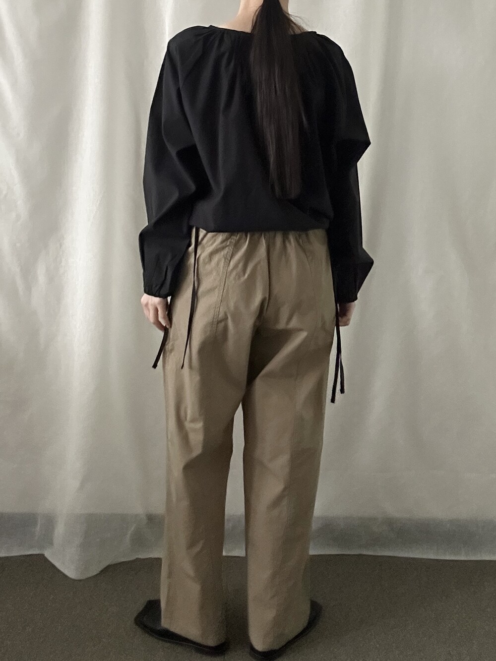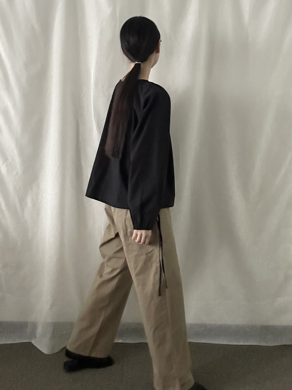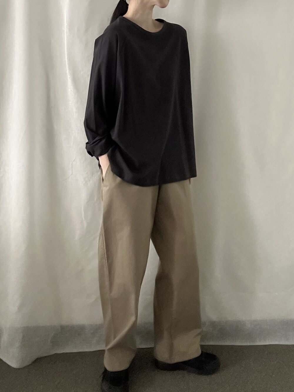 너무 얇지도 도톰하지도 않은 두께감에 빳빳하지 않은 적당히 유연한 소재로 주름마저도 내추럴해보여 마음에 들었던 제품입니다.