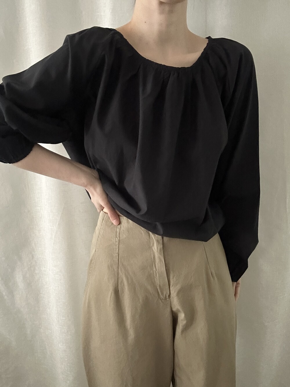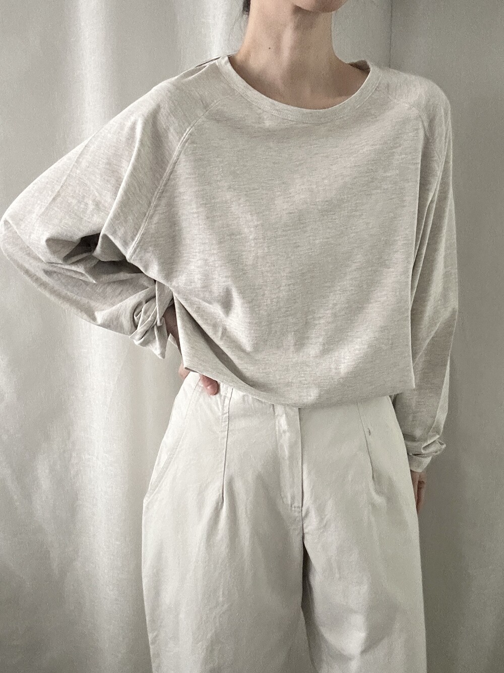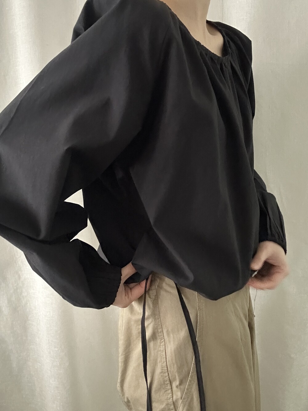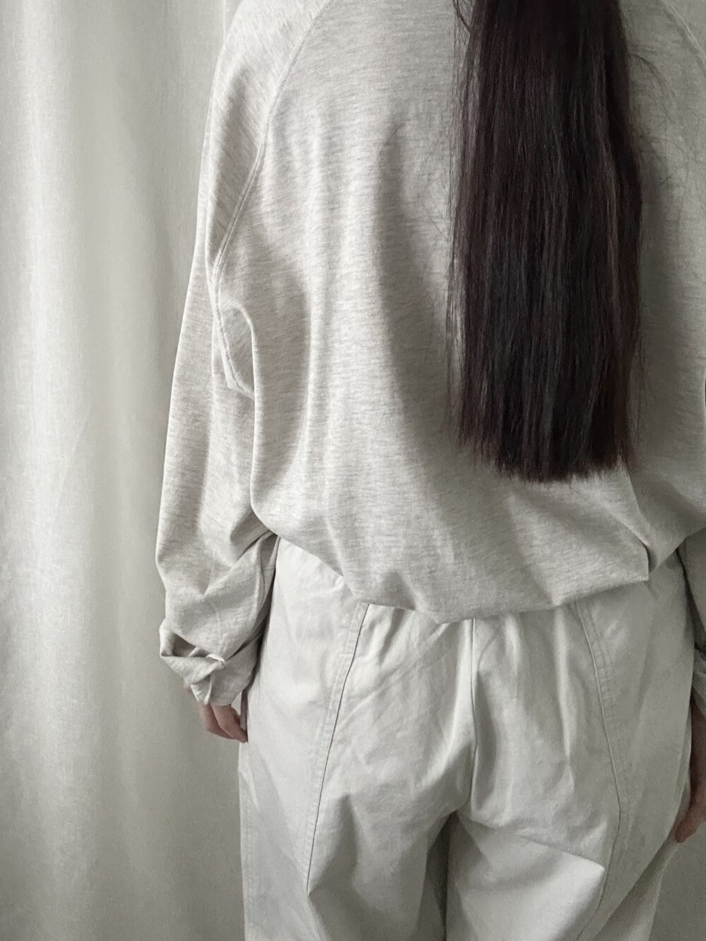 너무 얇지도 도톰하지도 않은 두께감에 빳빳하지 않은 적당히 유연한 소재로 주름마저도 내추럴해보여 마음에 들었던 제품입니다.