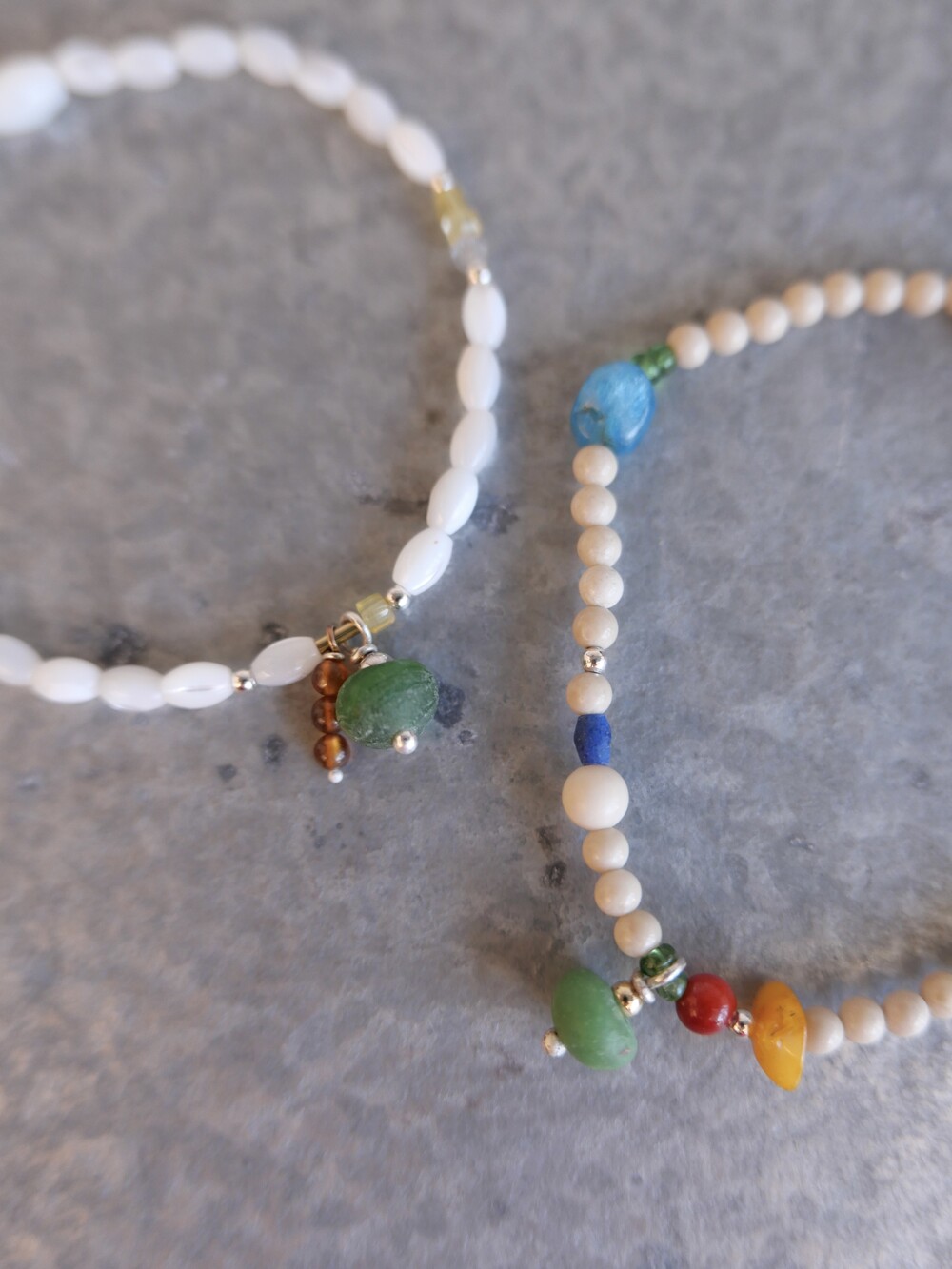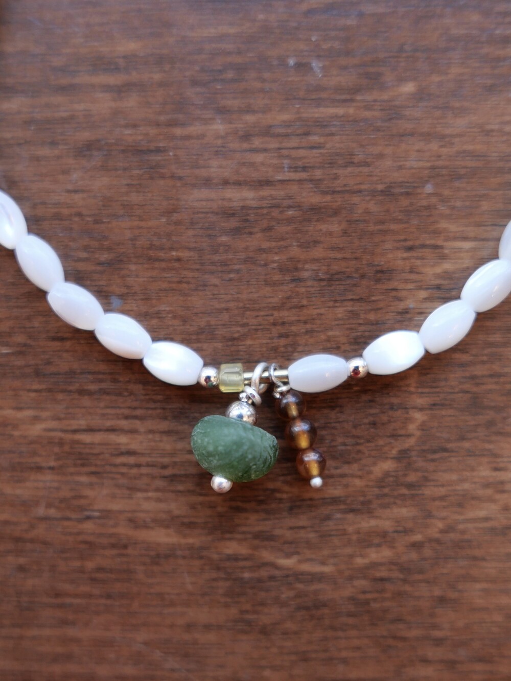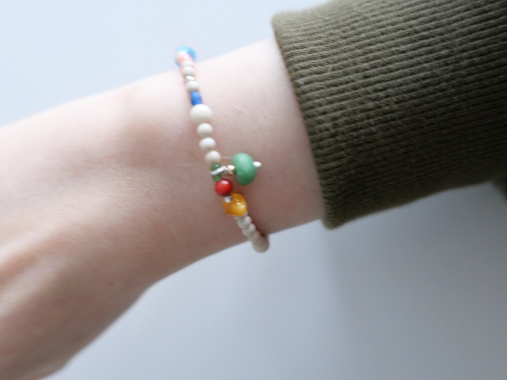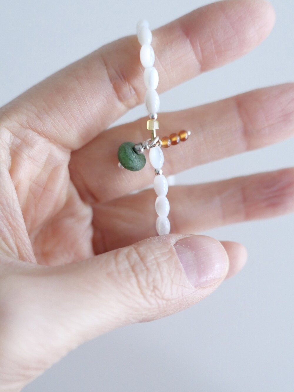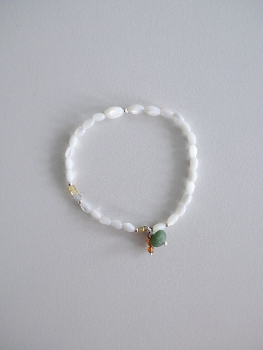 작고 섬세한 우윳빛 자개들 사이로 초록색 글라스와 가넷이 작게 흔들리는 모습이 잔잔하고 아름다워 가만히 들여다보게 됩니다. 조용한 듯 분명한 존재감이 있는 팔찌입니다.