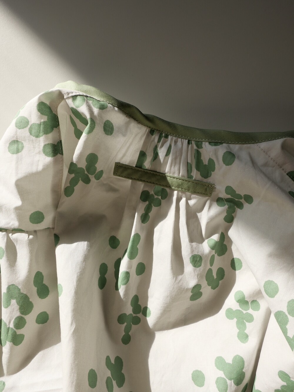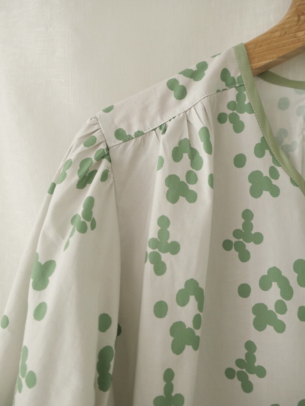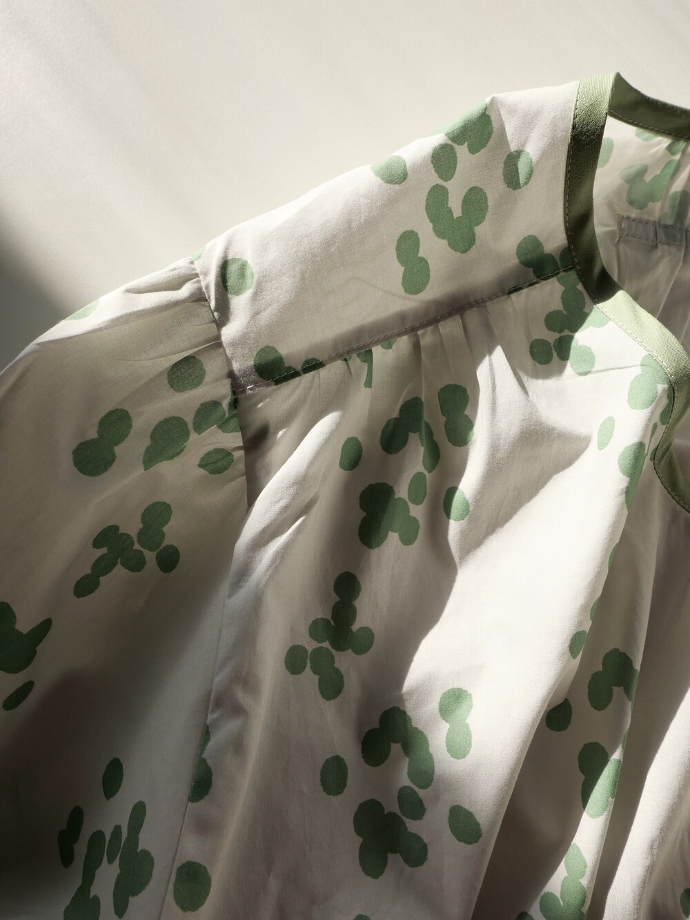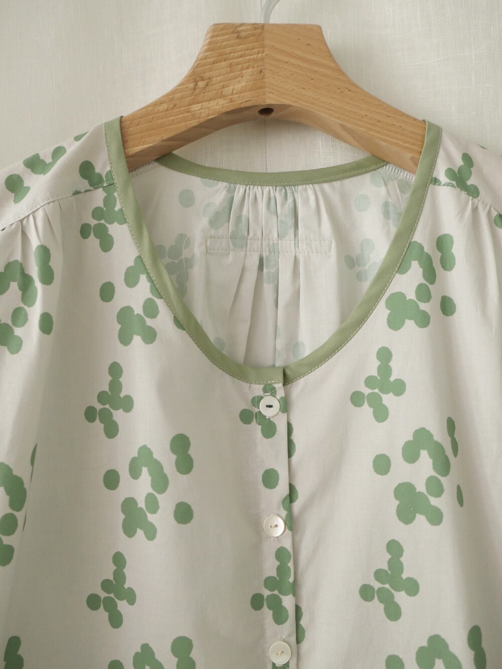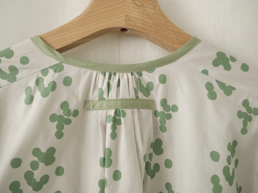 넥 라인은 메인 도트 컬러와 잘 어우러지는 세이지 민트 컬러로 바인딩하고 같은 컬러로 뒷 라인에 셔링을 눌러주는 테이핑을 달아주었습니다.