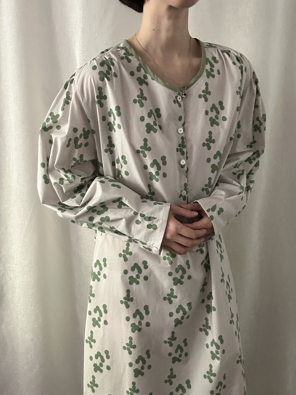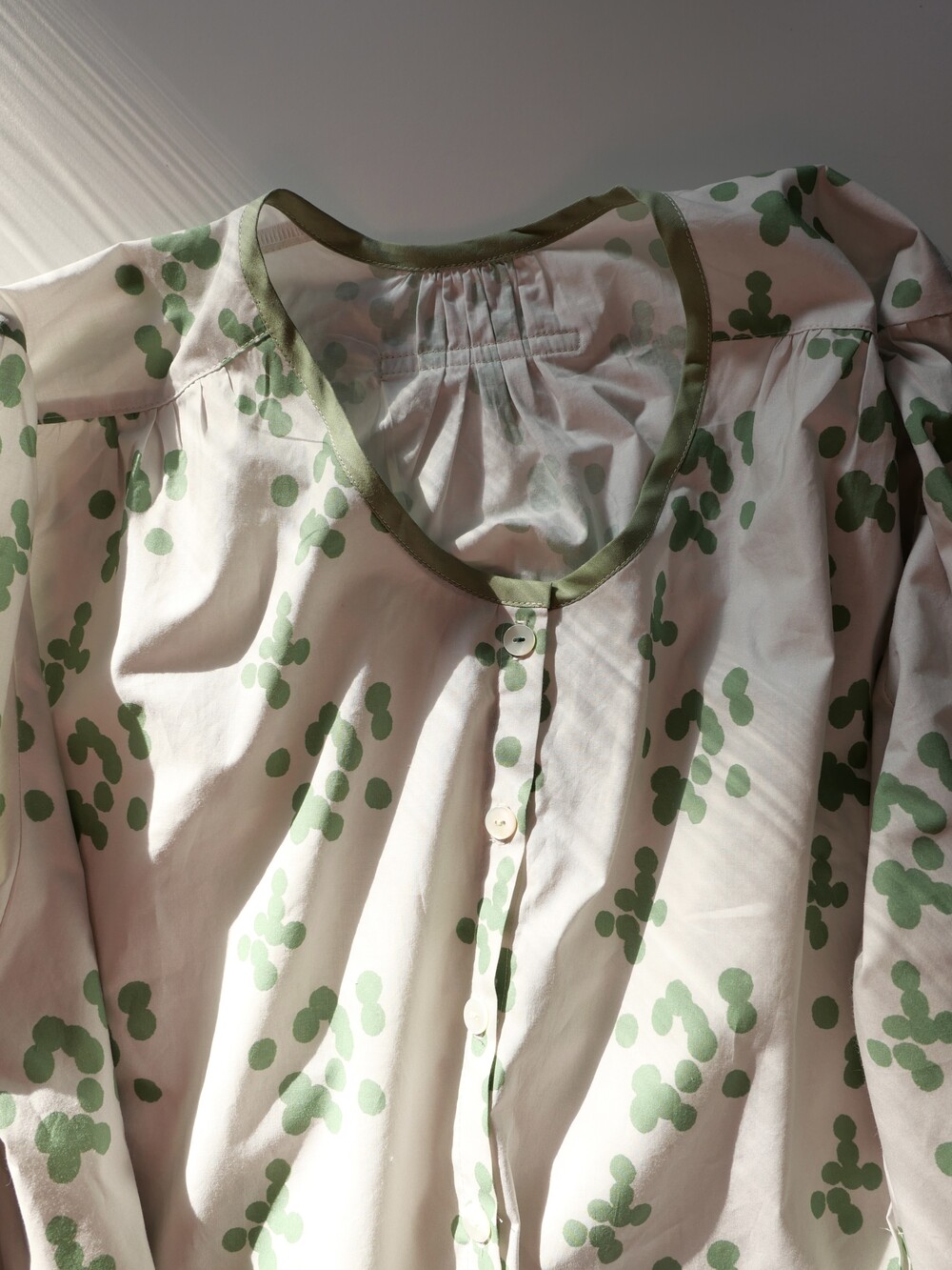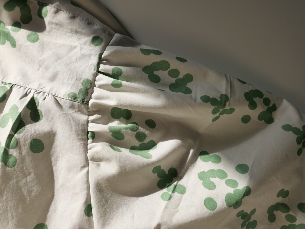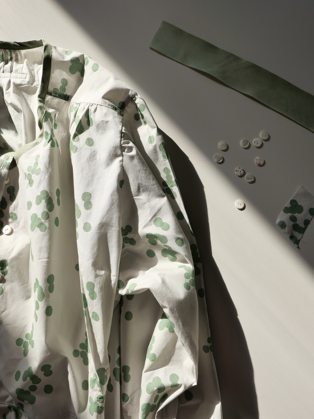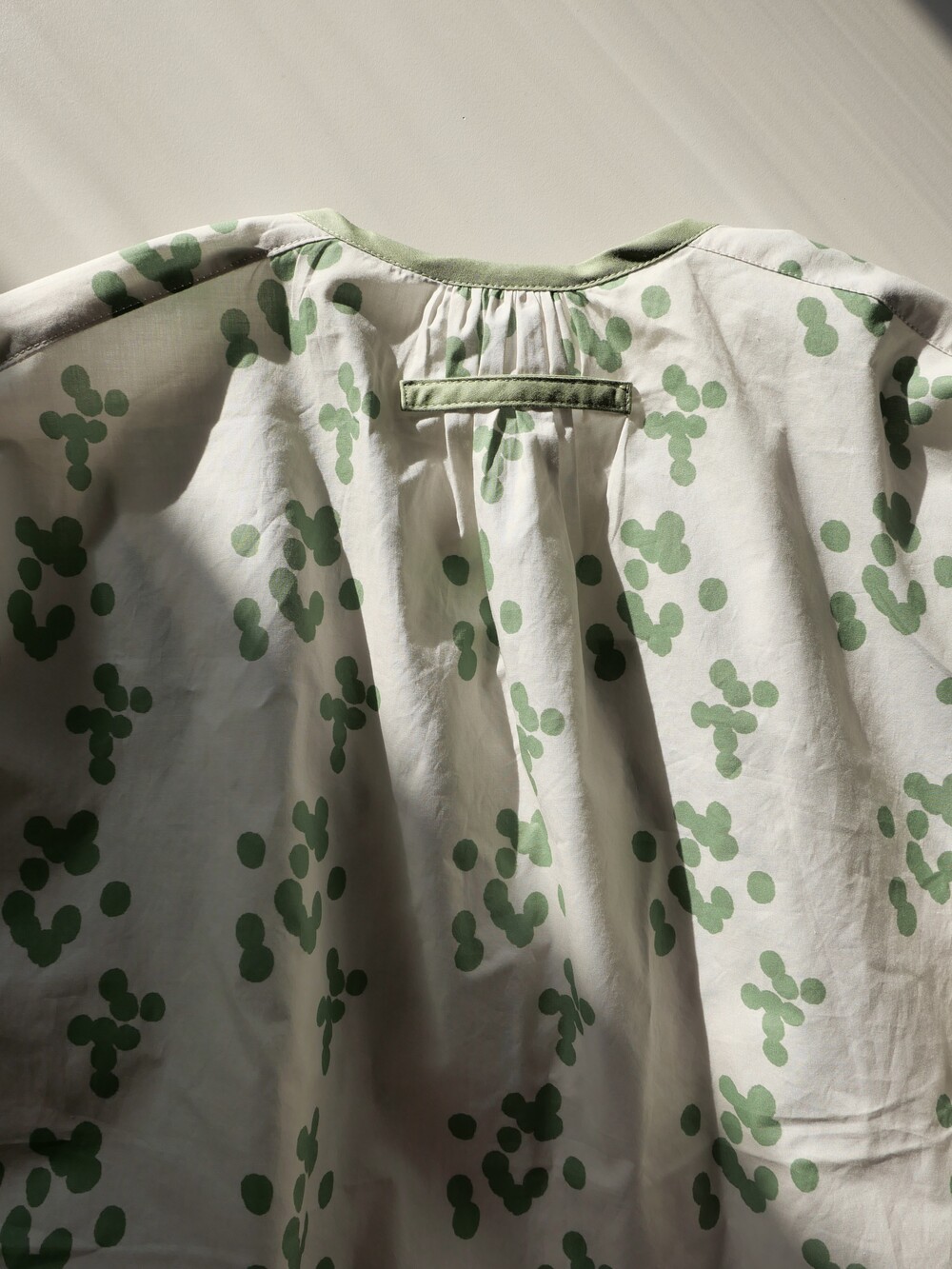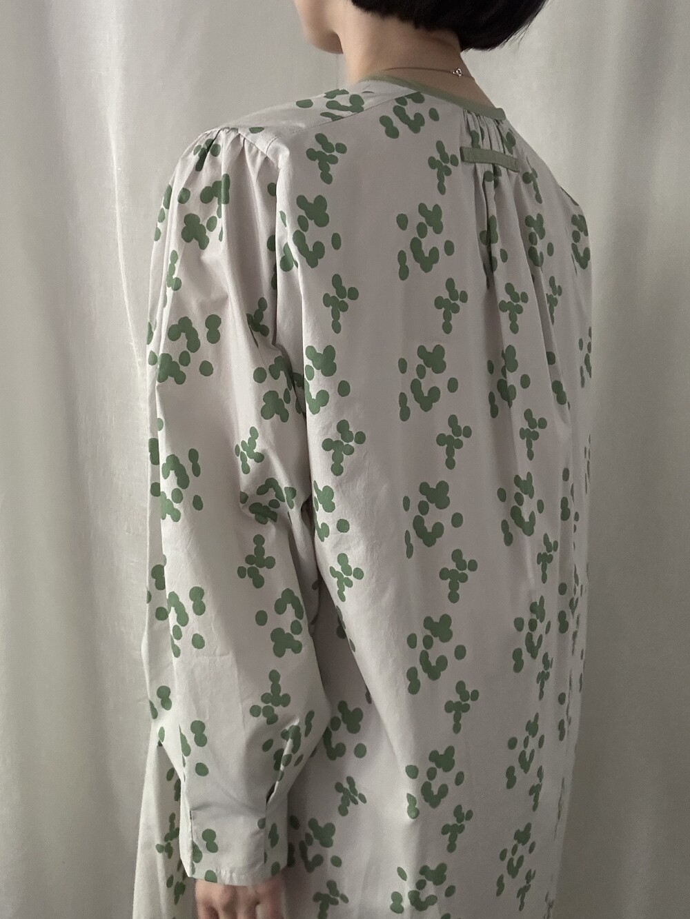 넥 라인은 메인 도트 컬러와 잘 어우러지는 세이지 민트 컬러로 바인딩하고 같은 컬러로 뒷 라인에 셔링을 눌러주는 테이핑을 달아주었습니다.