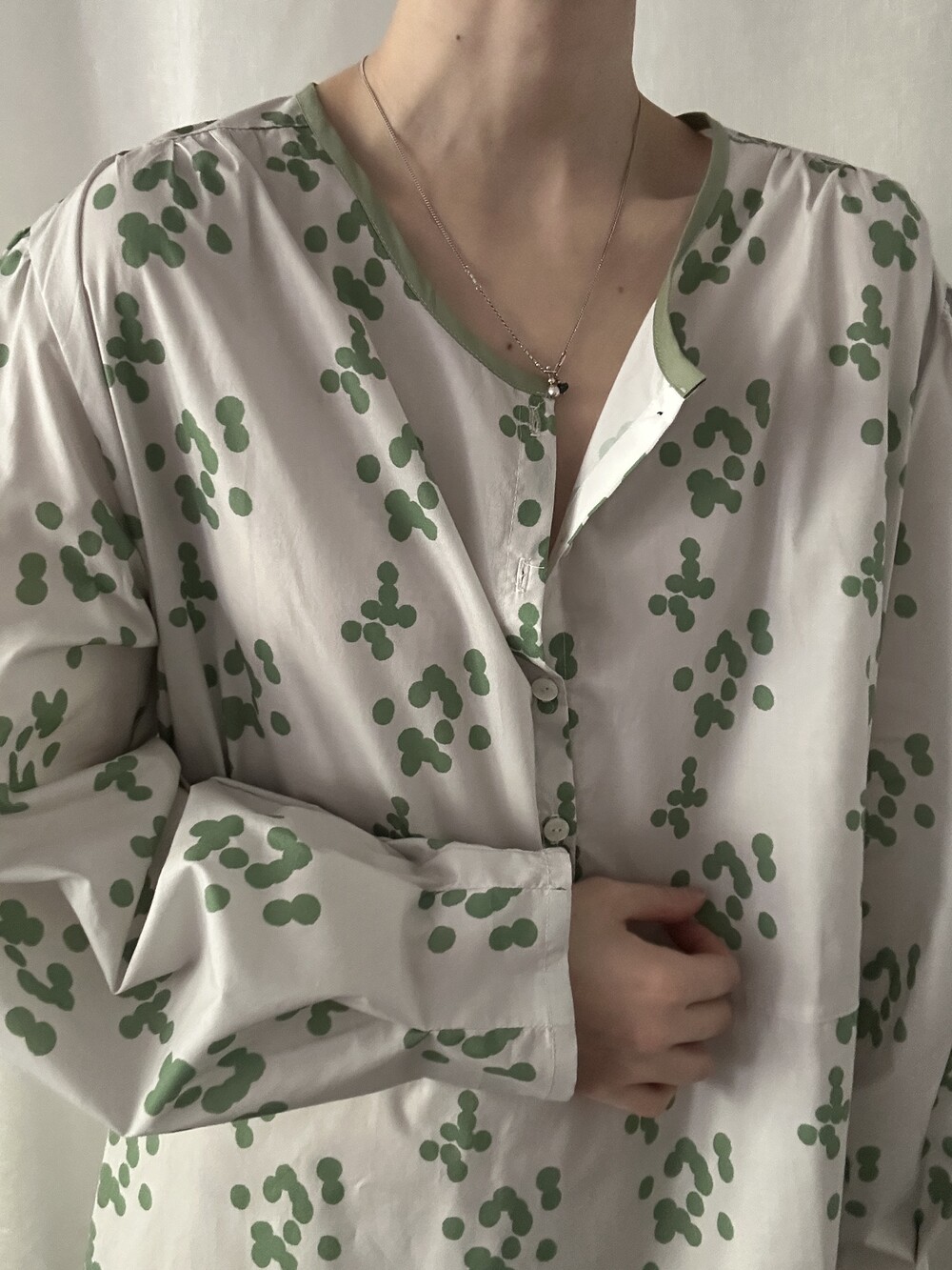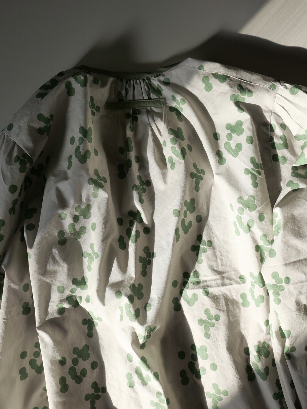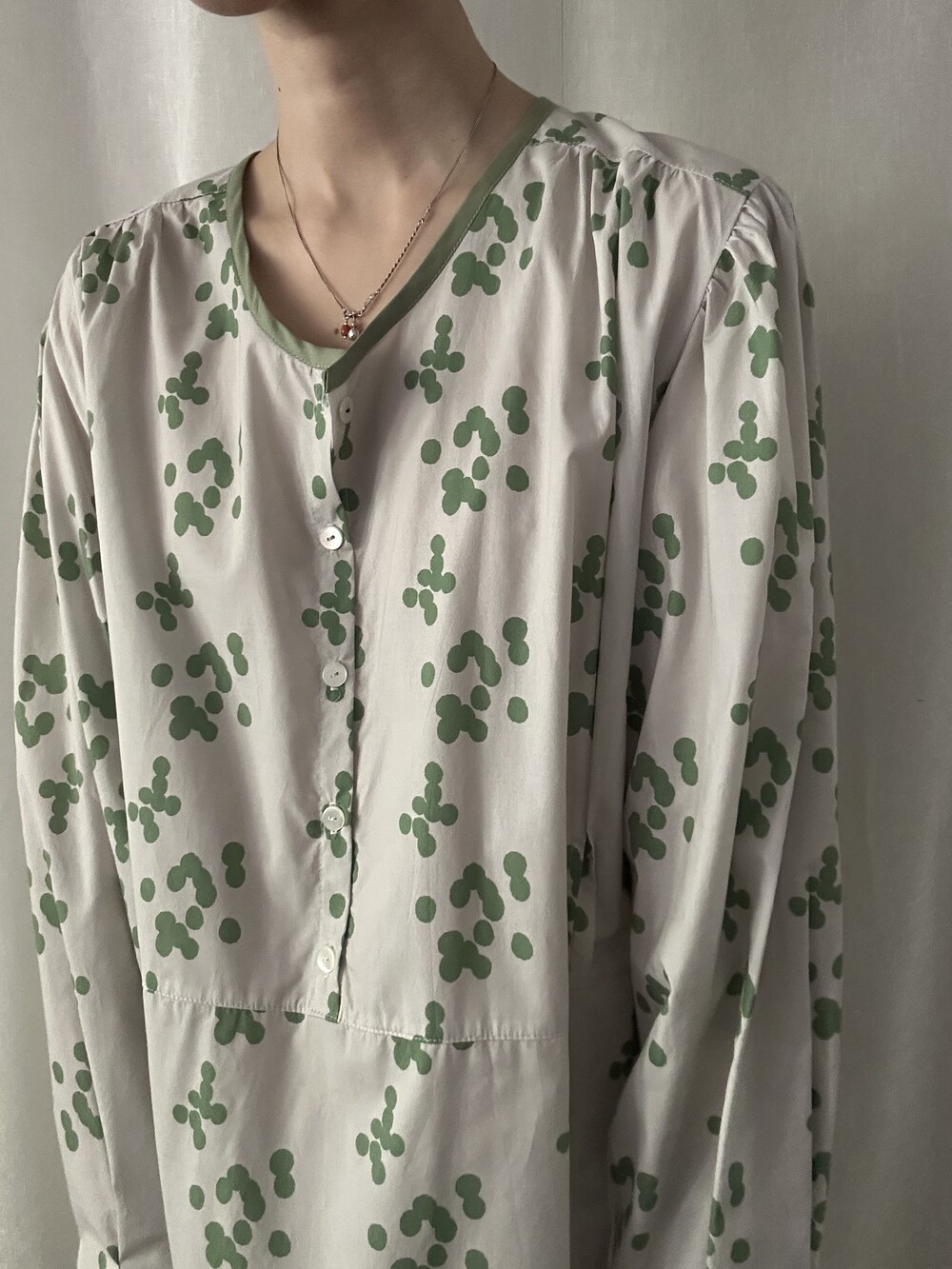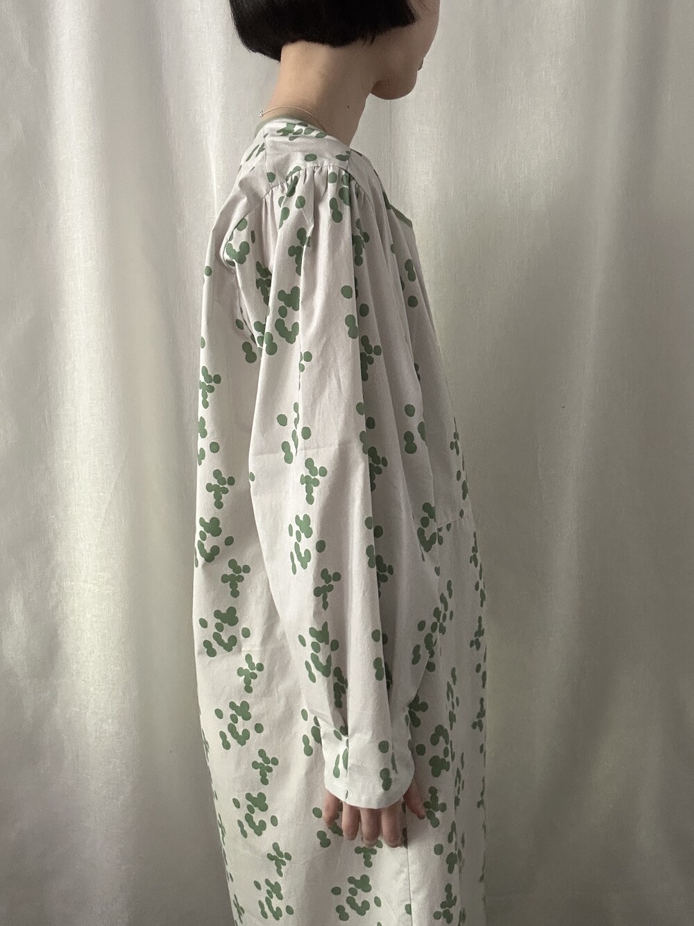 넥 라인은 메인 도트 컬러와 잘 어우러지는 세이지 민트 컬러로 바인딩하고 같은 컬러로 뒷 라인에 셔링을 눌러주는 테이핑을 달아주었습니다.