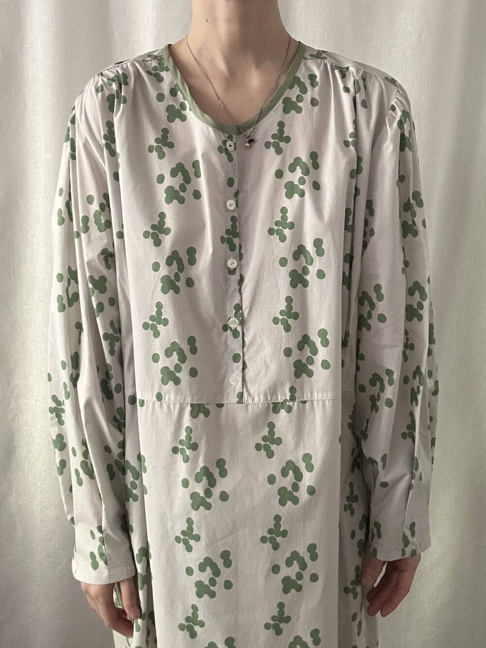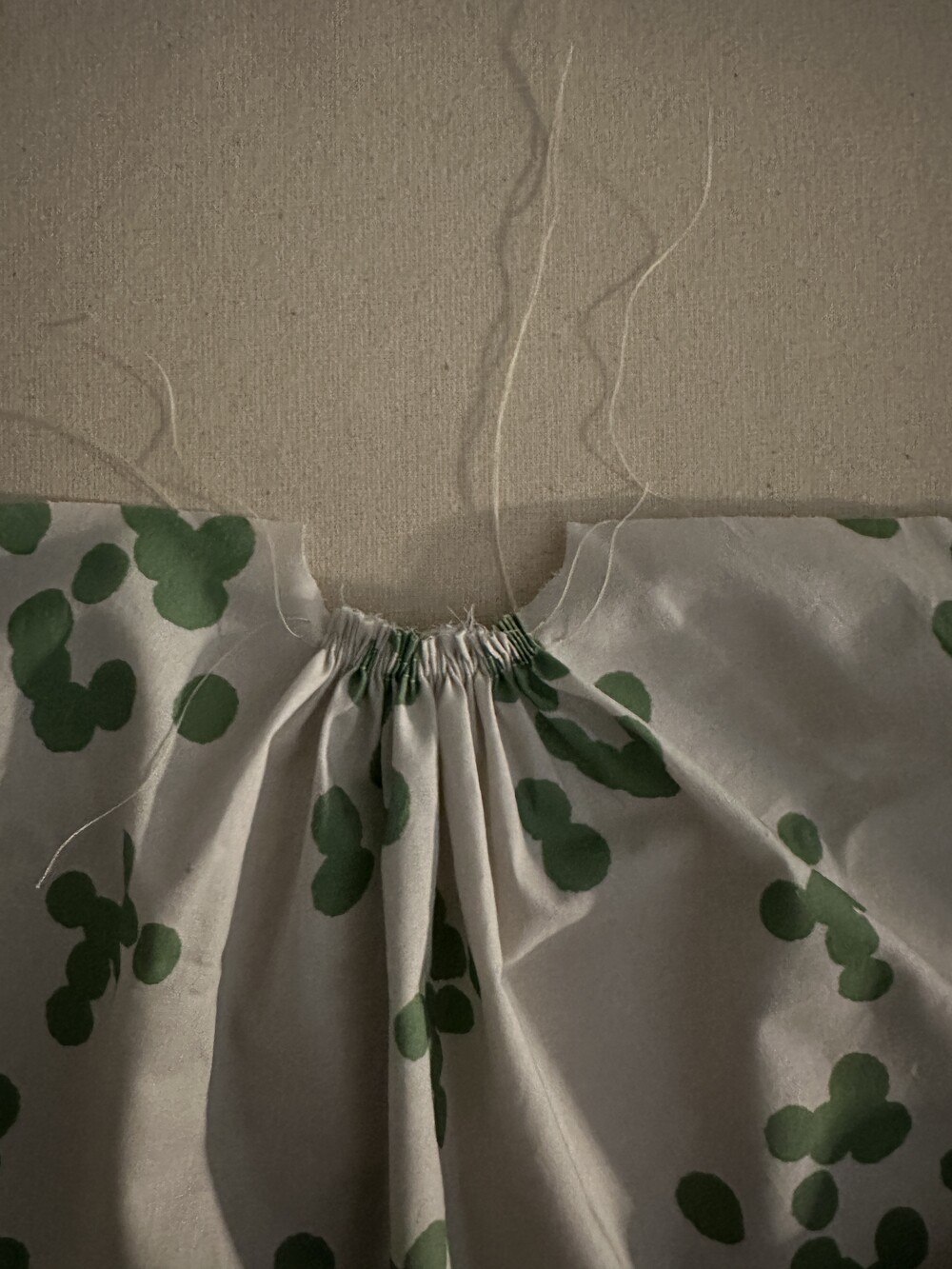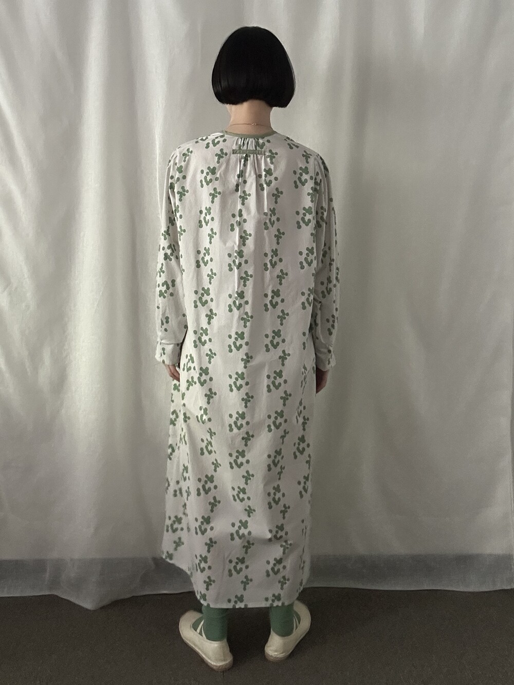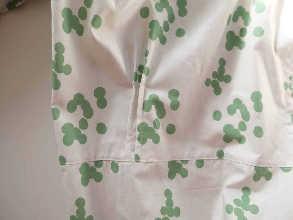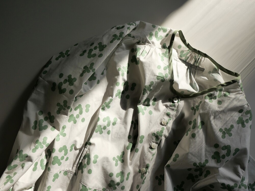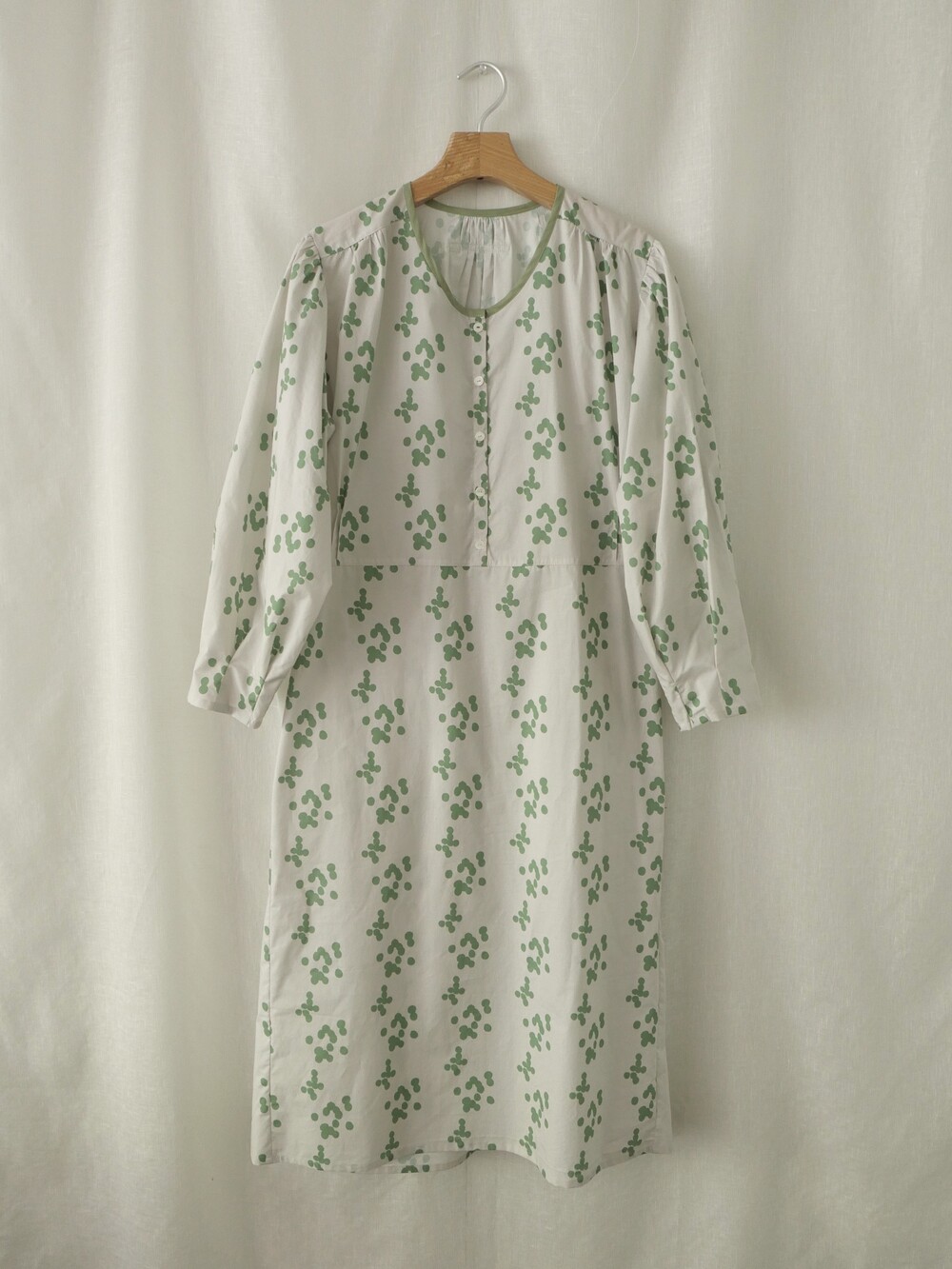 넥 라인은 메인 도트 컬러와 잘 어우러지는 세이지 민트 컬러로 바인딩하고 같은 컬러로 뒷 라인에 셔링을 눌러주는 테이핑을 달아주었습니다.