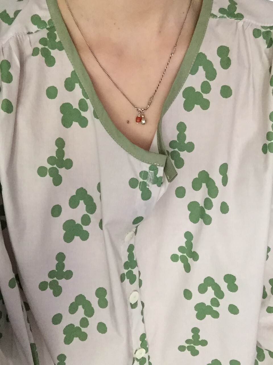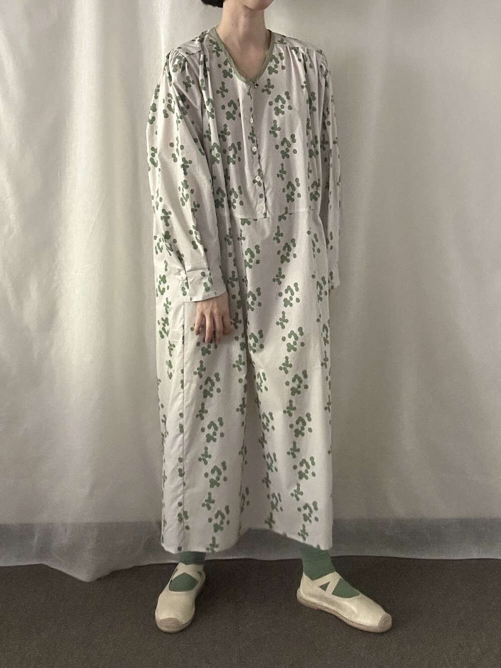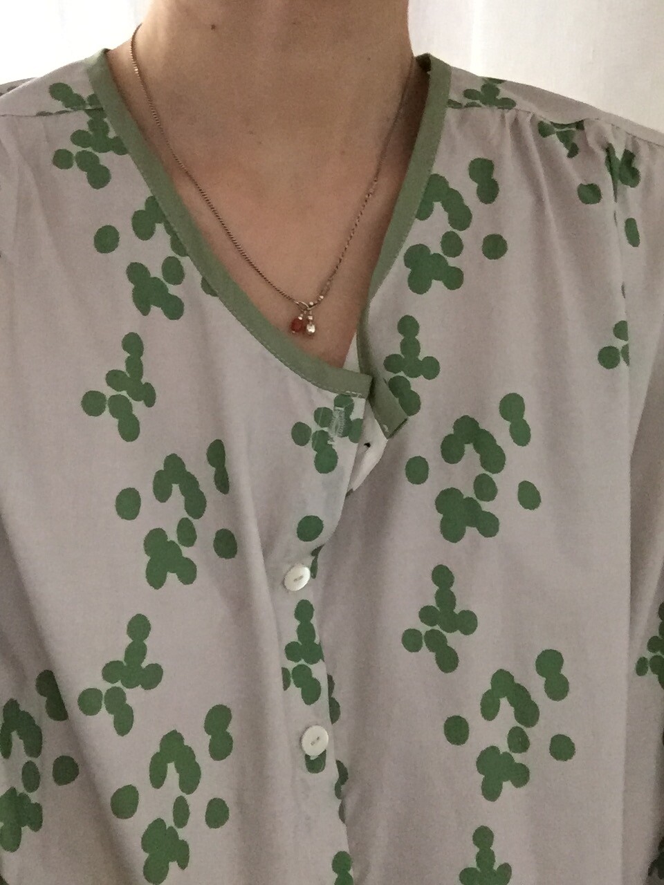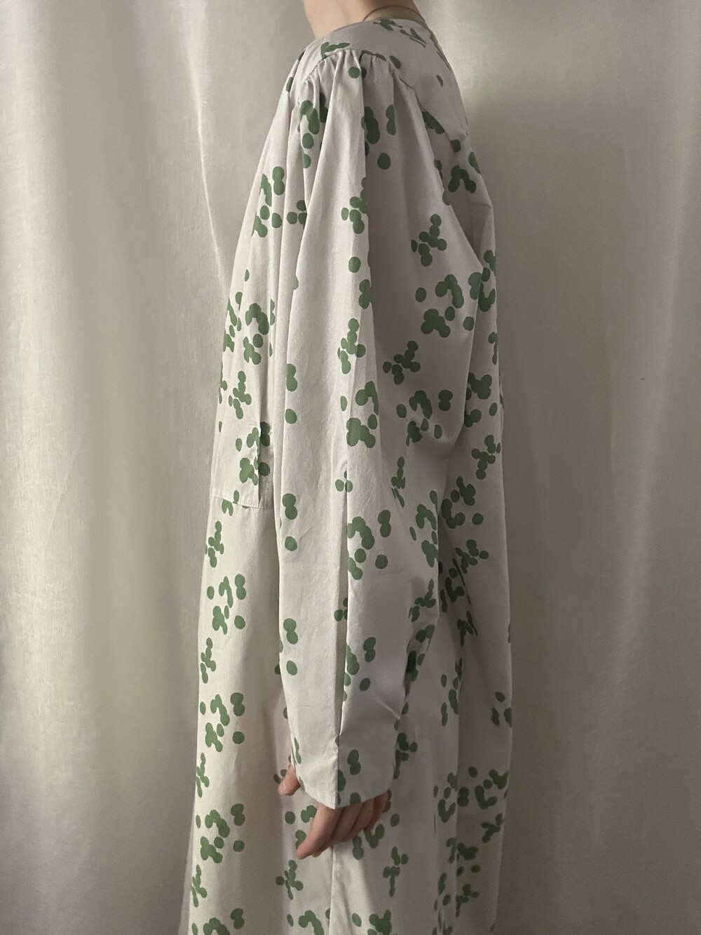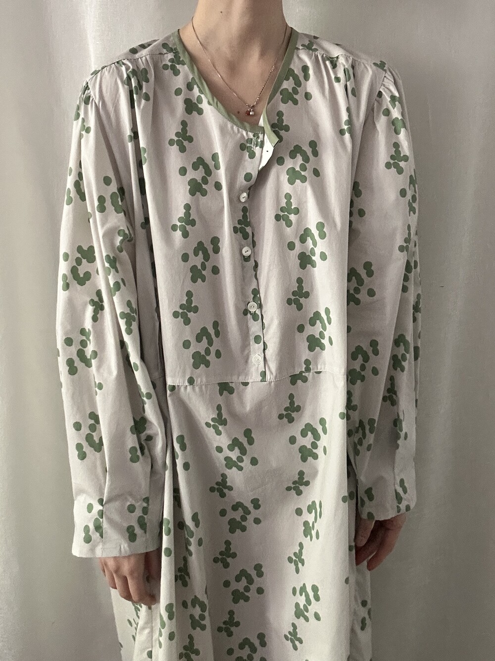 넥 라인은 메인 도트 컬러와 잘 어우러지는 세이지 민트 컬러로 바인딩하고 같은 컬러로 뒷 라인에 셔링을 눌러주는 테이핑을 달아주었습니다.