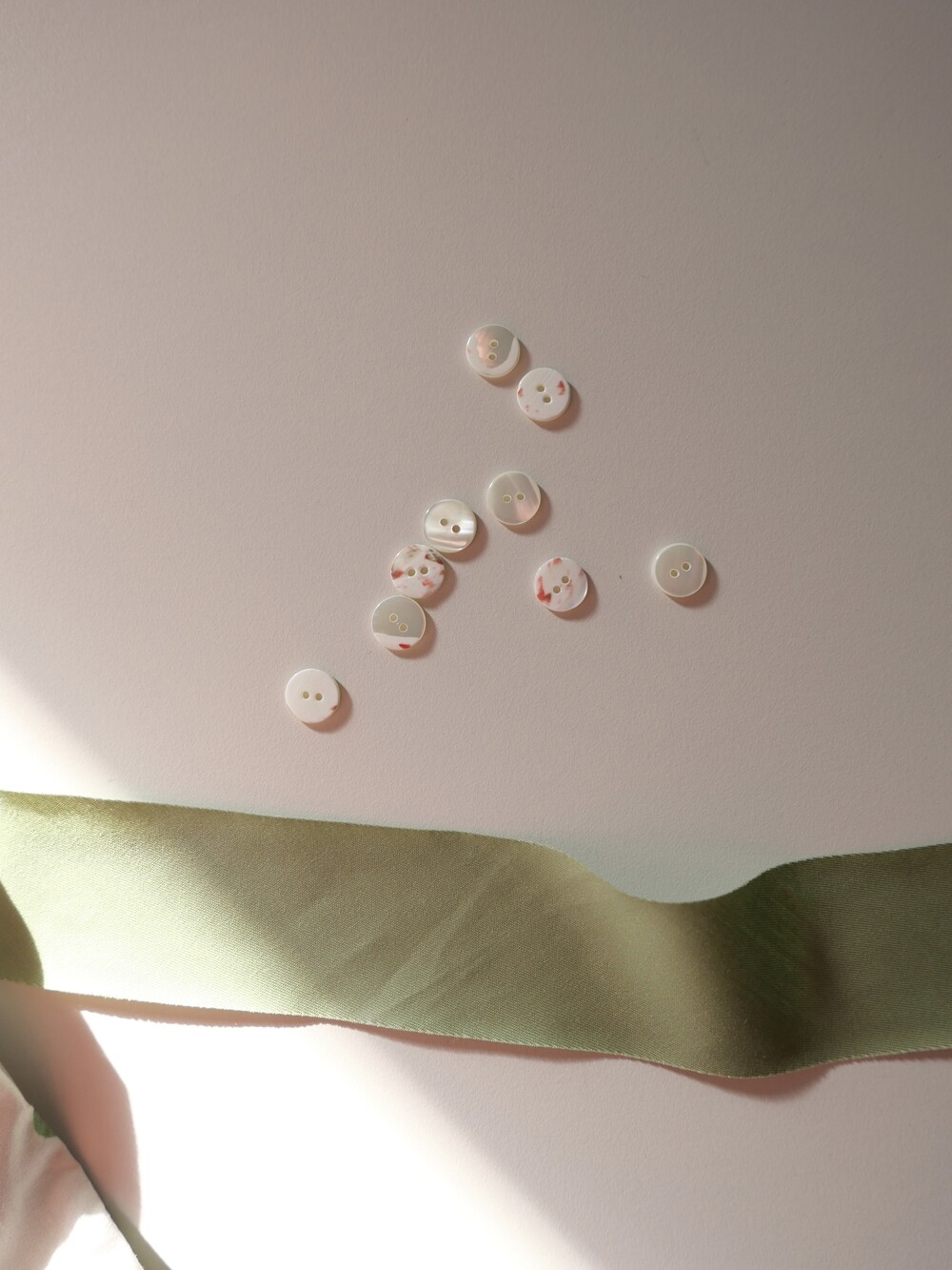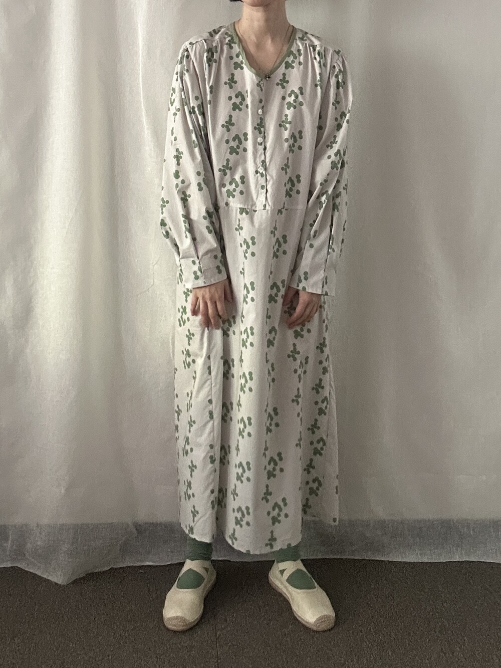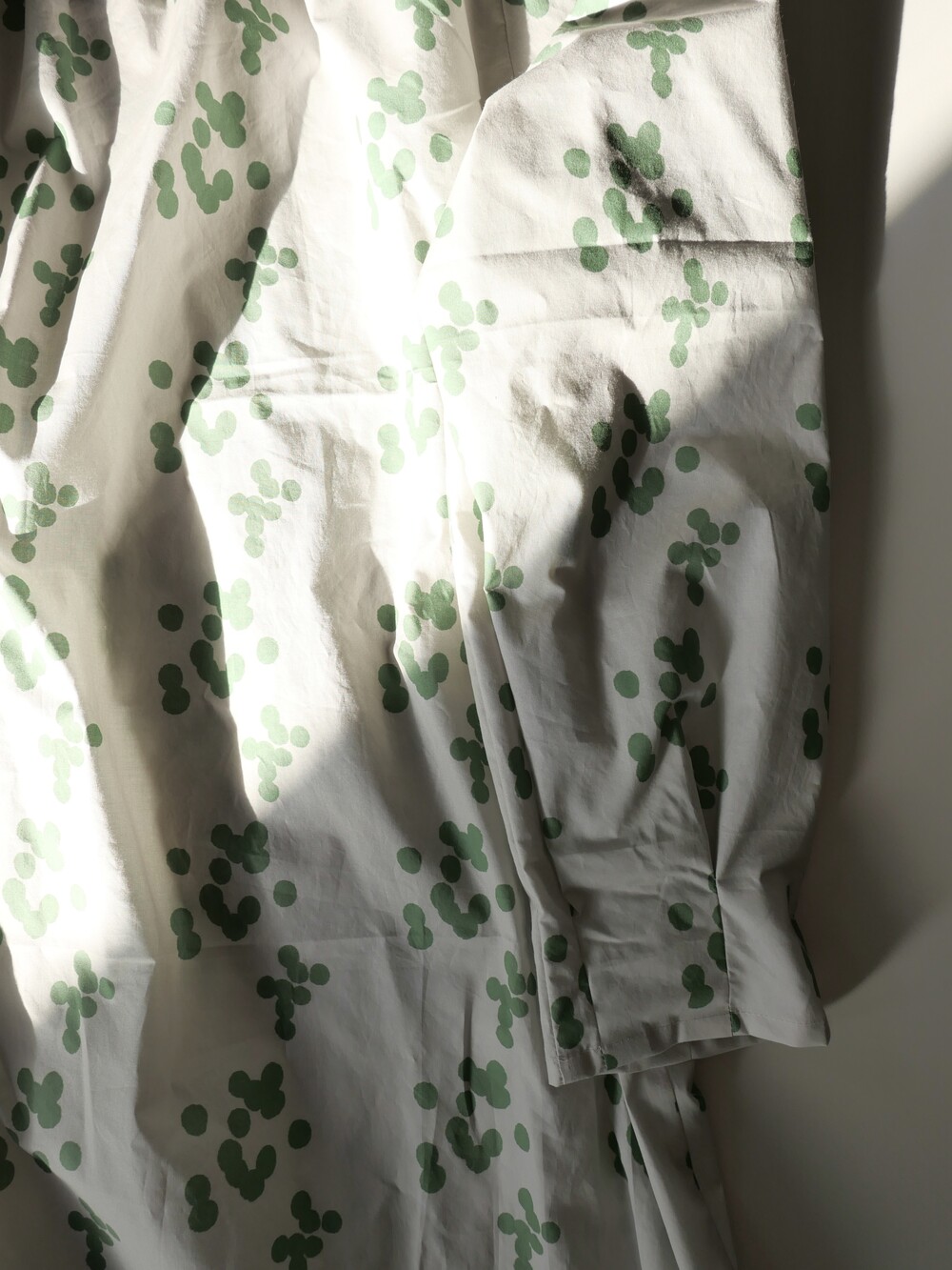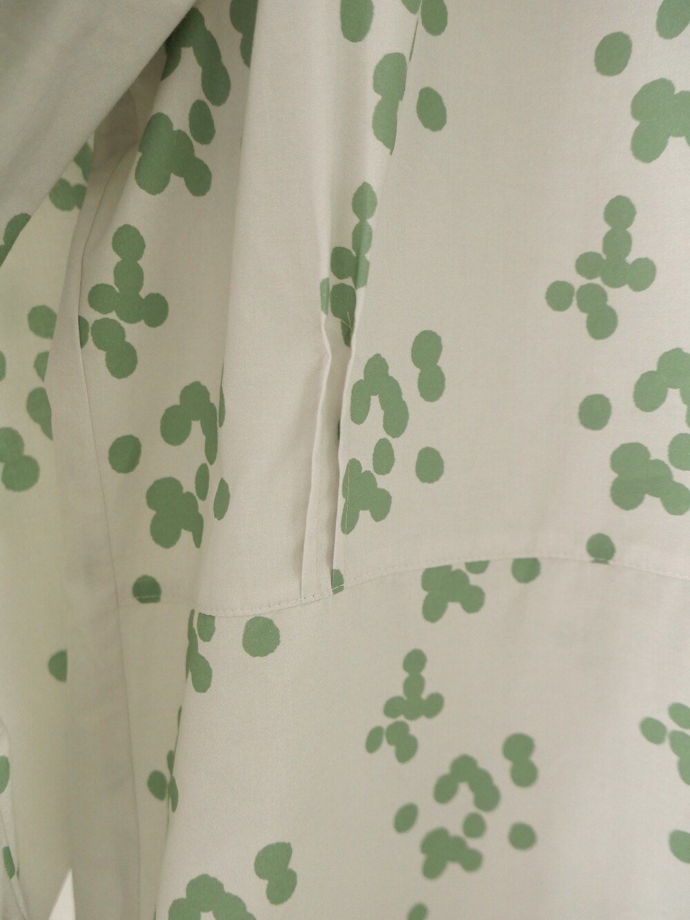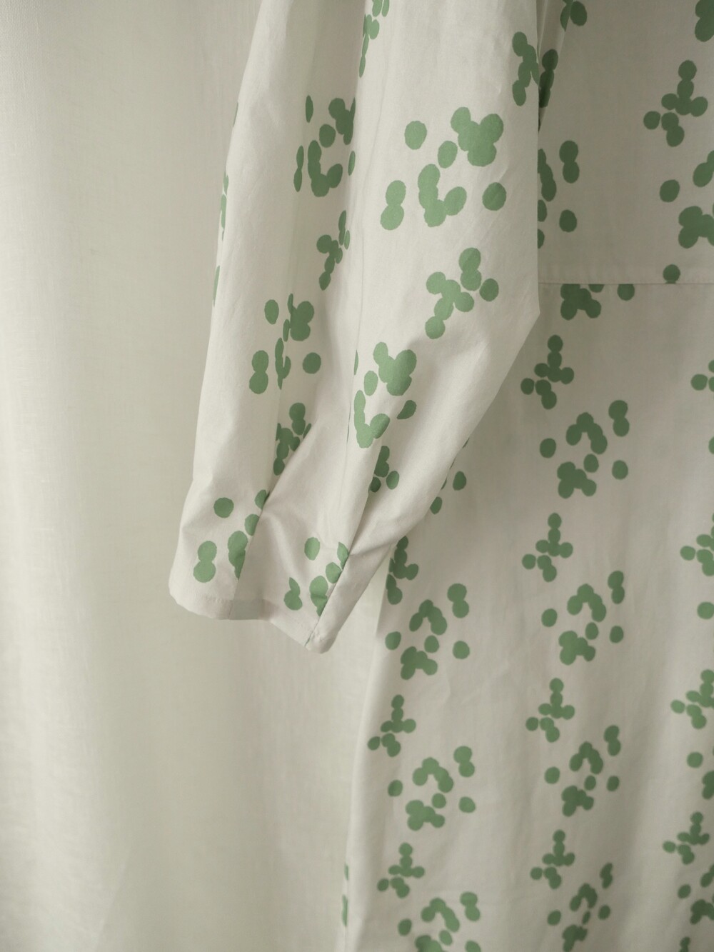 연한 베이지 바탕에 세이지 그린 민트 컬러의 원형 도트가 그려져 있는 패턴입니다.