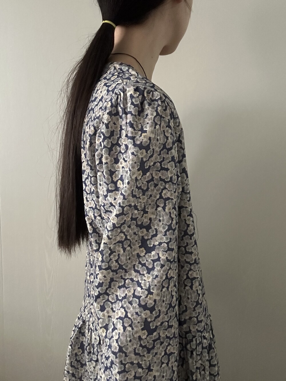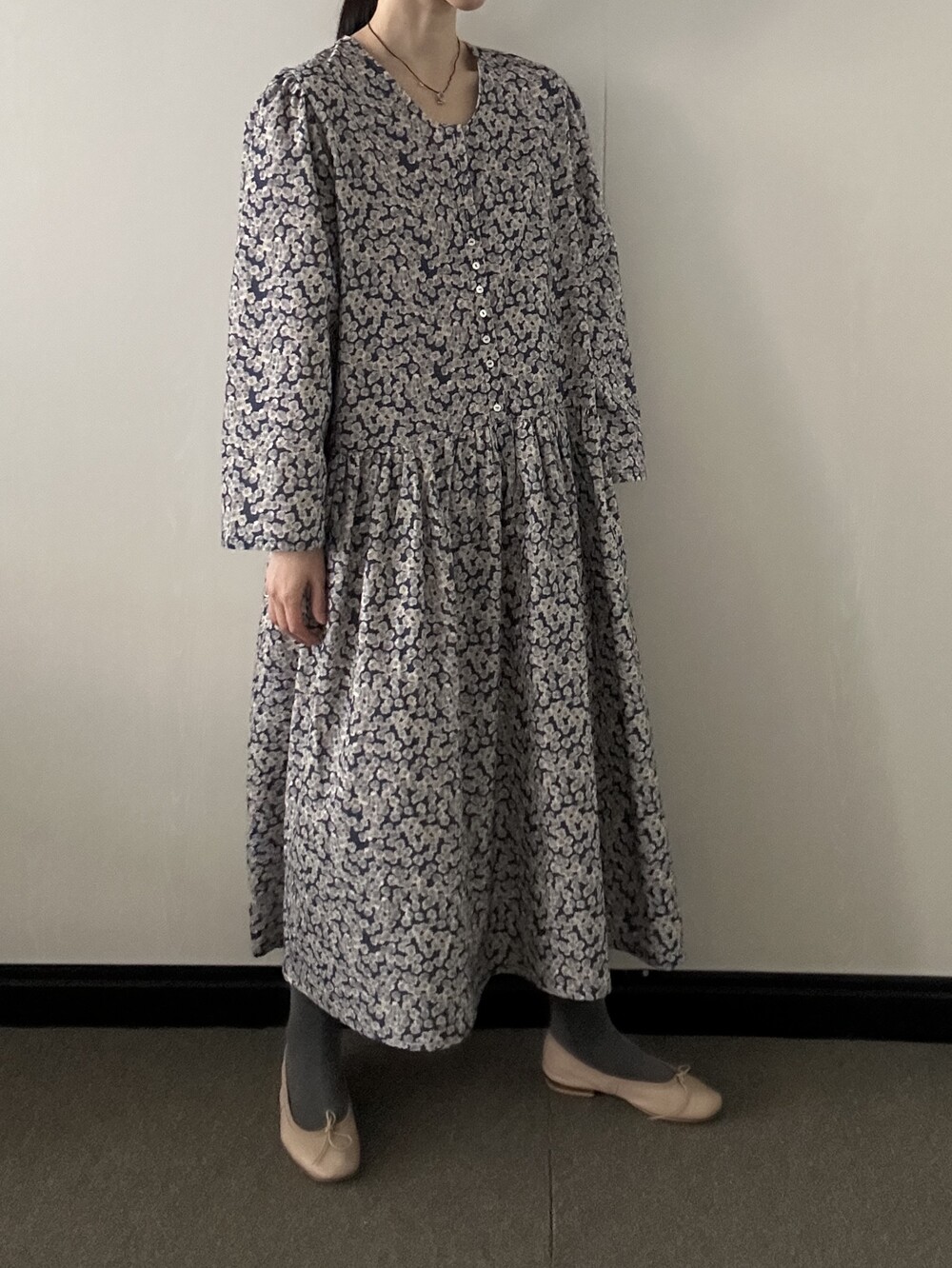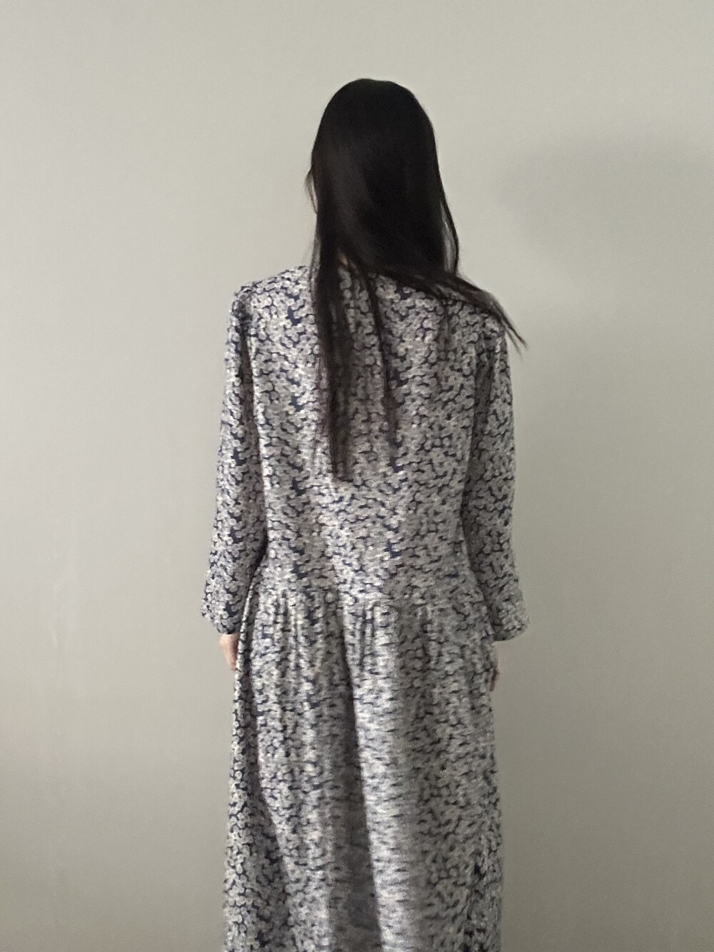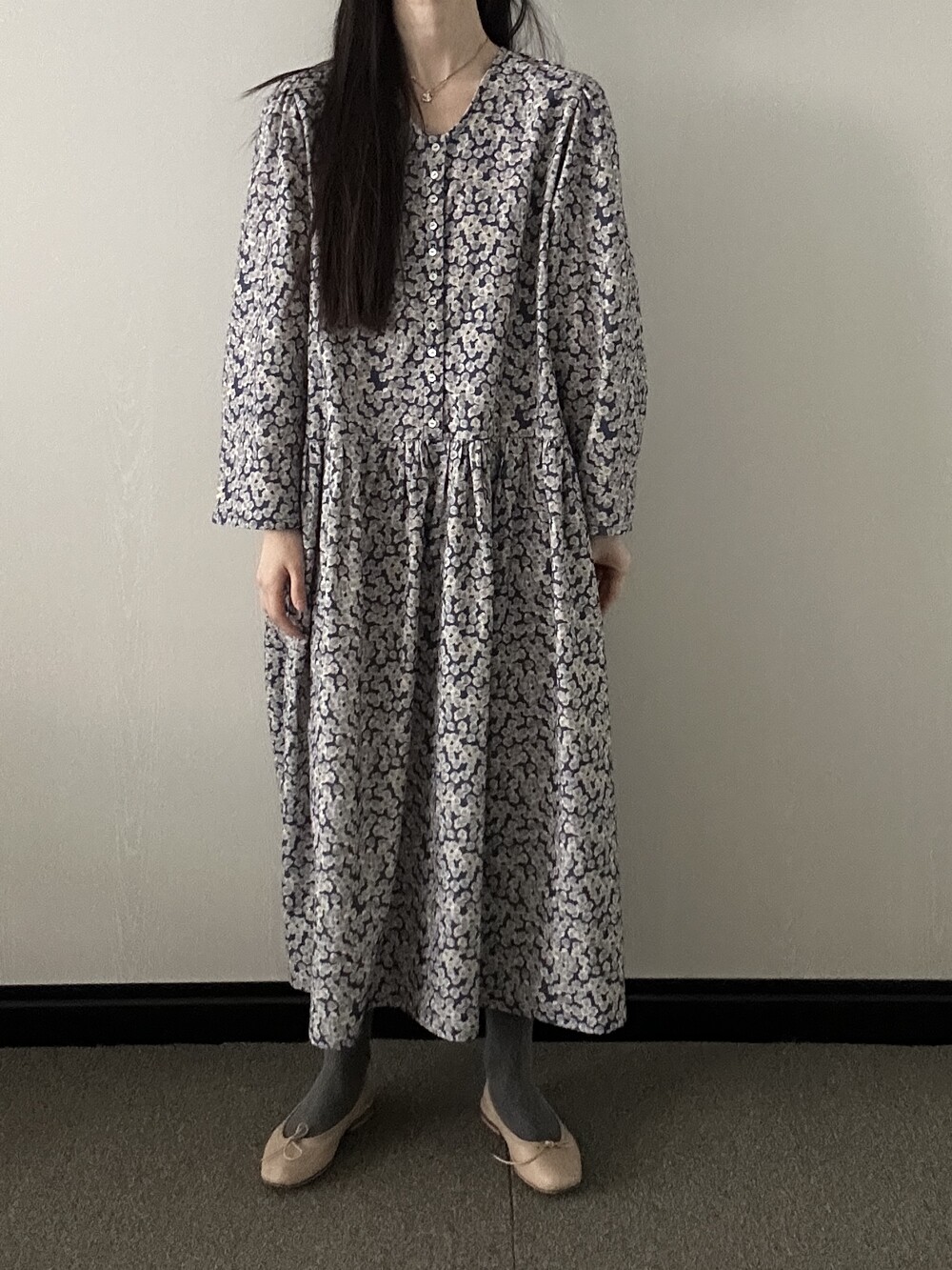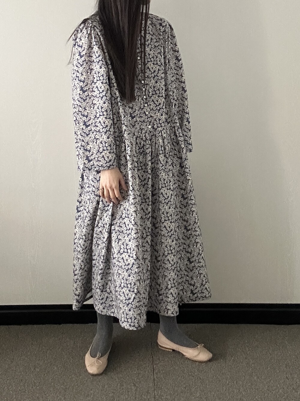 밝은 네이비 바탕에 오묘하게 붉은빛을 띄는 그레이 플라워가 매력적인 원단의 원피스입니다.