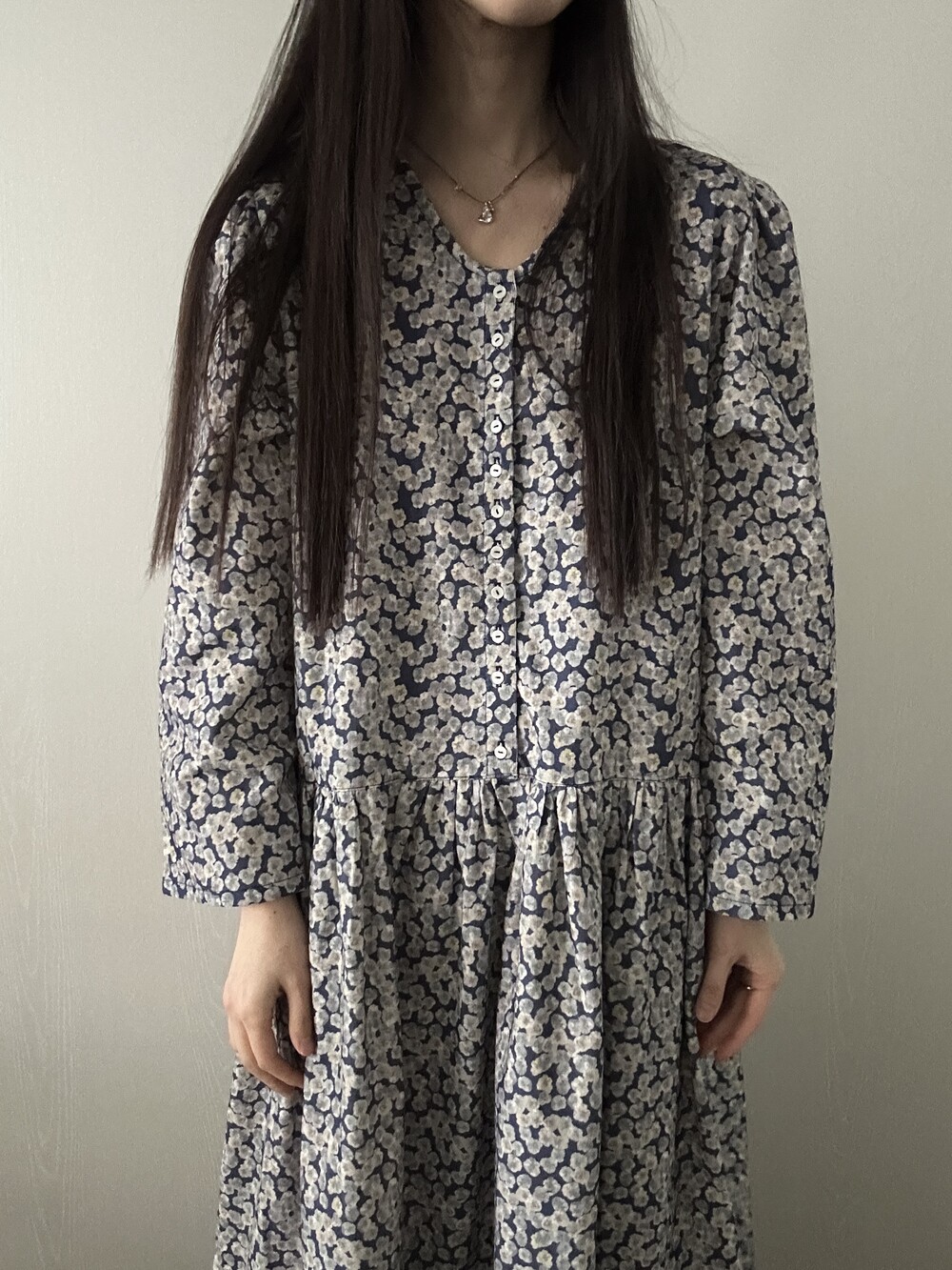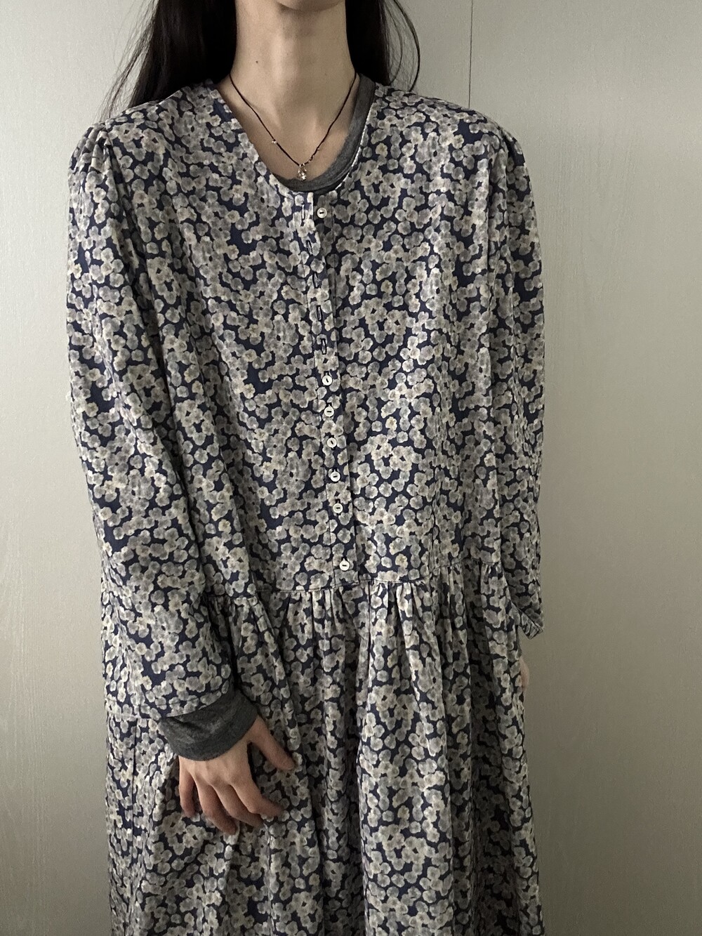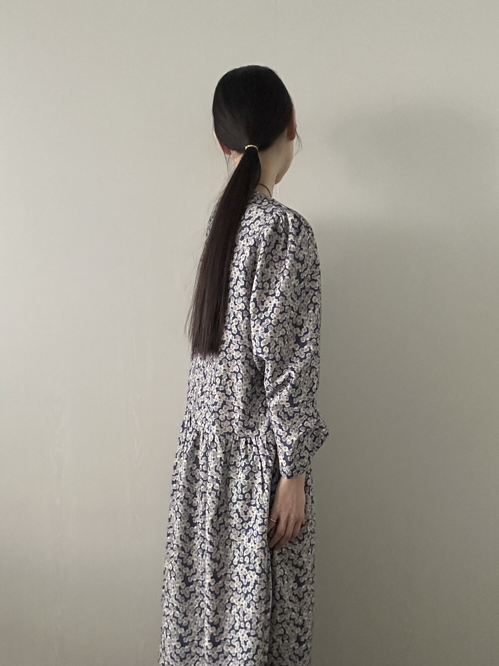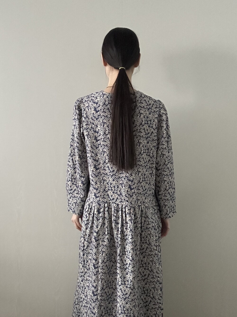 밝은 네이비 바탕에 오묘하게 붉은빛을 띄는 그레이 플라워가 매력적인 원단의 원피스입니다.