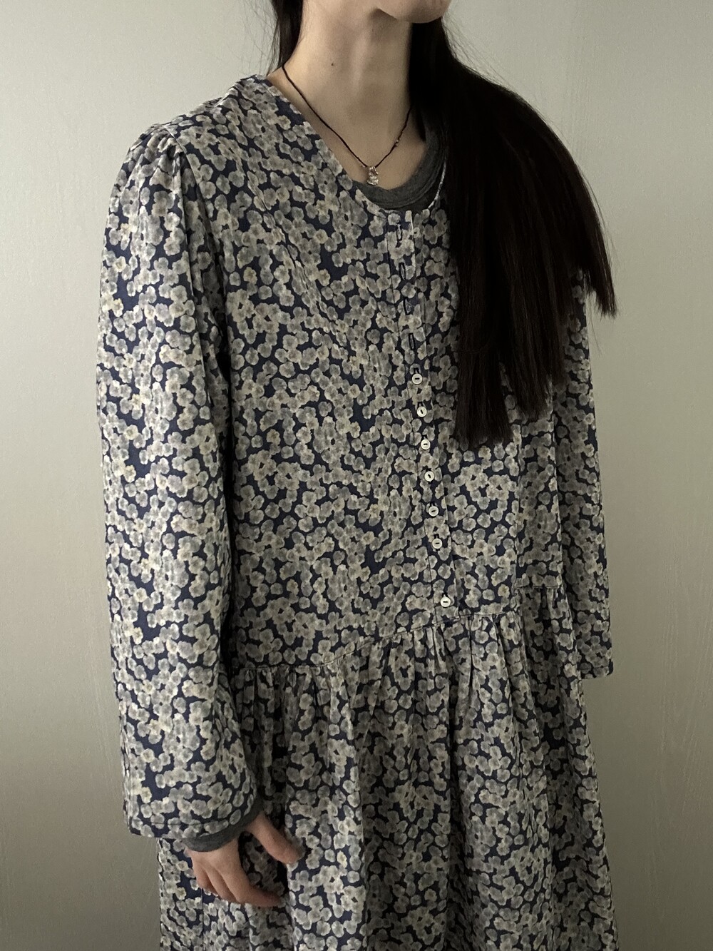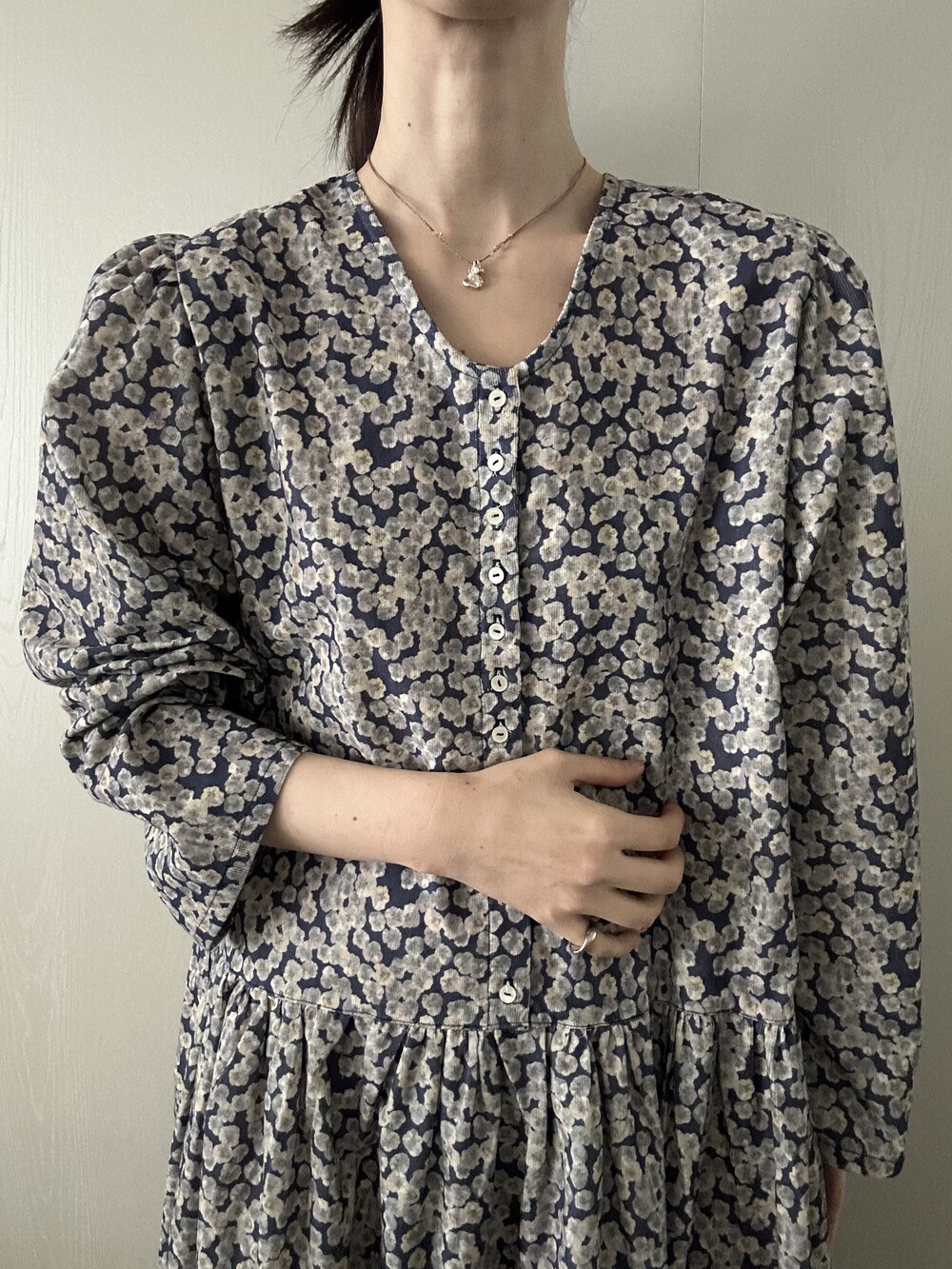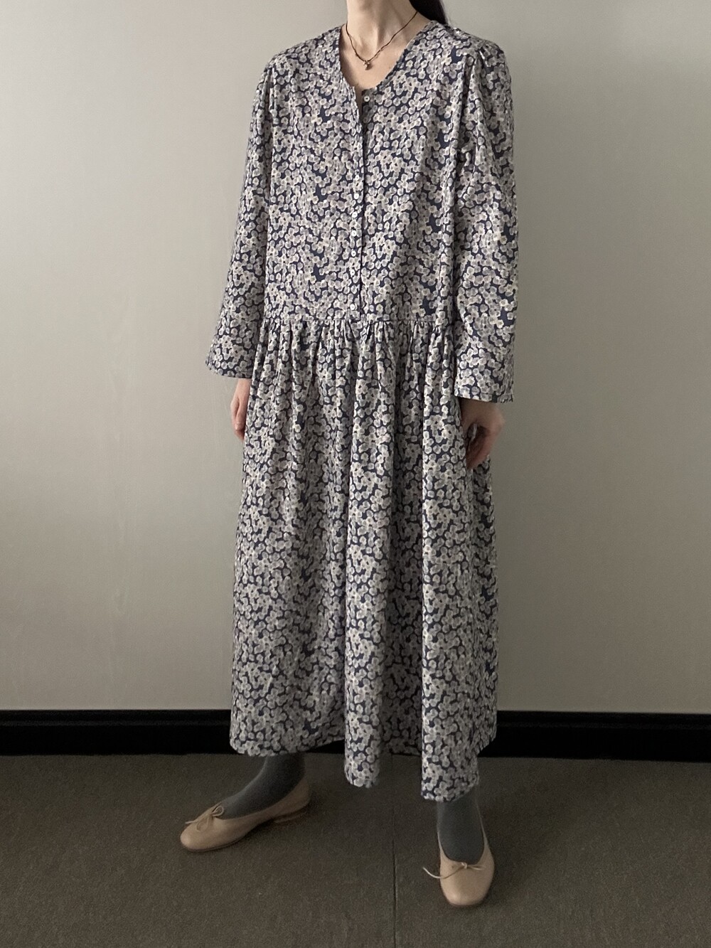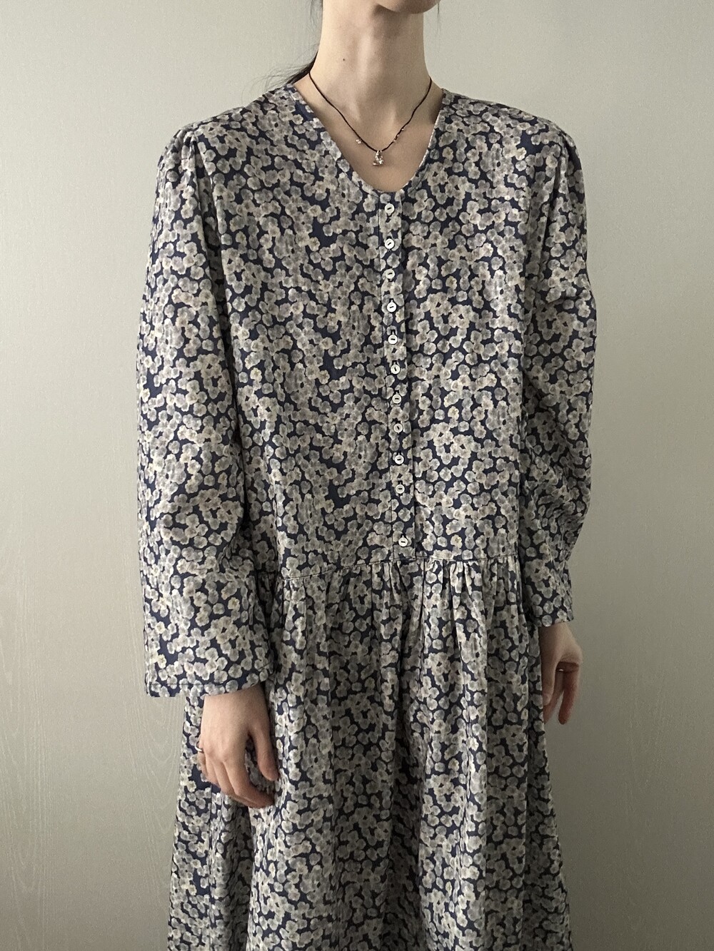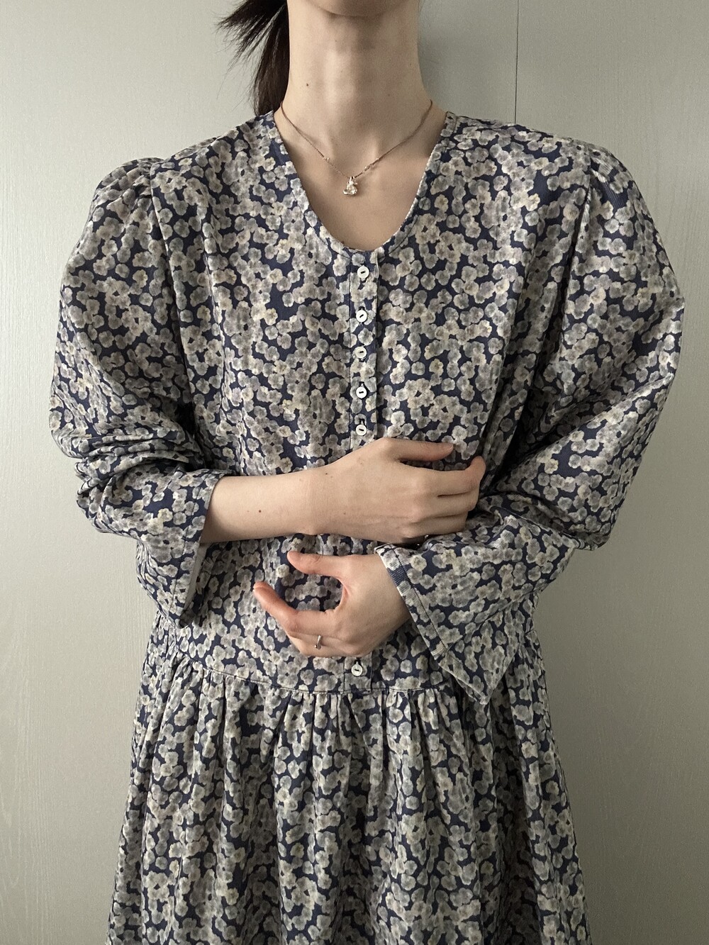 밝은 네이비 바탕에 오묘하게 붉은빛을 띄는 그레이 플라워가 매력적인 원단의 원피스입니다.