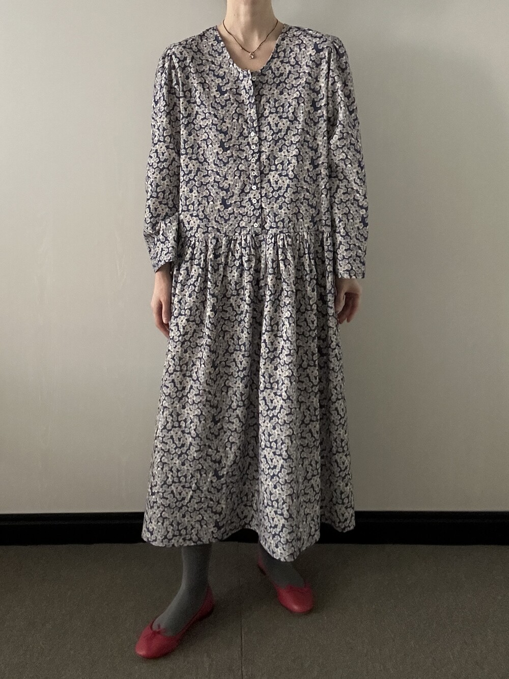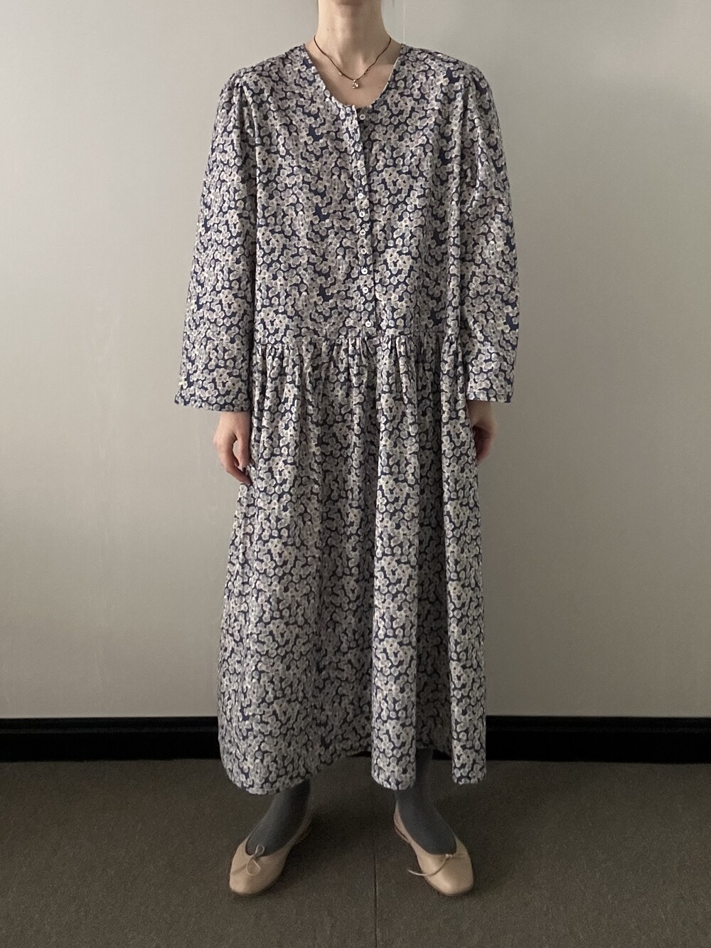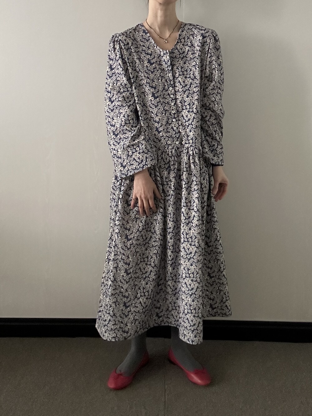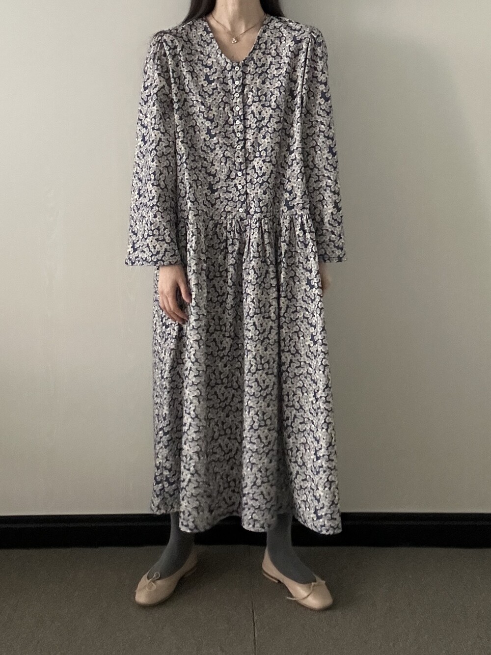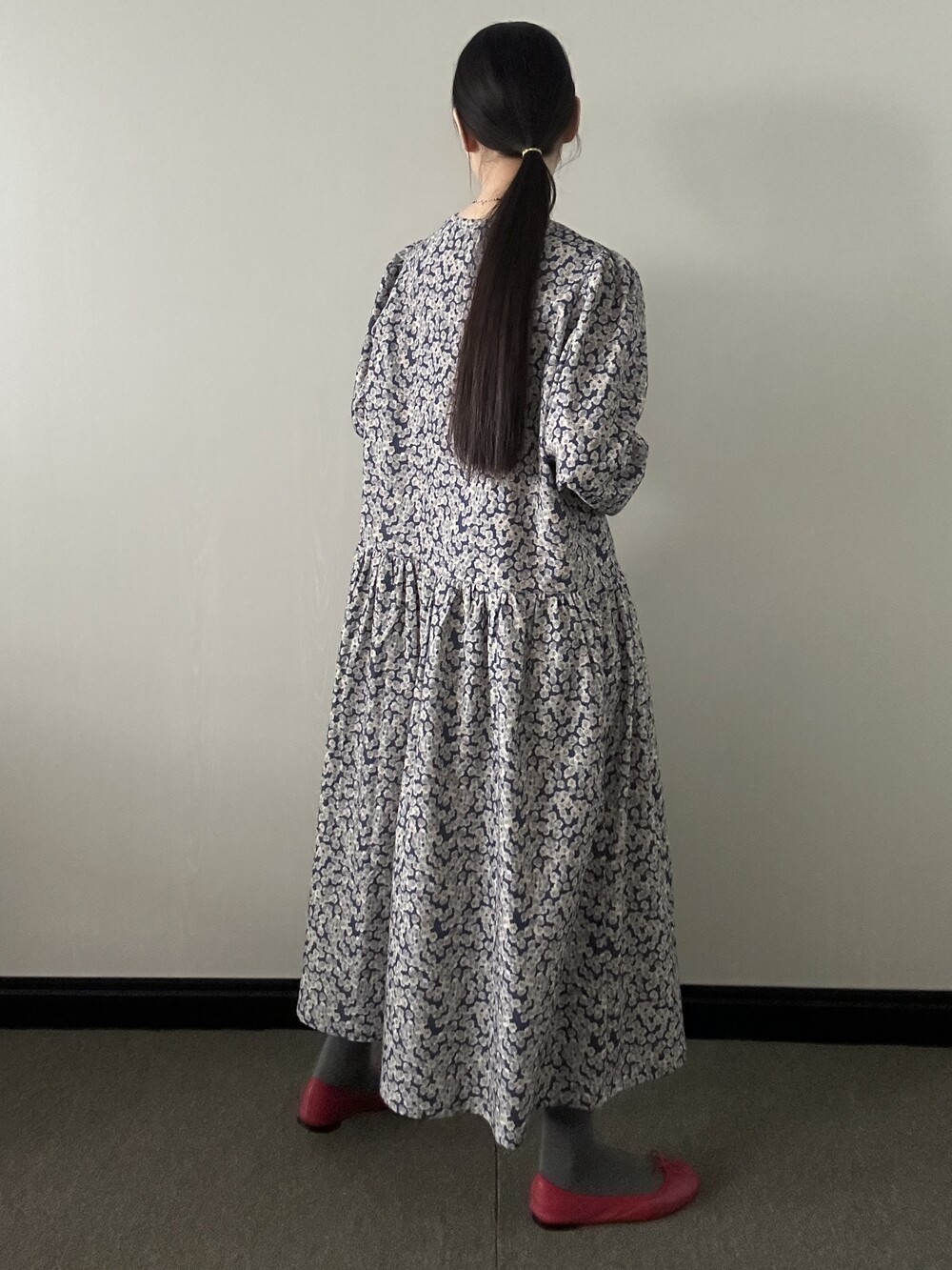 밝은 네이비 바탕에 오묘하게 붉은빛을 띄는 그레이 플라워가 매력적인 원단의 원피스입니다.
