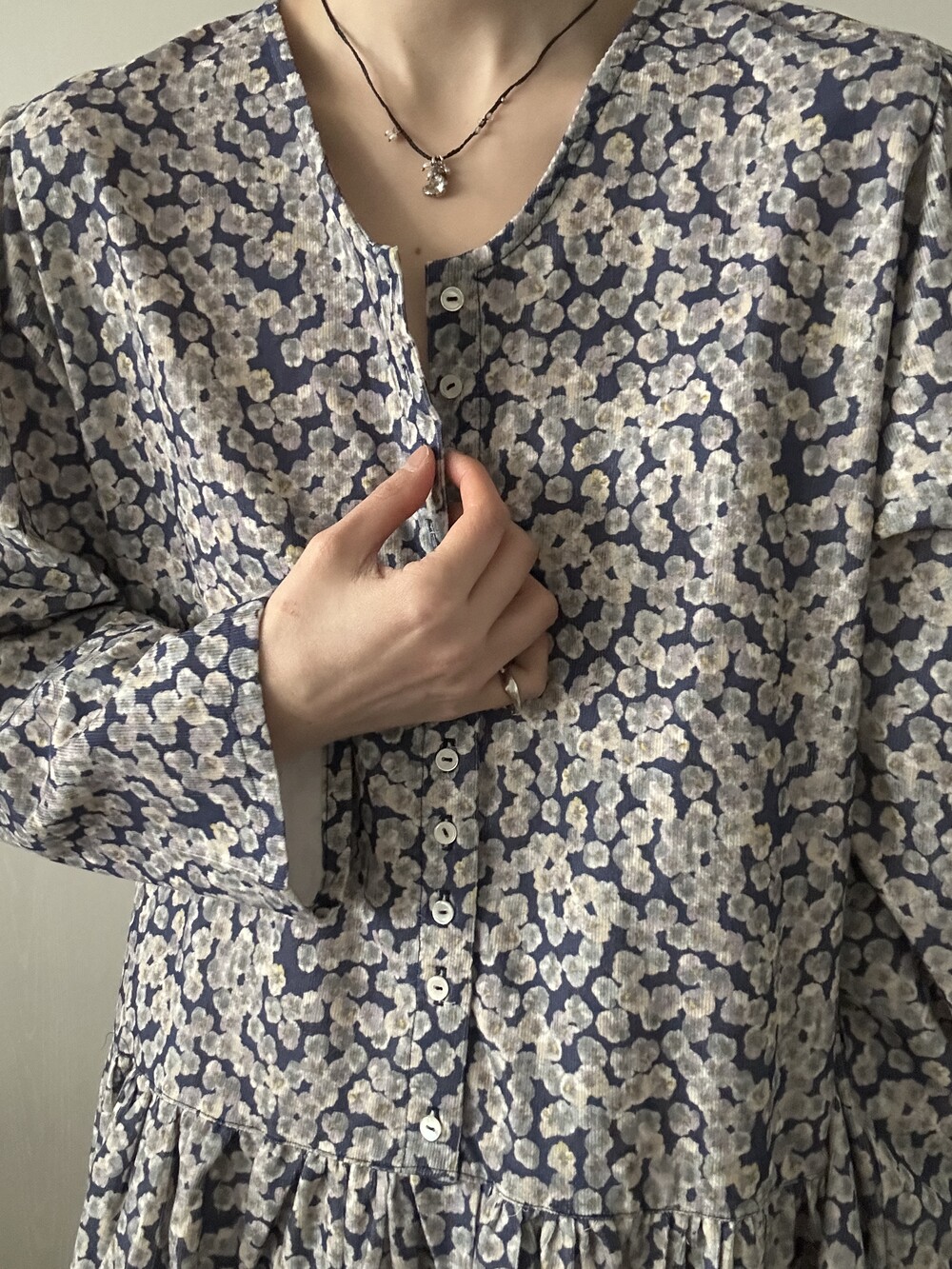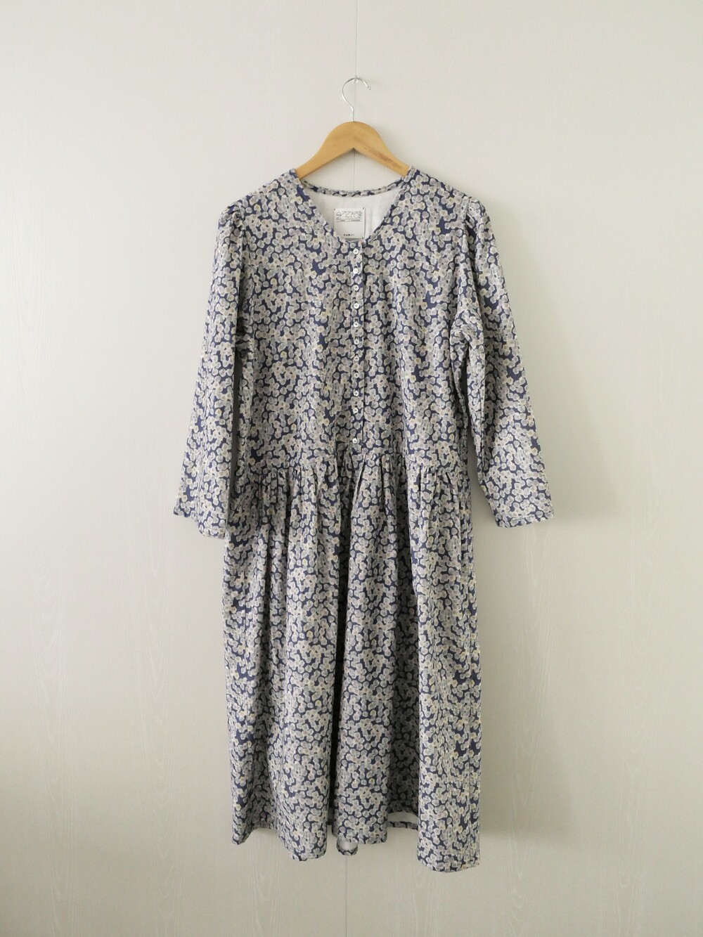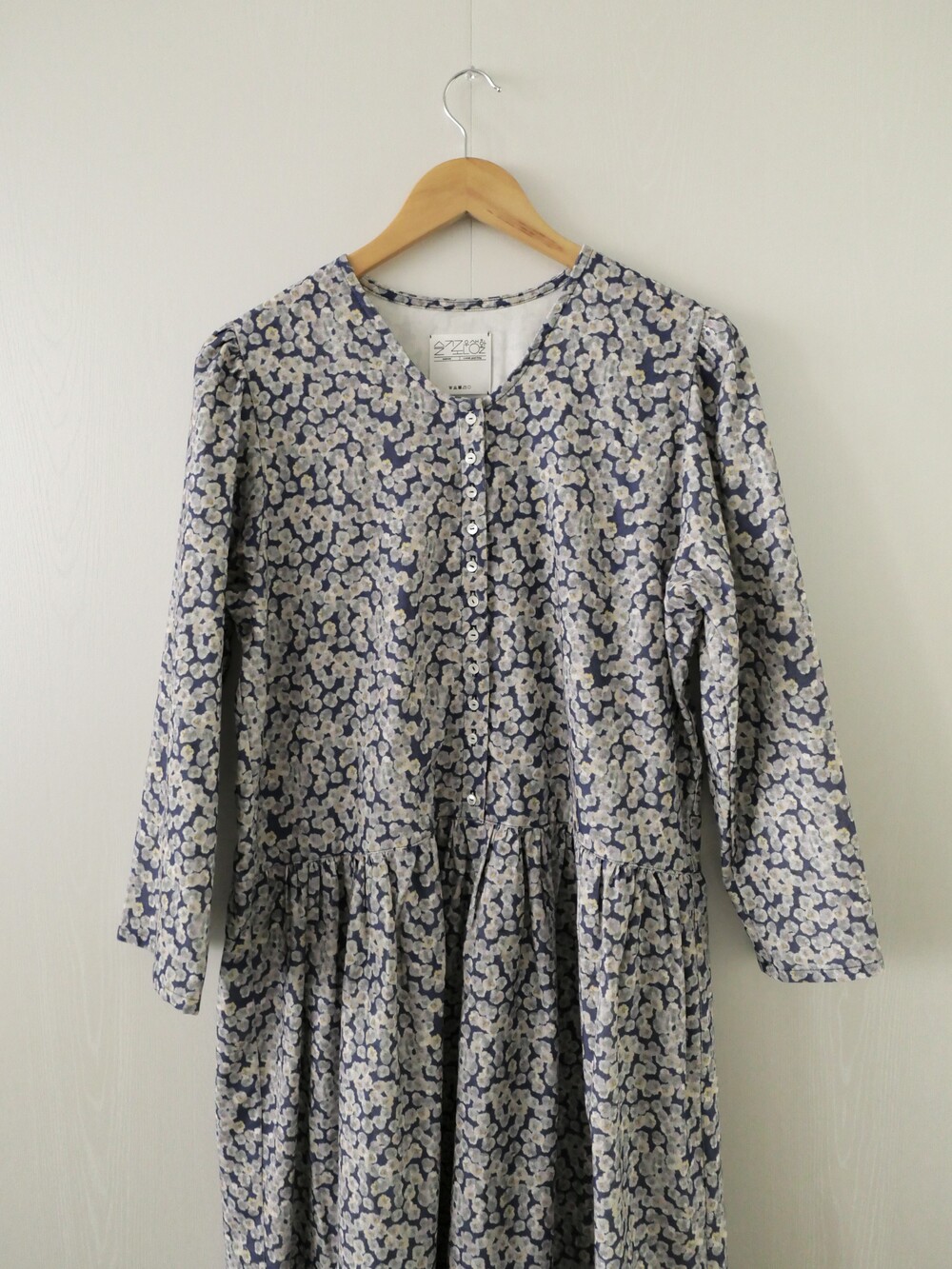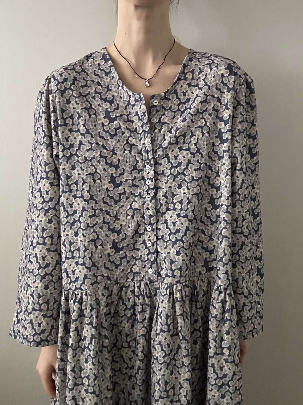 밝은 네이비 바탕에 오묘하게 붉은빛을 띄는 그레이 플라워가 매력적인 원단의 원피스입니다.