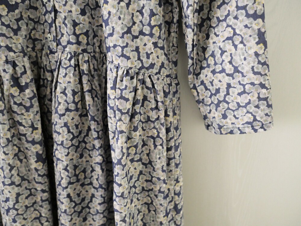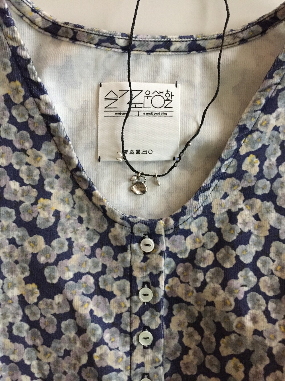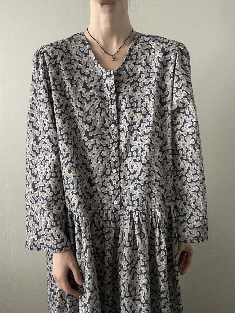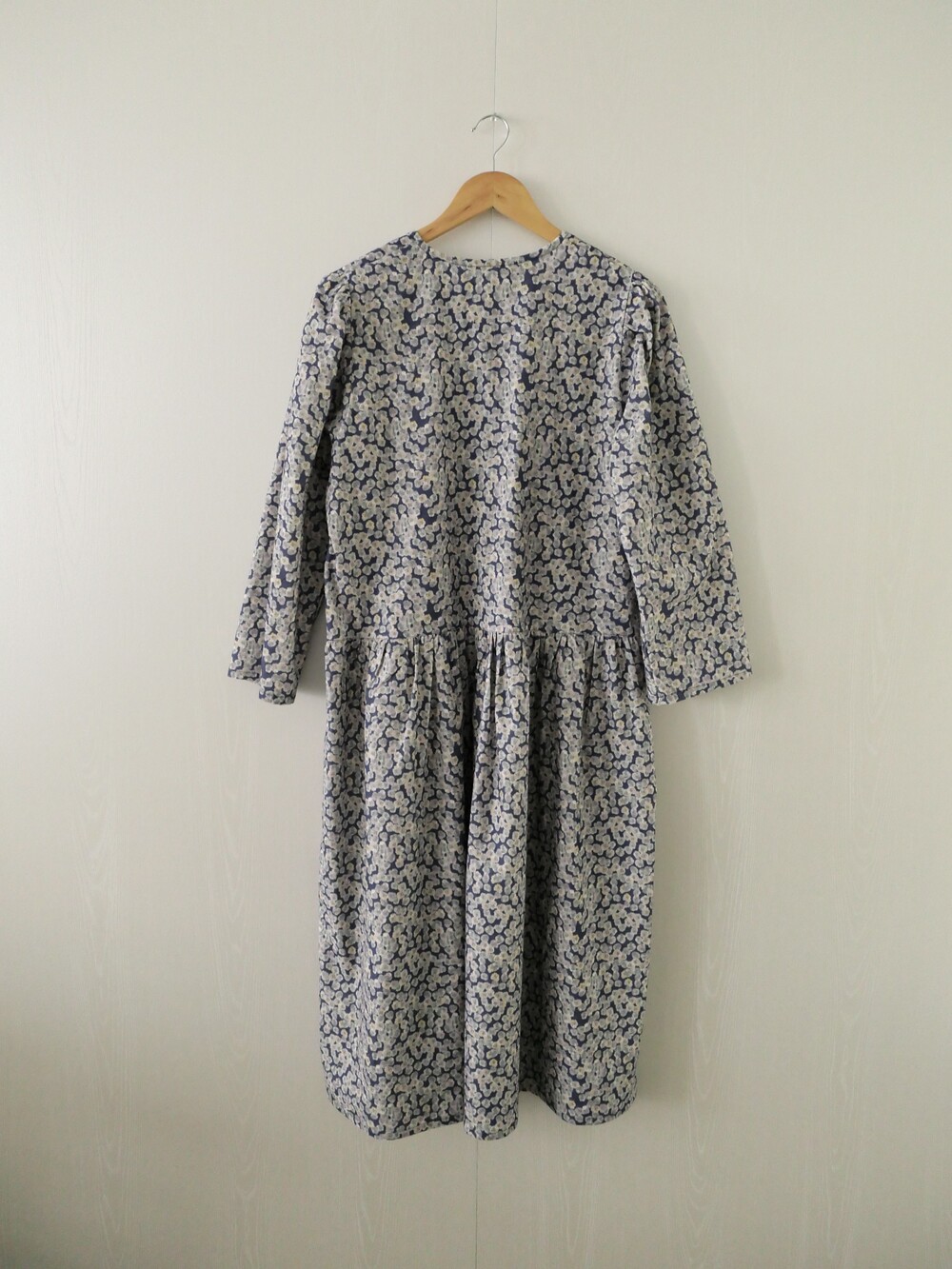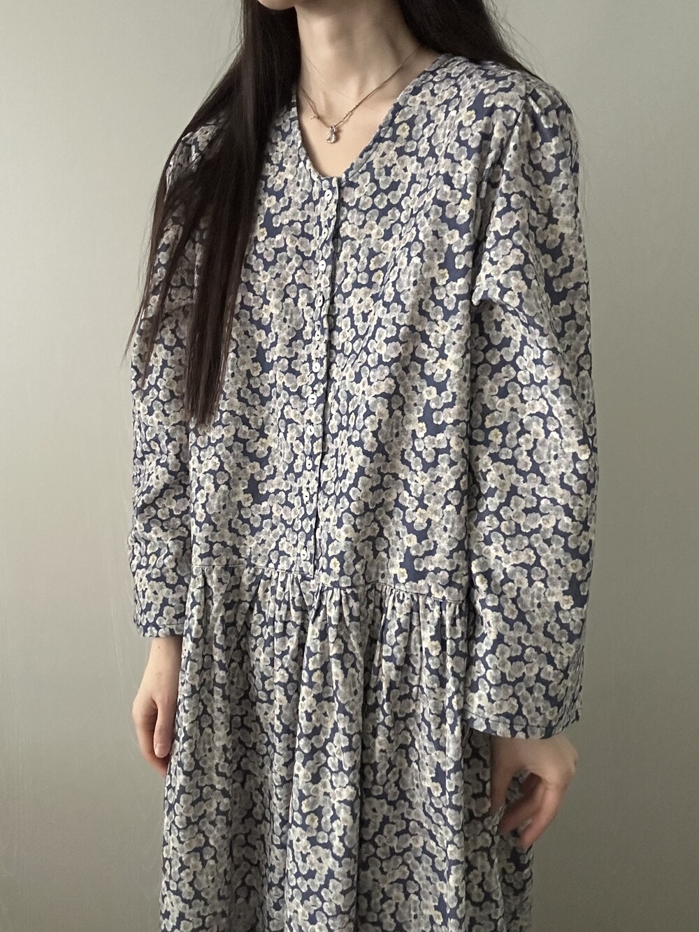 밝은 네이비 바탕에 오묘하게 붉은빛을 띄는 그레이 플라워가 매력적인 원단의 원피스입니다.