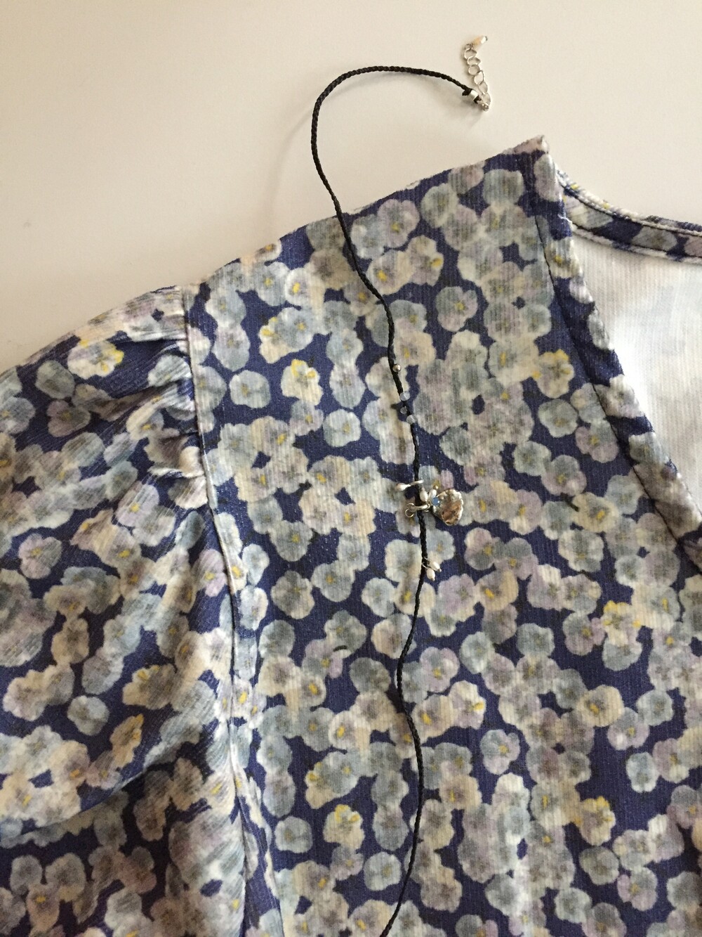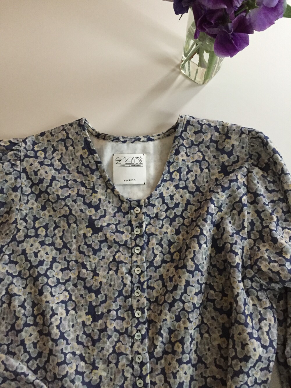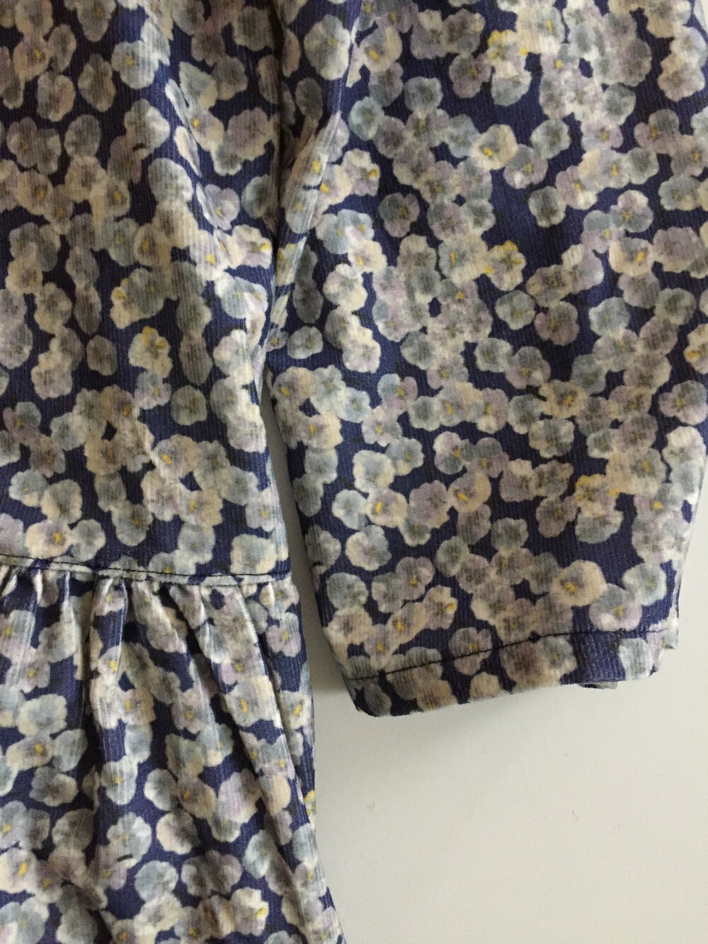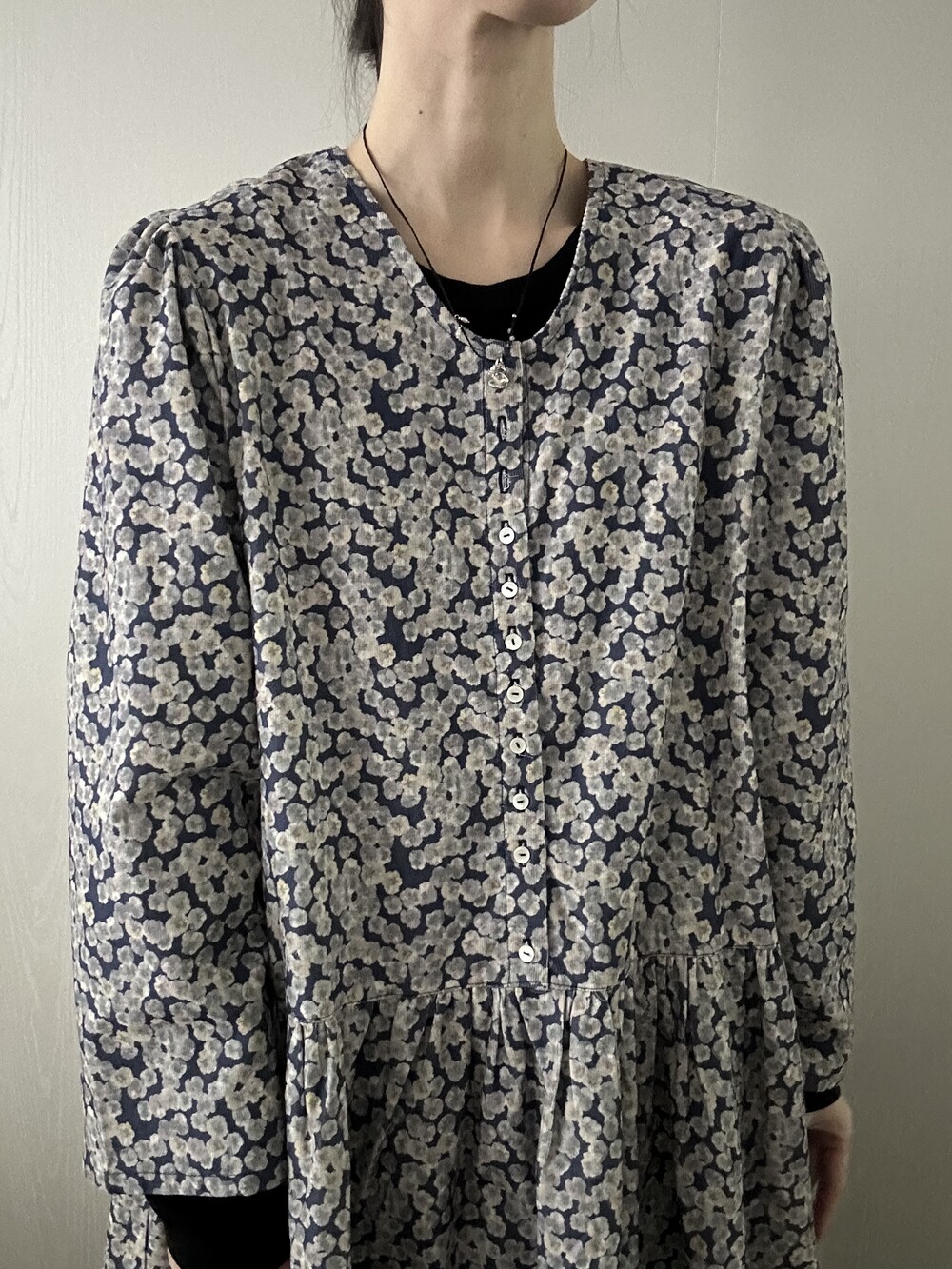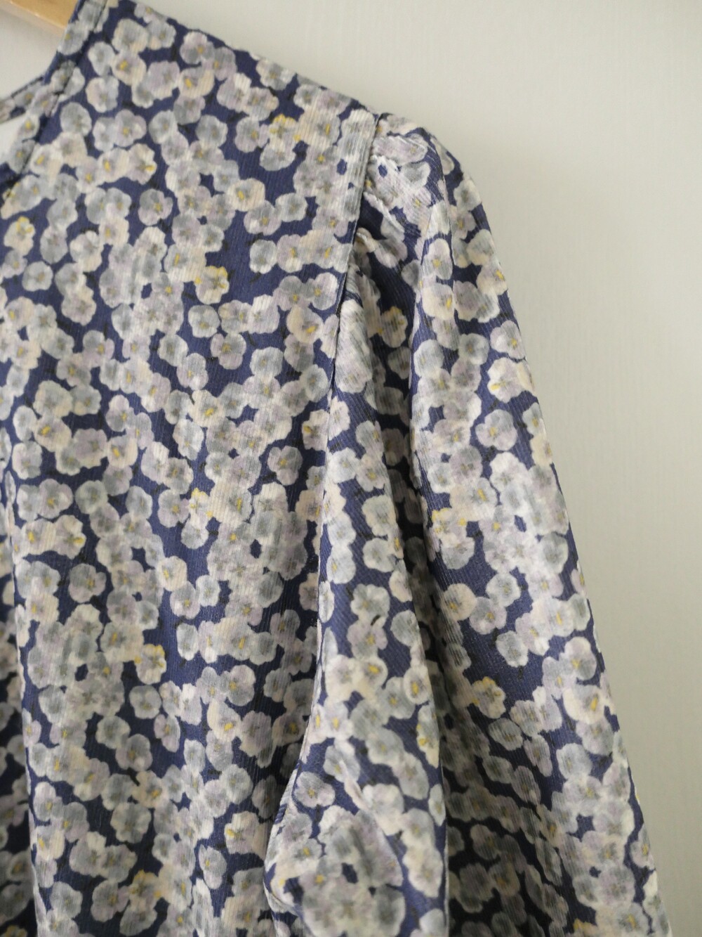 밝은 네이비 바탕에 오묘하게 붉은빛을 띄는 그레이 플라워가 매력적인 원단의 원피스입니다.