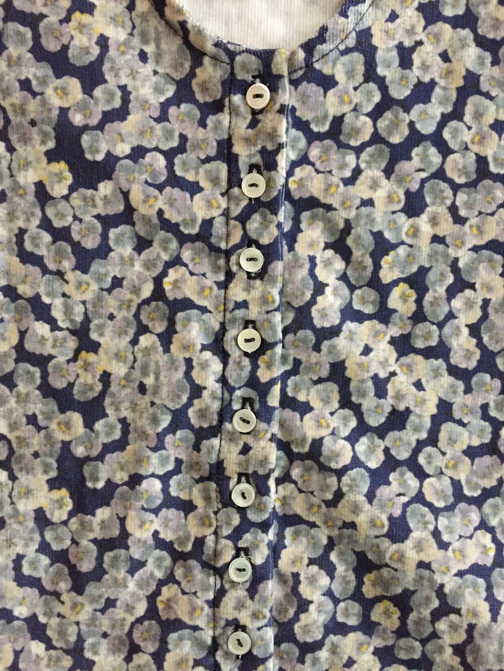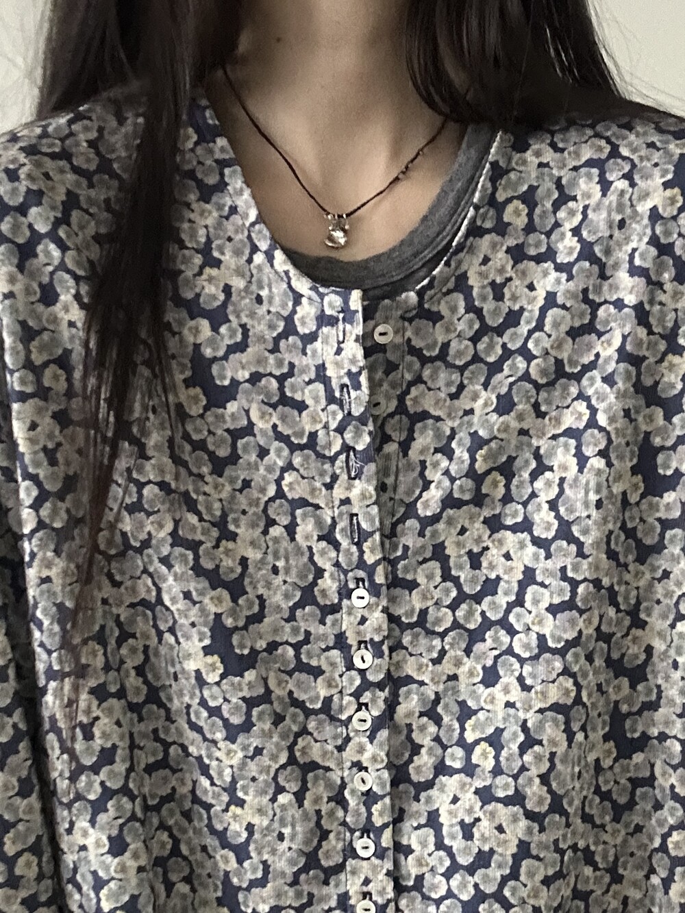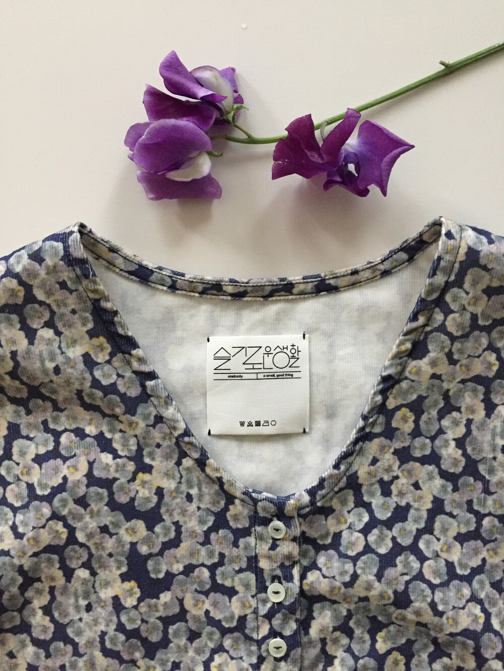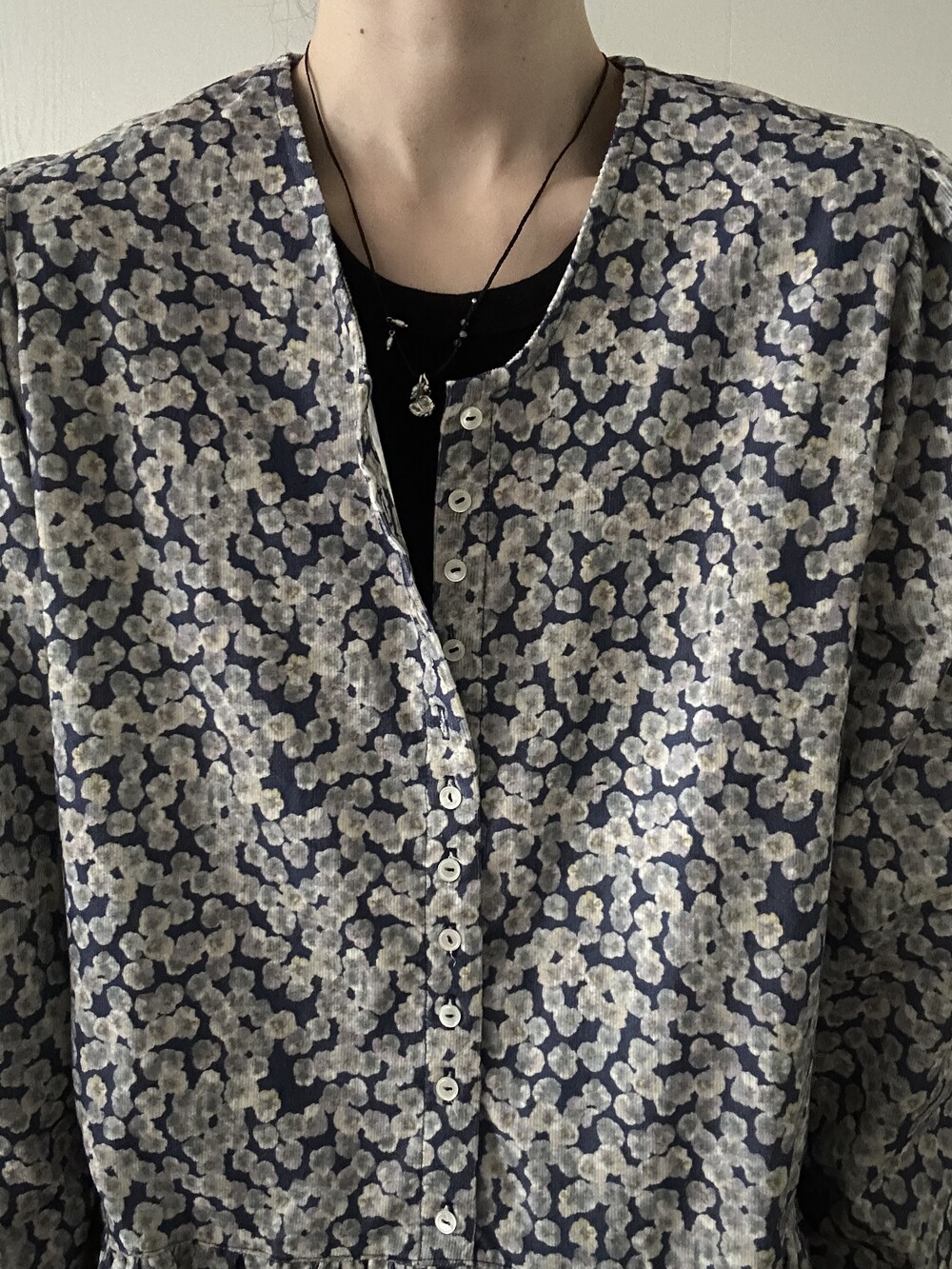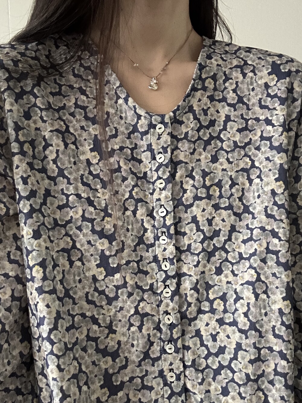 브이넥과 유넥을 조화롭게 재해석해서 디자인한 넥 라인과 진주에서 영감을 받은 작은 자개단추를 촘촘하게 엮어 빈티지한 무드를 더해주었습니다. 마지막 단추만 넓은 폭으로 달아 재미를 주었습니다.
