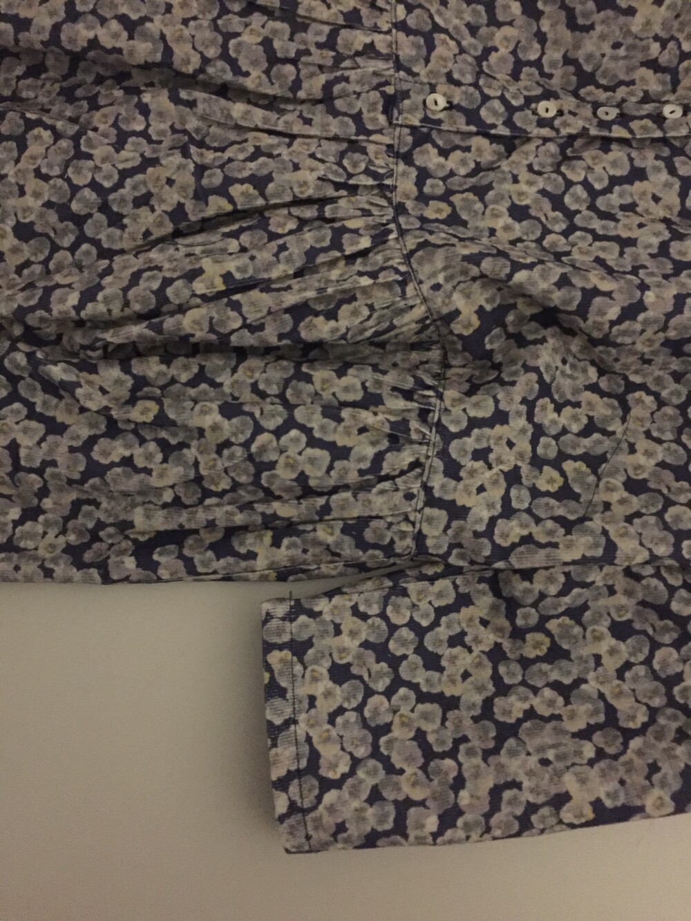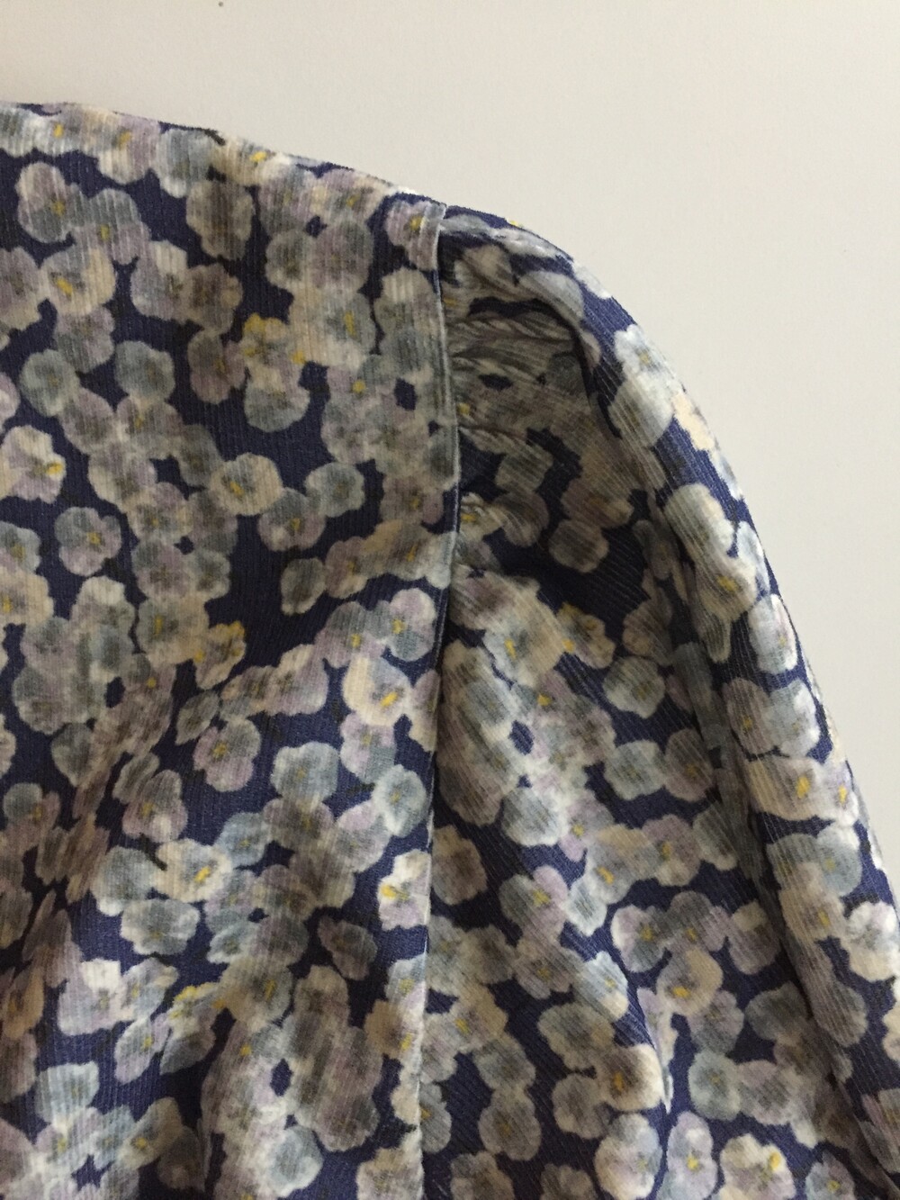 옆으로 퍼지는 퍼프가 아닌 수직적으로 셔링을 주어 어깨를 강조하면서도 소매 라인은 부해보이지 않도록 했습니다.