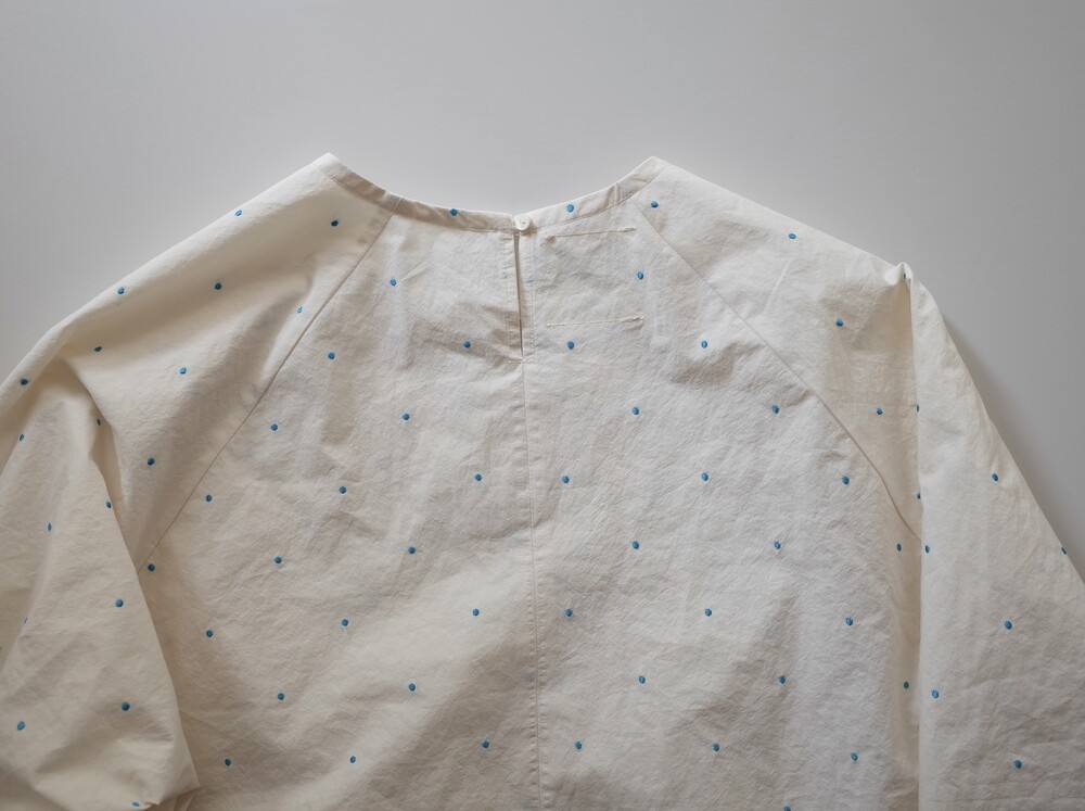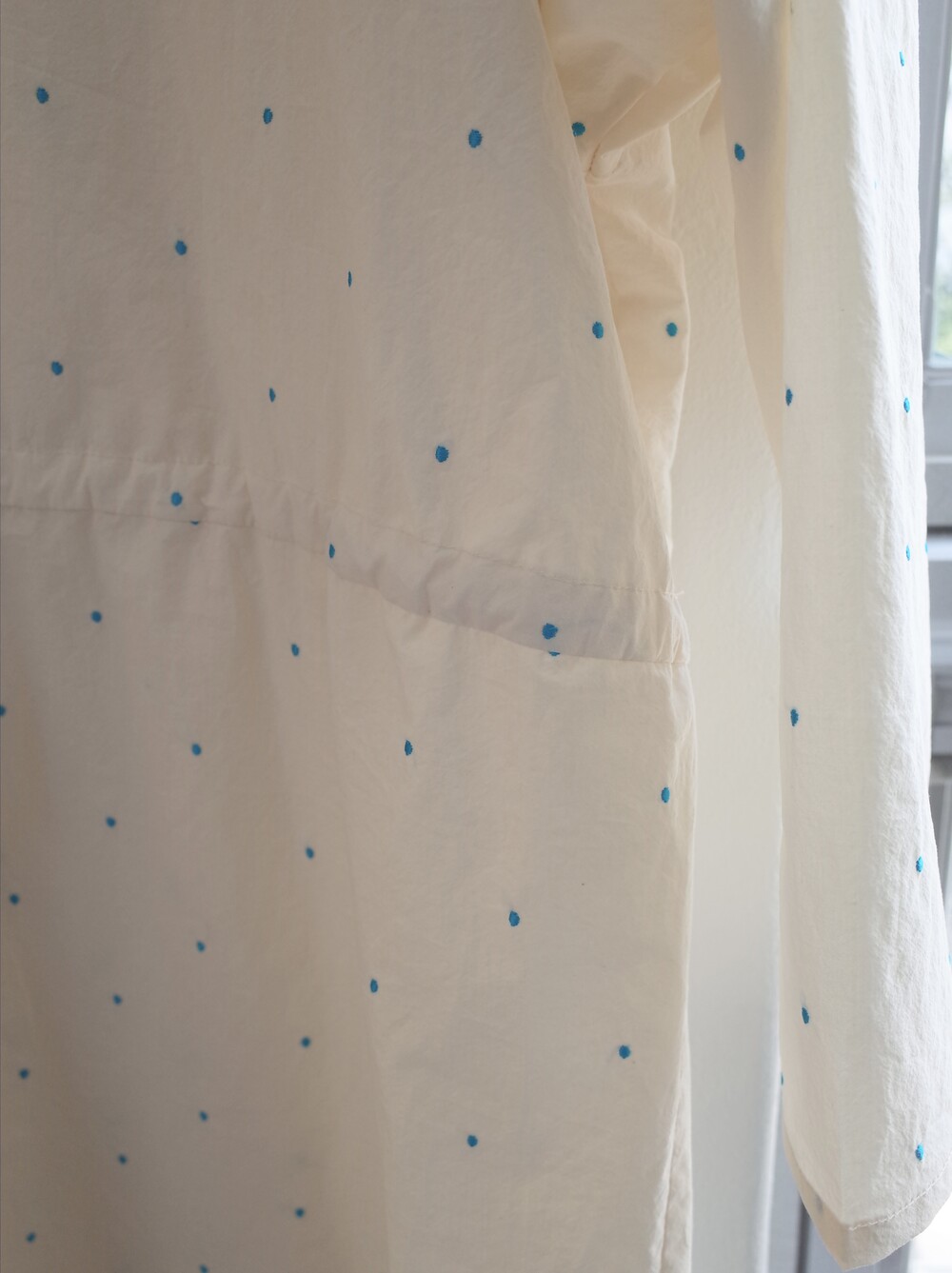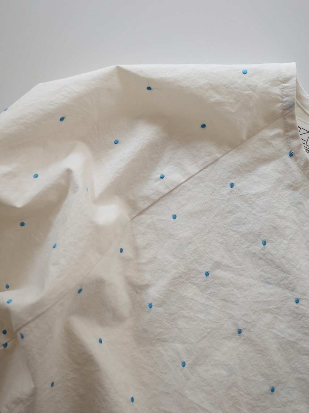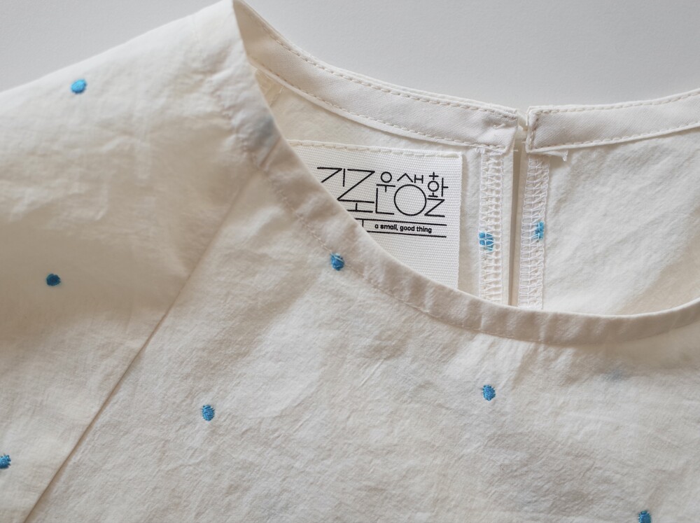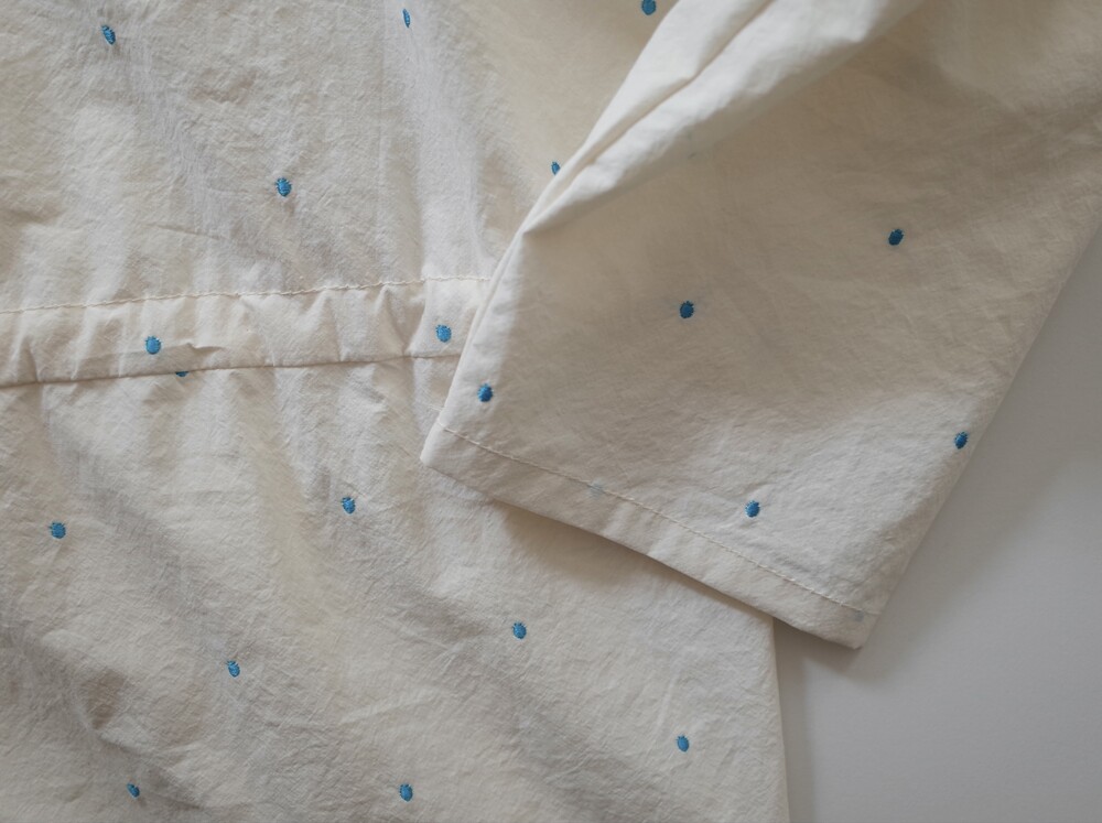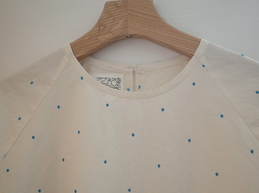 크림 컬러 바탕에 청록빛 블루 컬러의 도트 자수로 슬기로운생활에서만 만나볼 수 있는 제작 원단입니다.