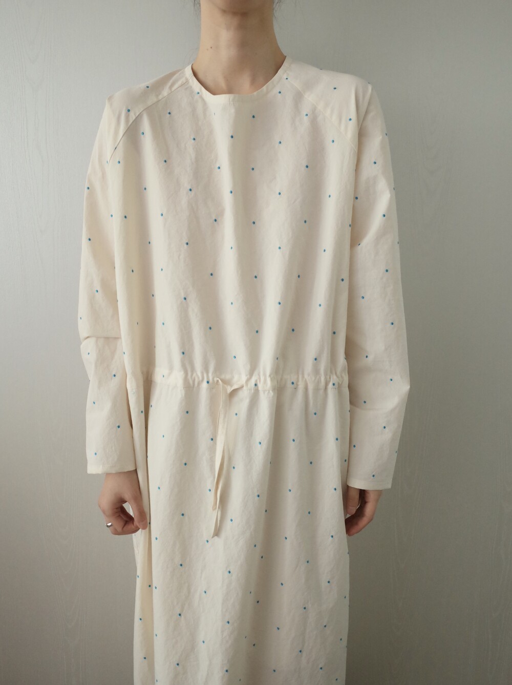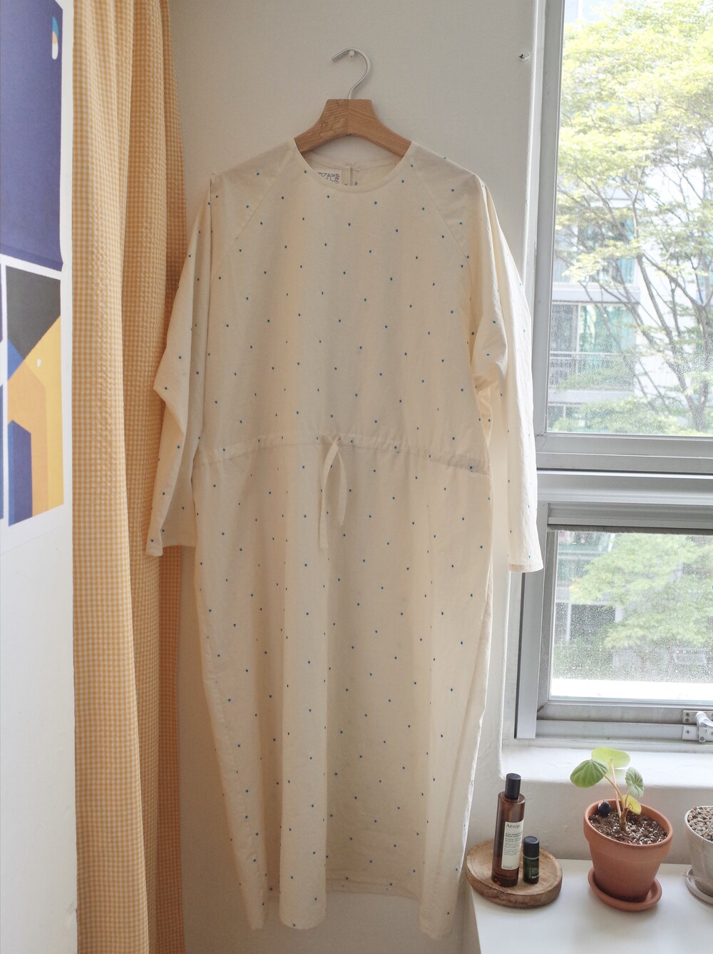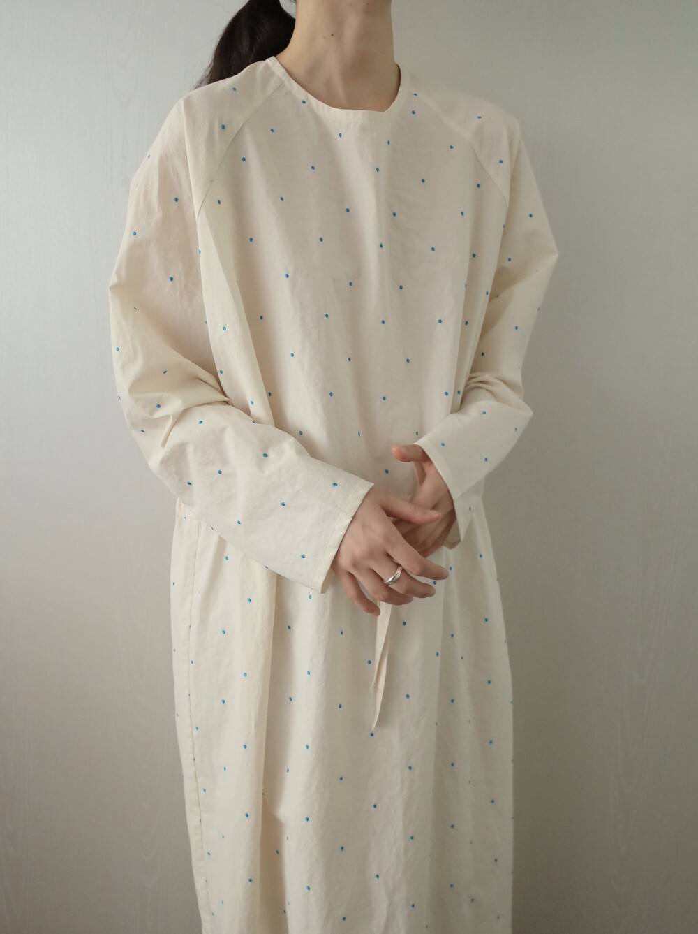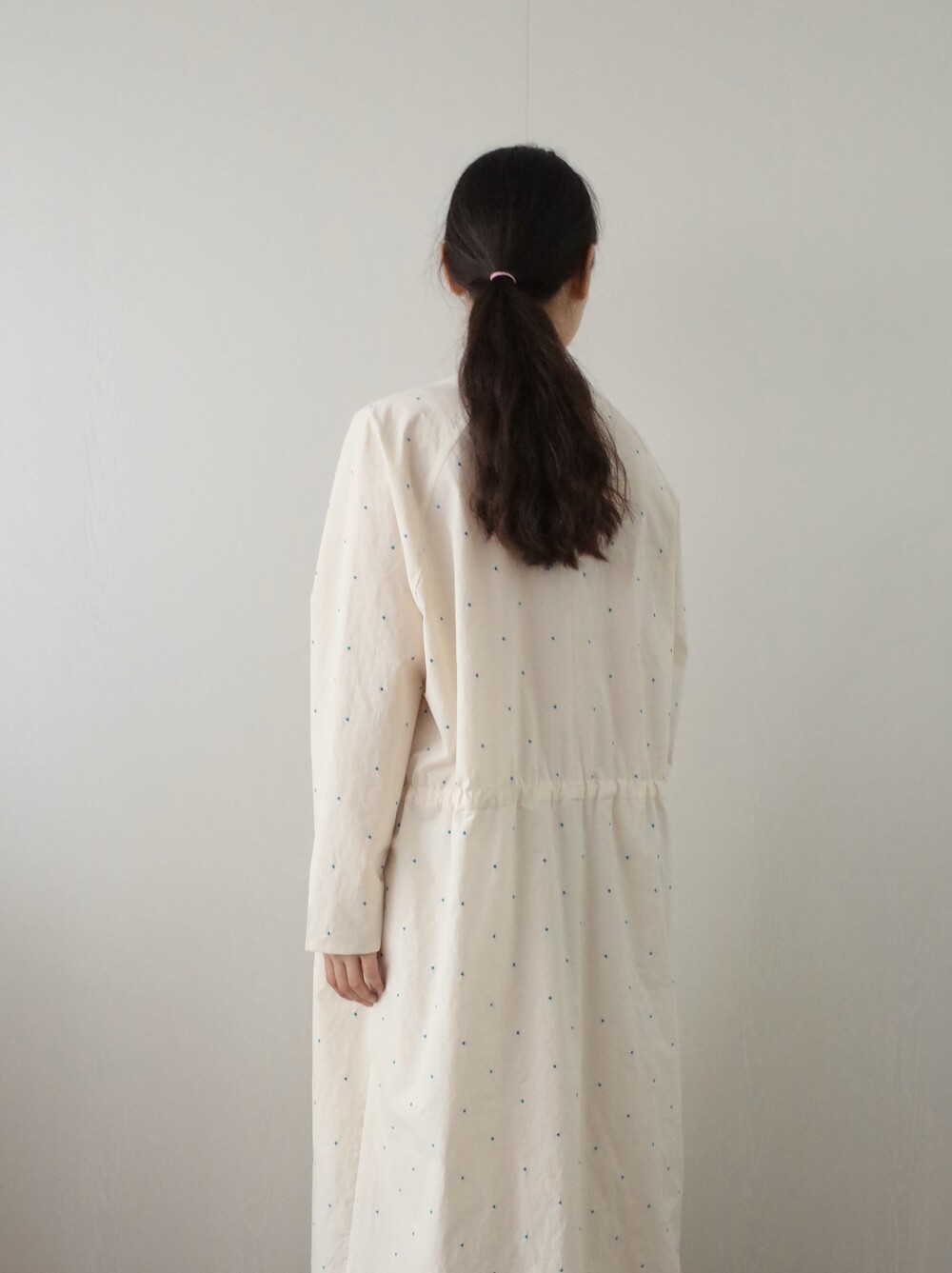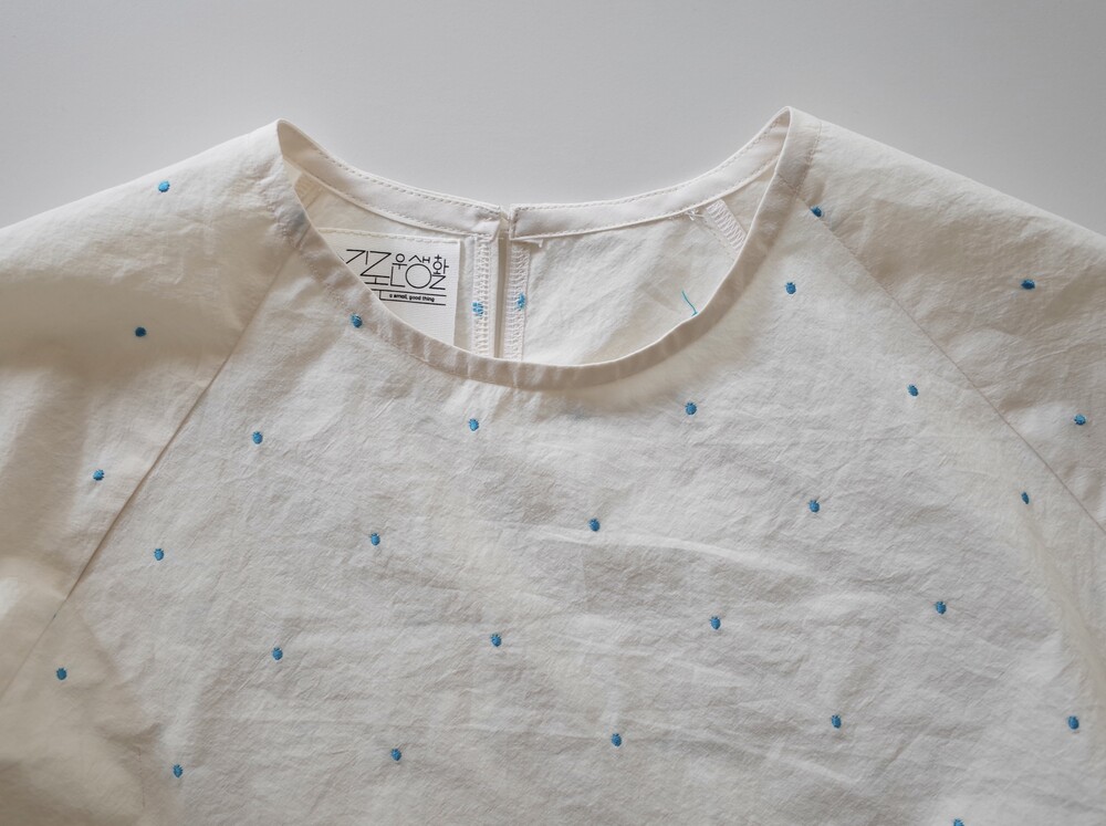 크림 컬러 바탕에 청록빛 블루 컬러의 도트 자수로 슬기로운생활에서만 만나볼 수 있는 제작 원단입니다.