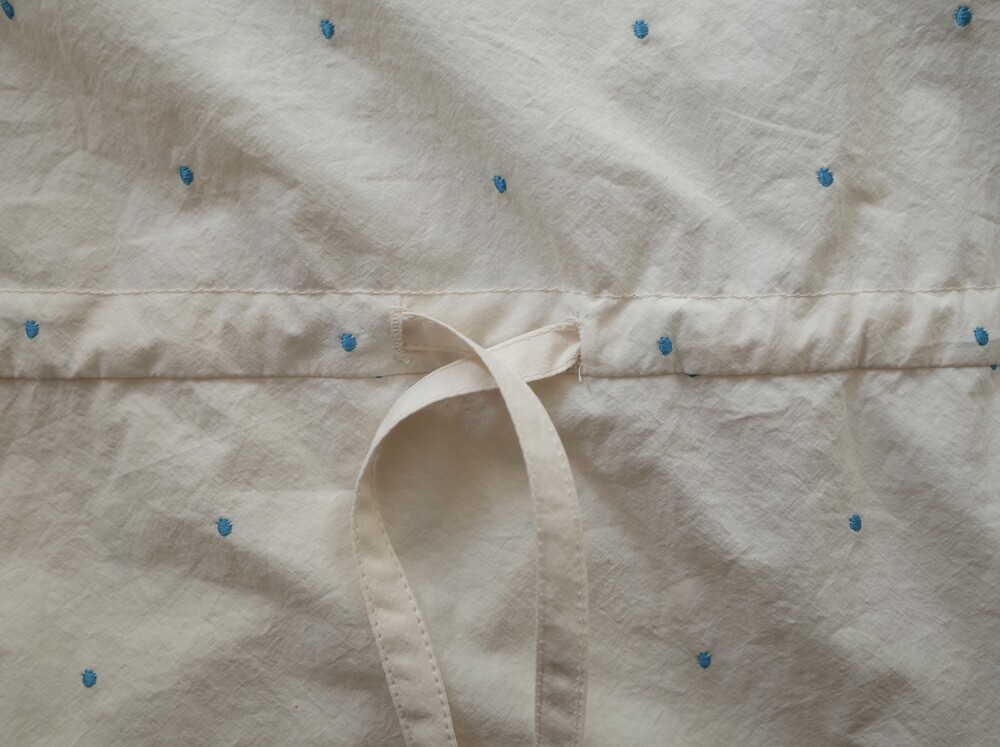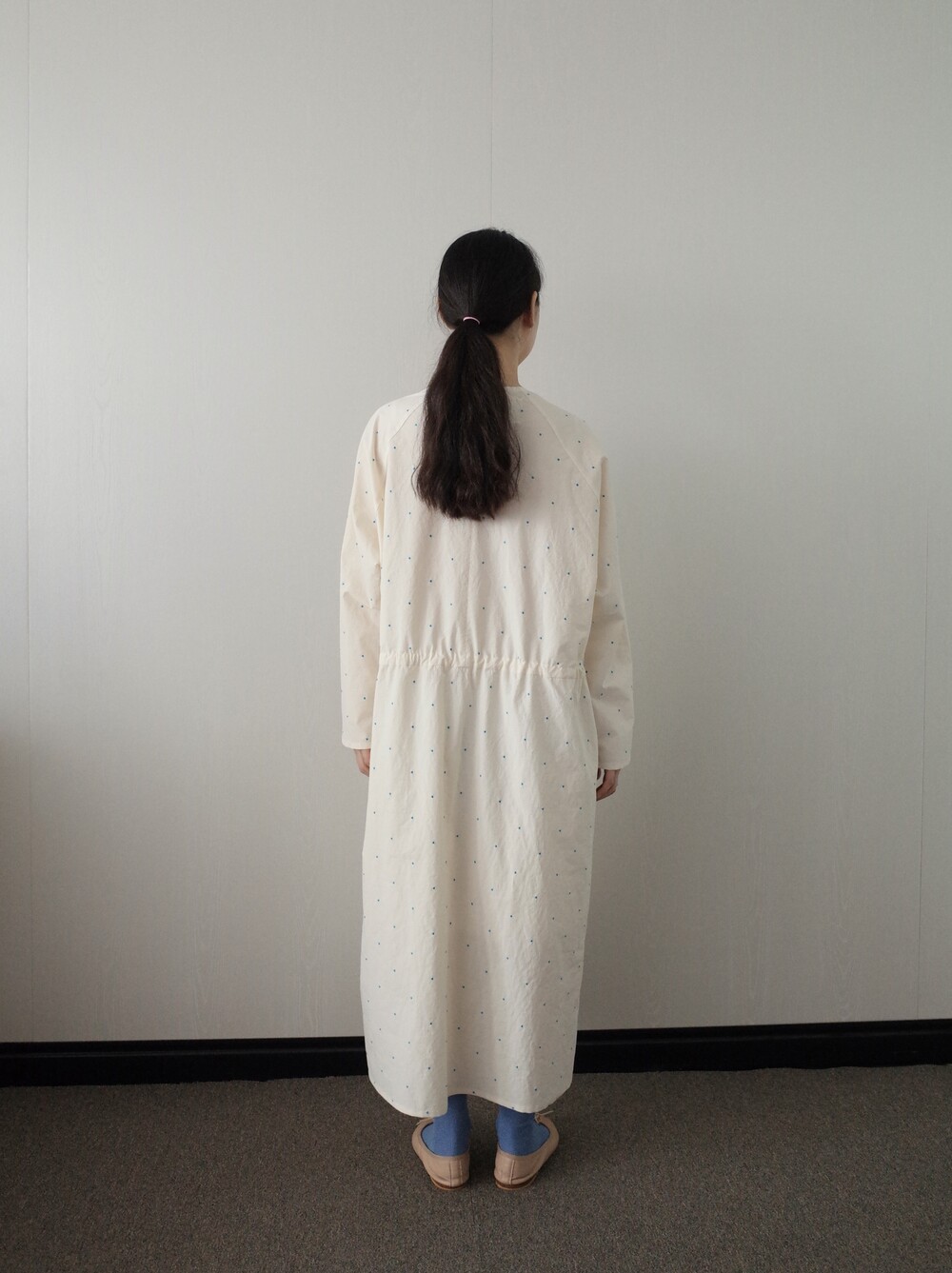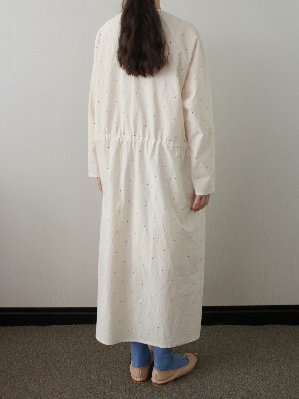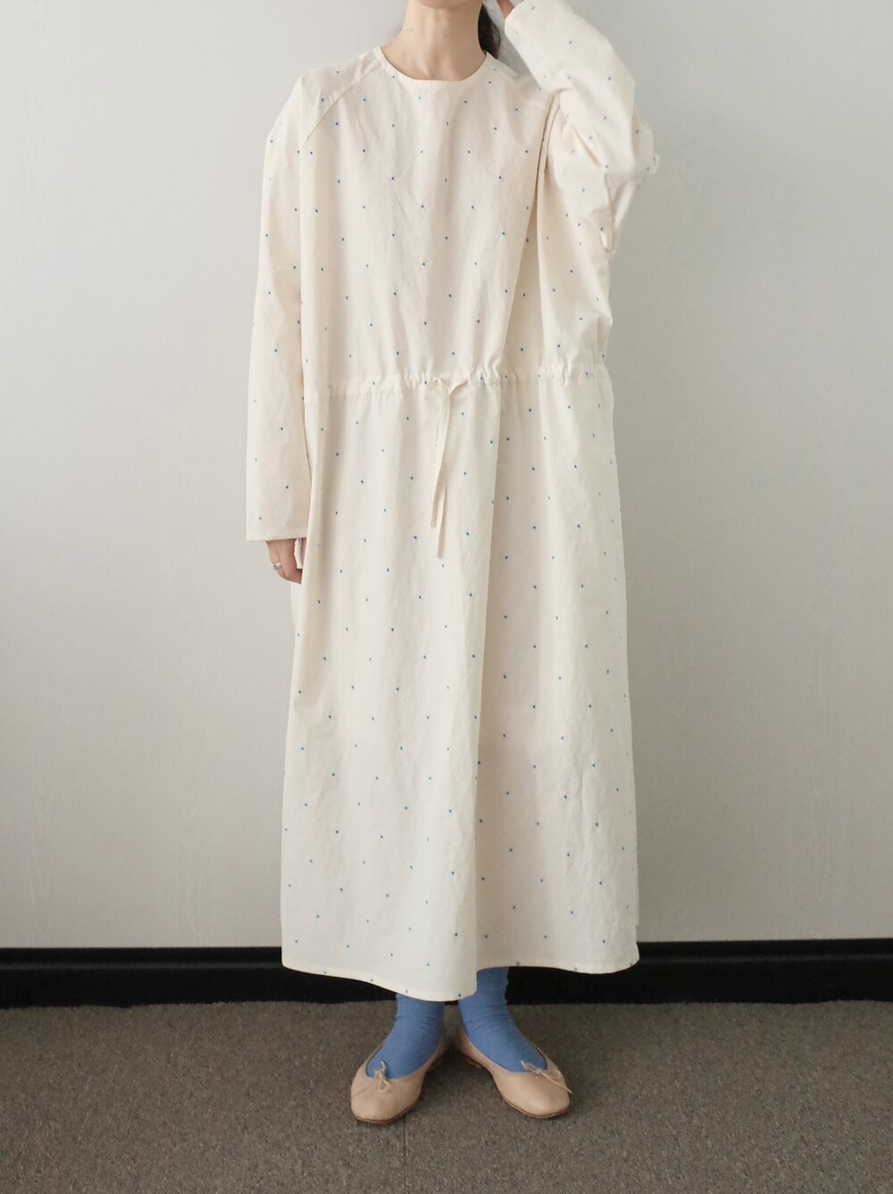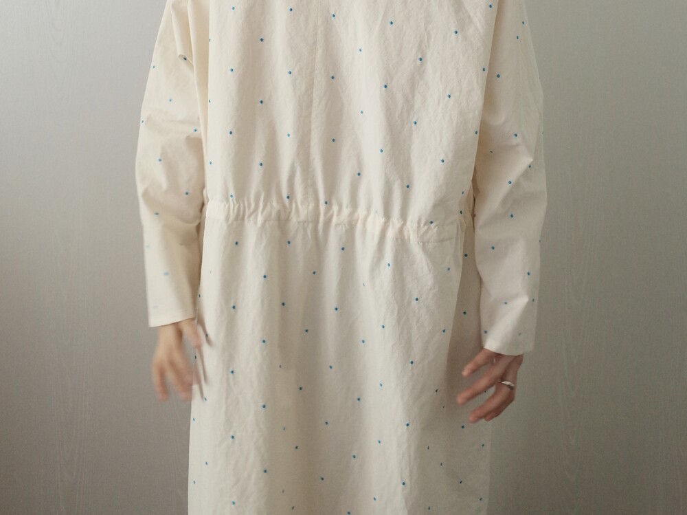 크림 컬러 바탕에 청록빛 블루 컬러의 도트 자수로 슬기로운생활에서만 만나볼 수 있는 제작 원단입니다.