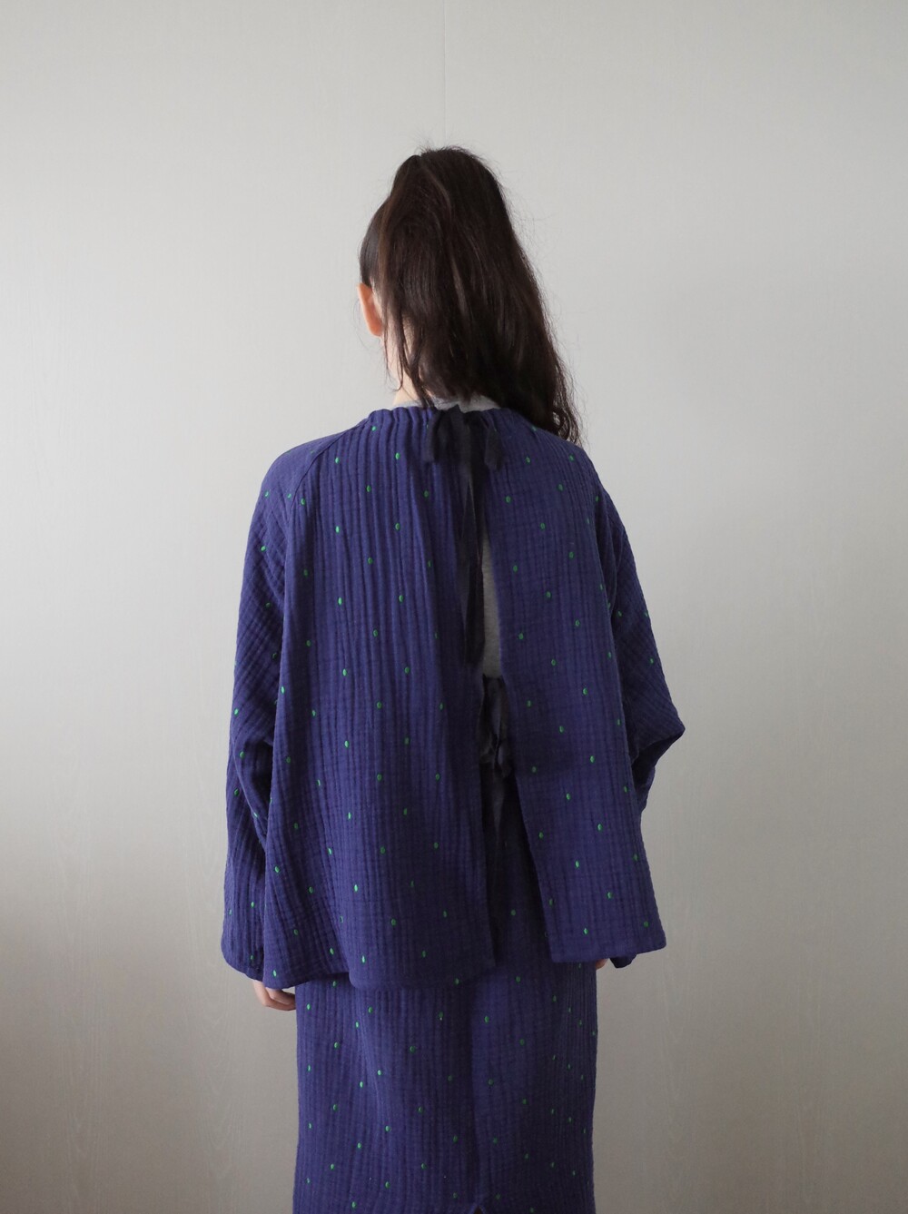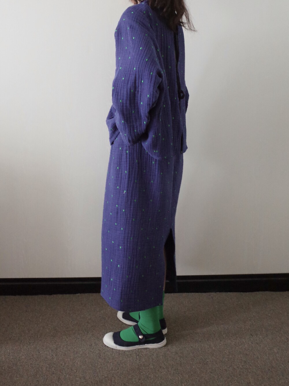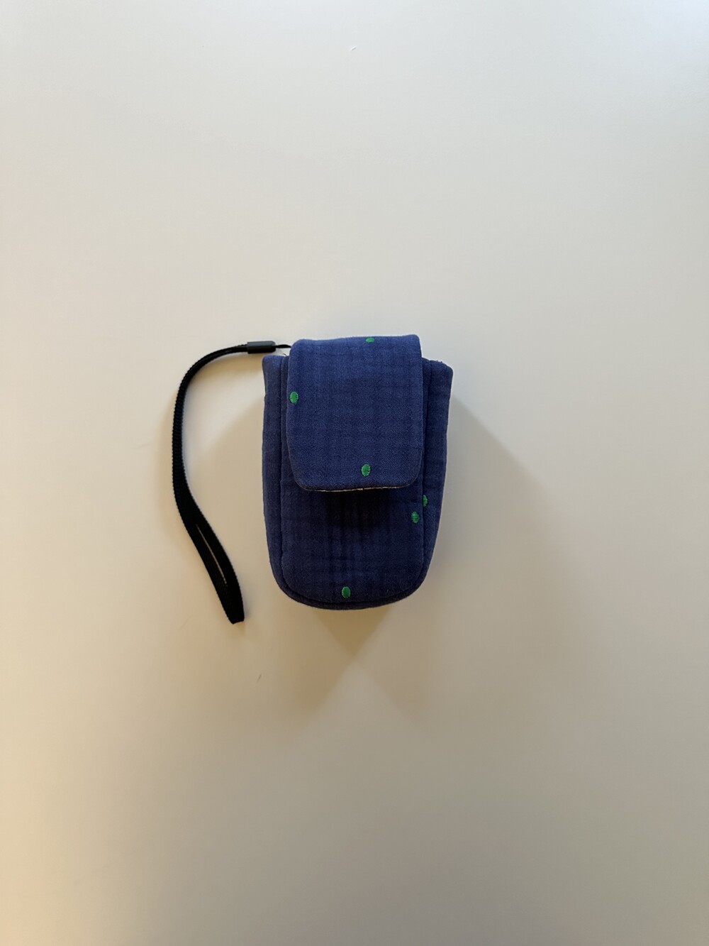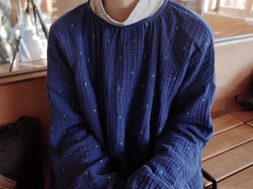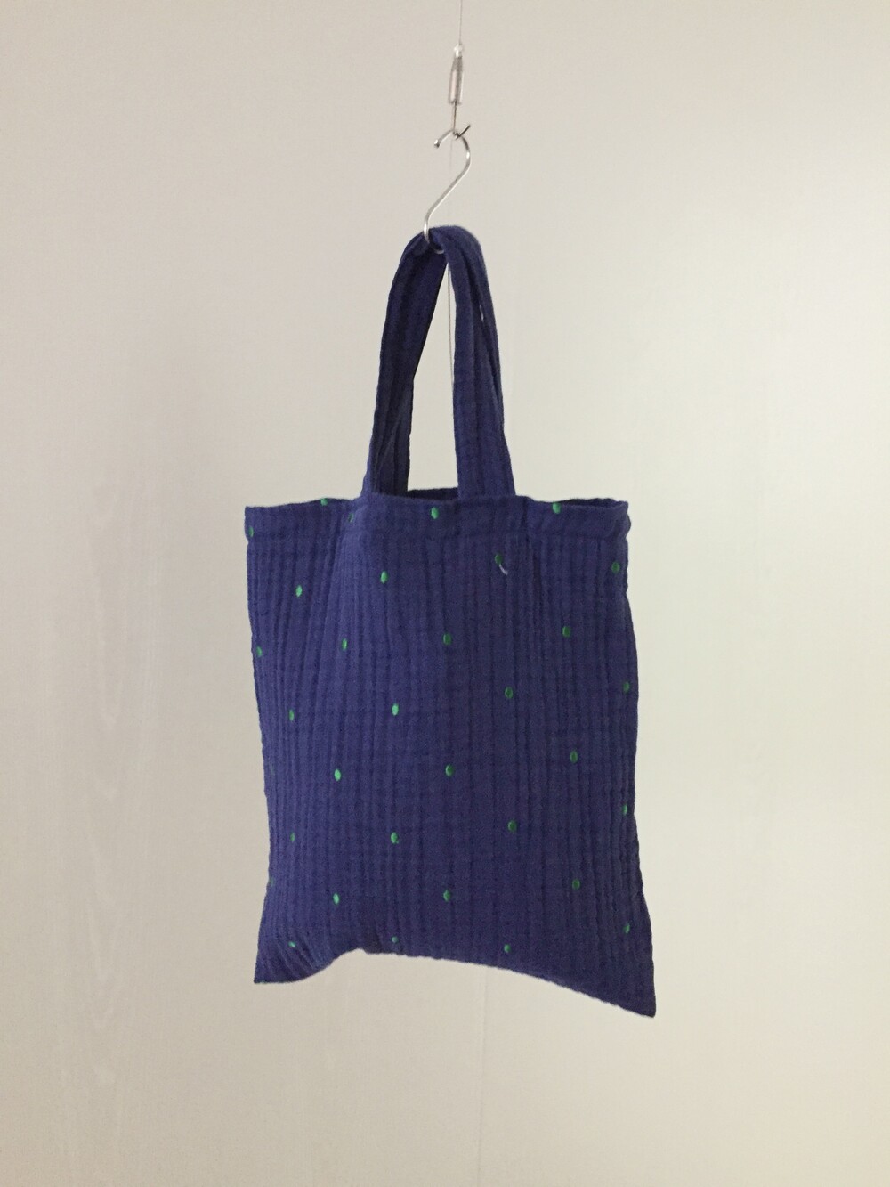 짙은 블루 컬러에 그린 컬러의 도트 자수로 유니크합니다.