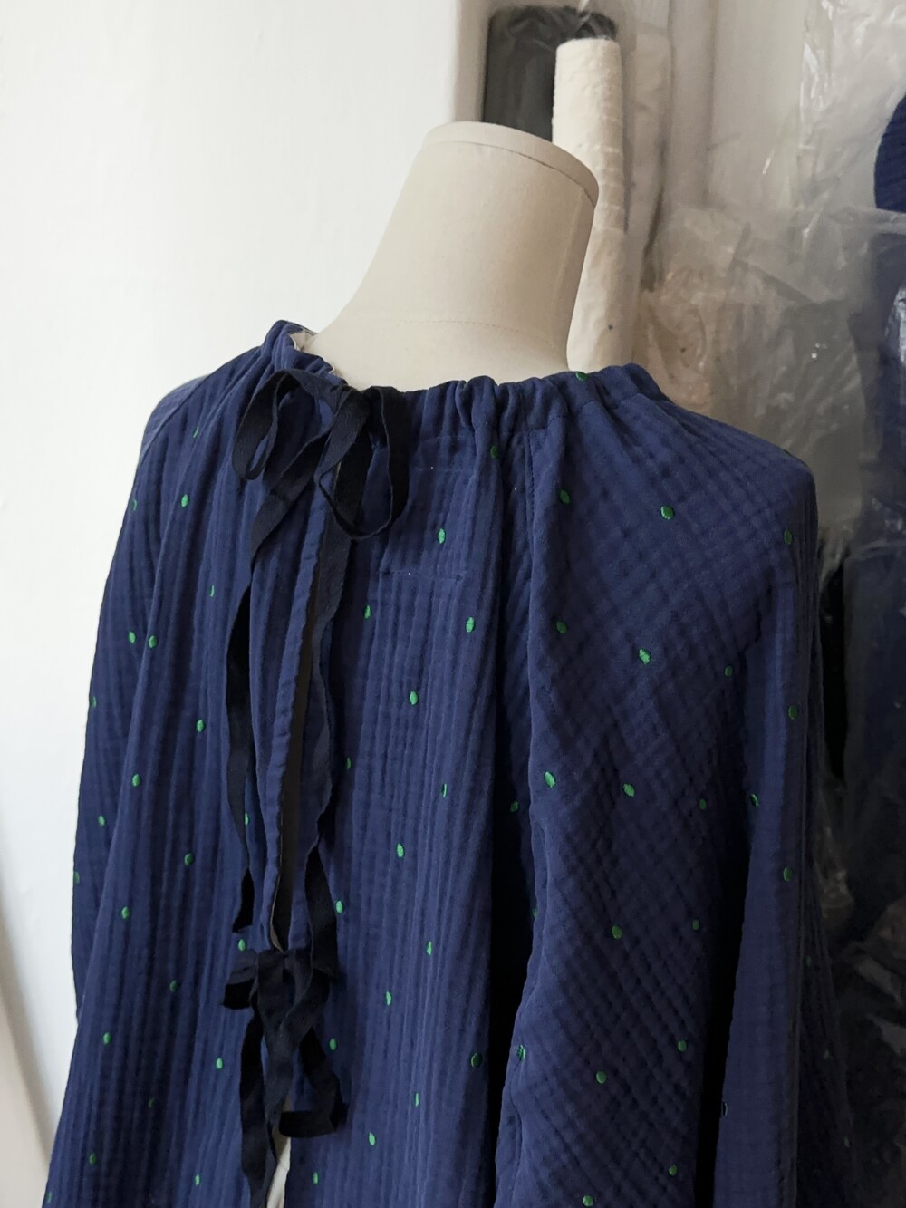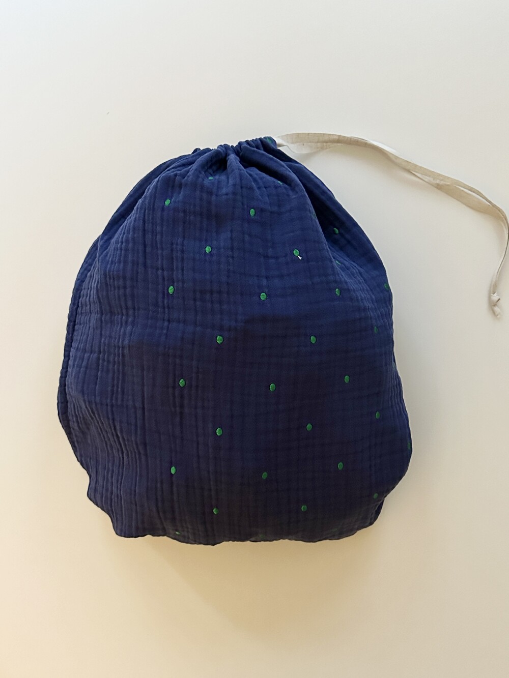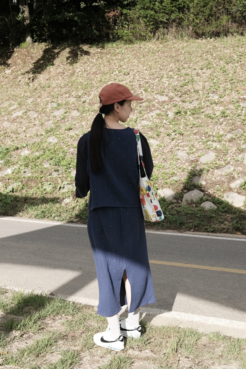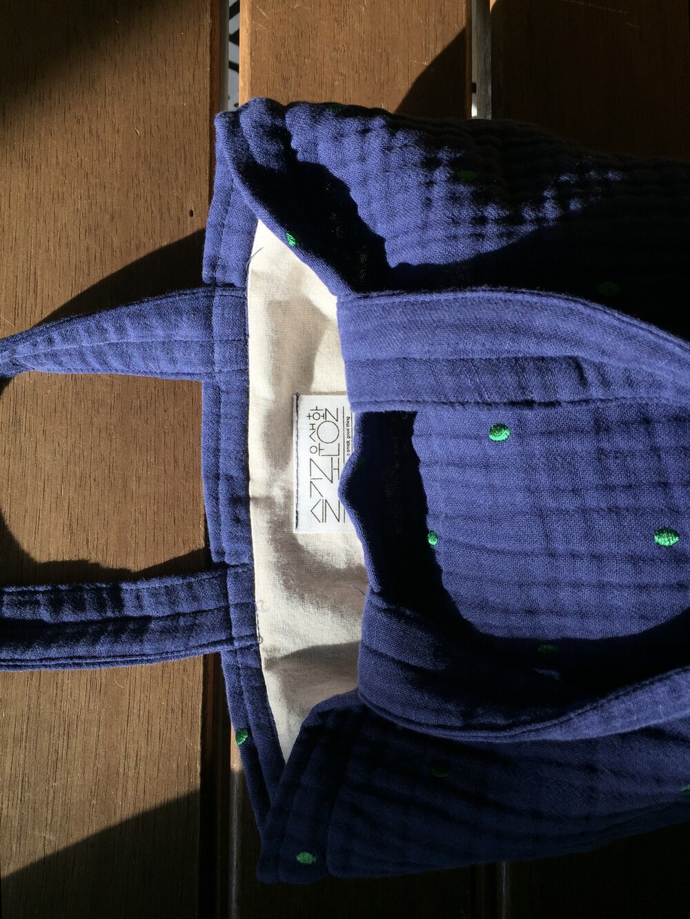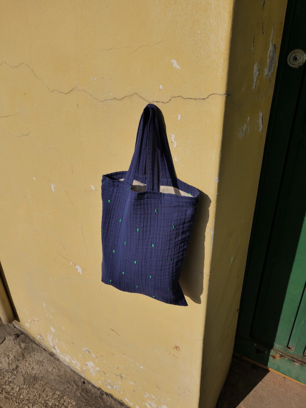짙은 블루 컬러에 그린 컬러의 도트 자수로 유니크합니다.