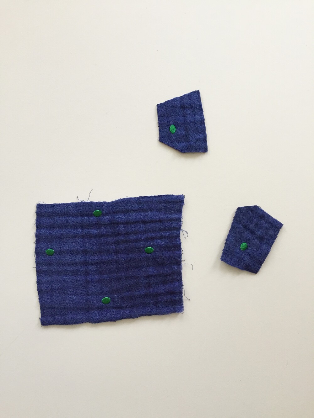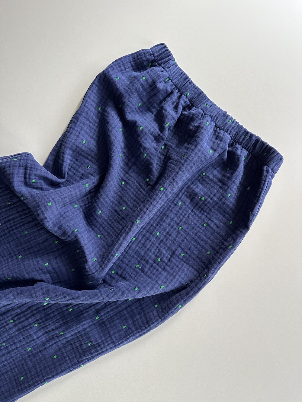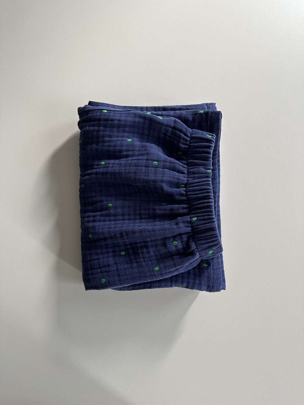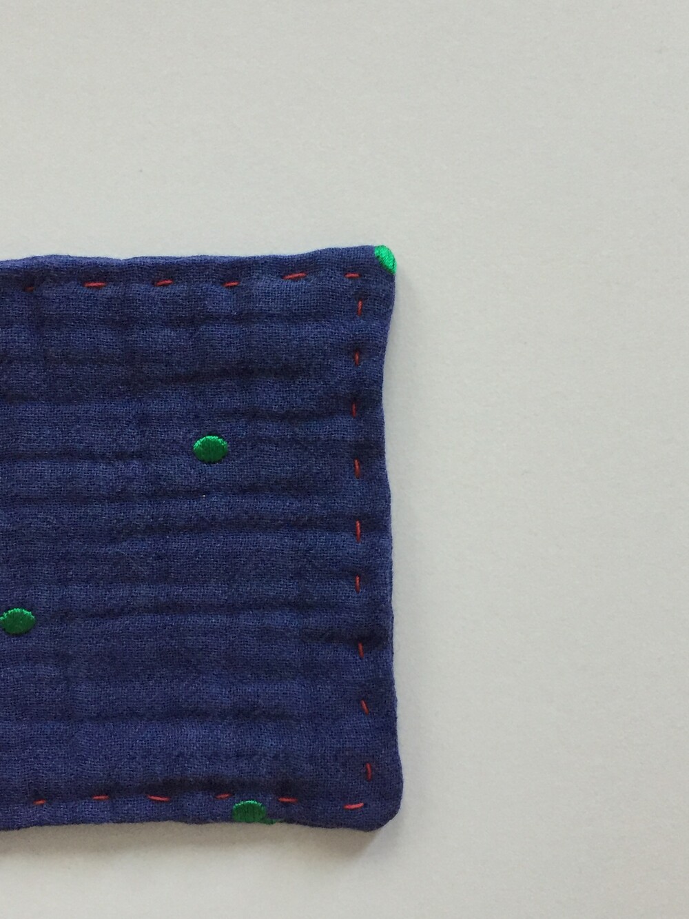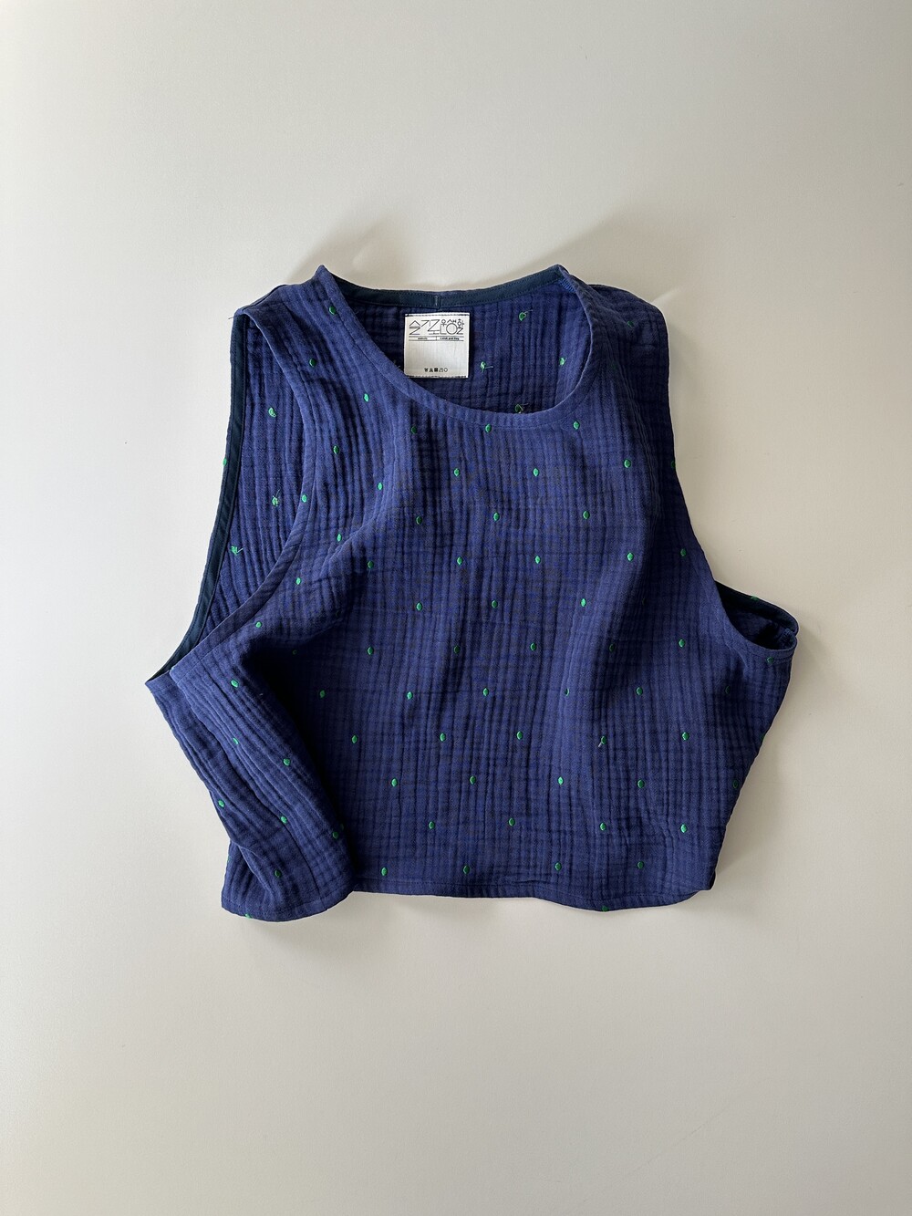 짙은 블루 컬러에 그린 컬러의 도트 자수로 유니크합니다.