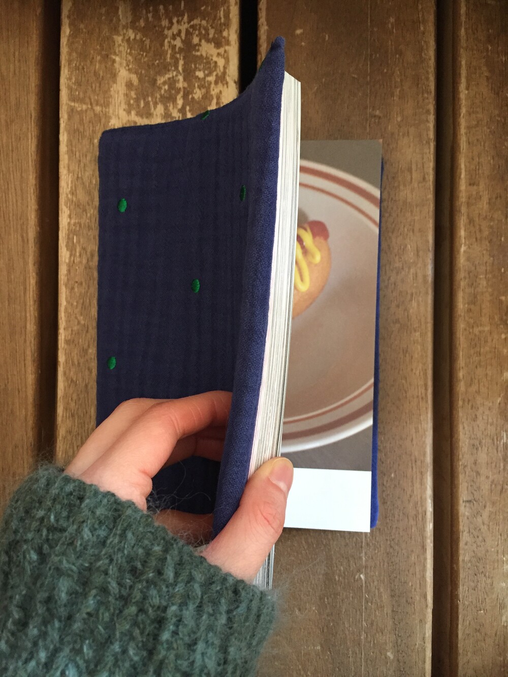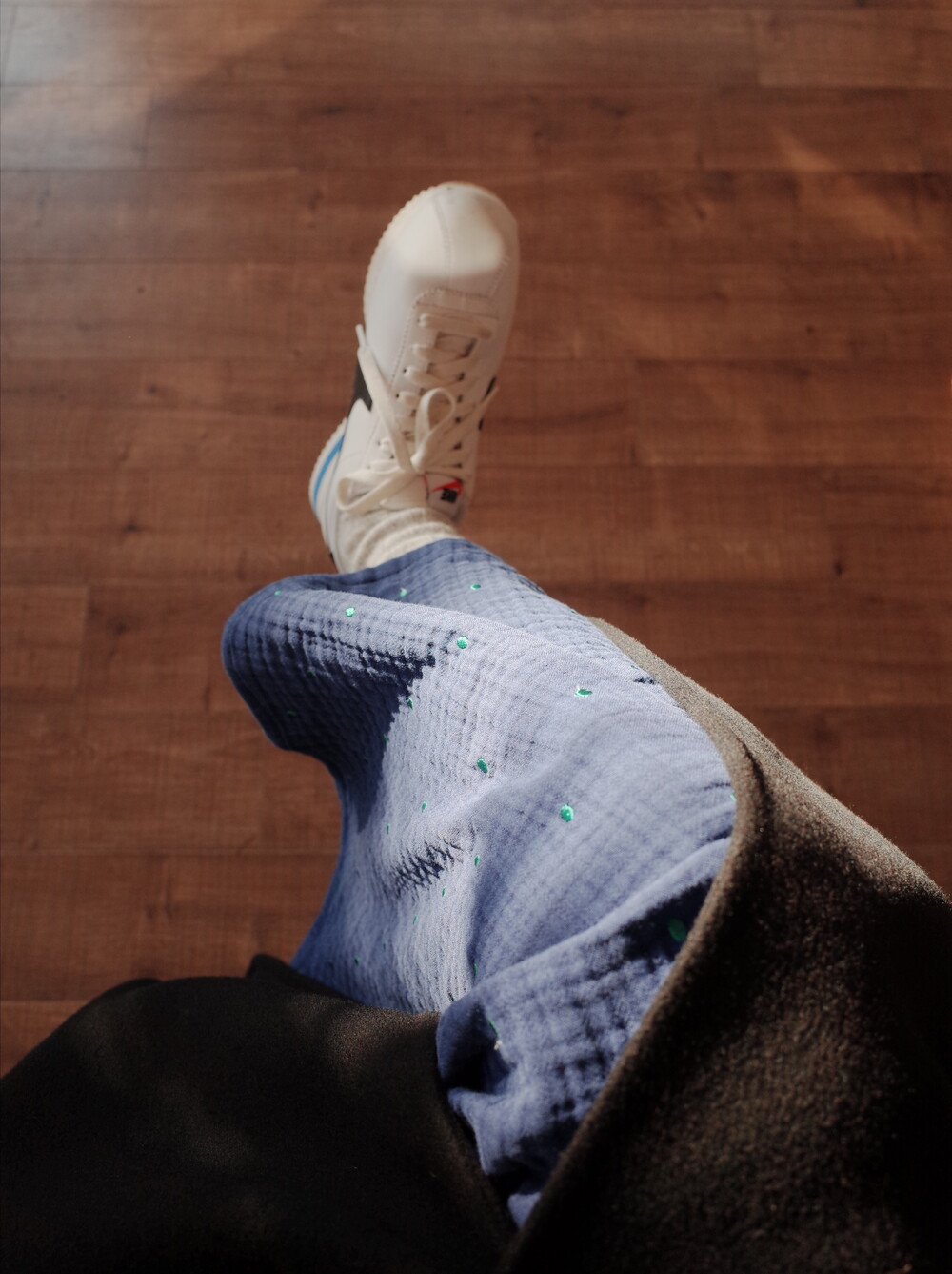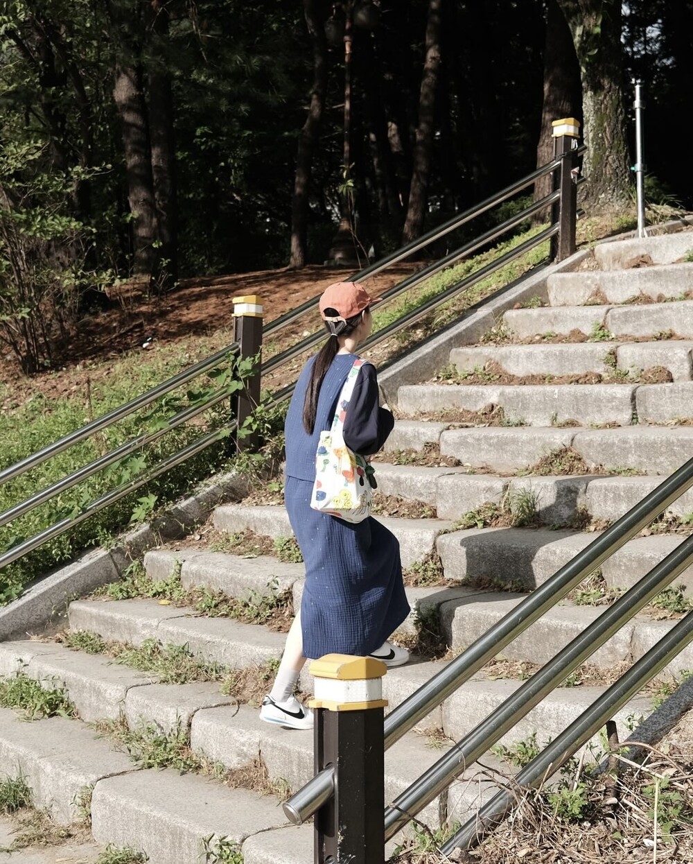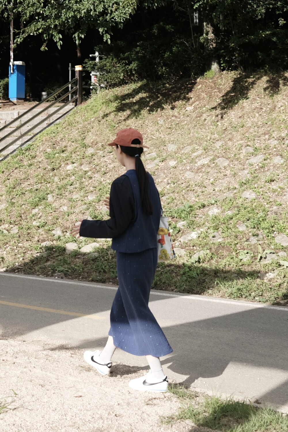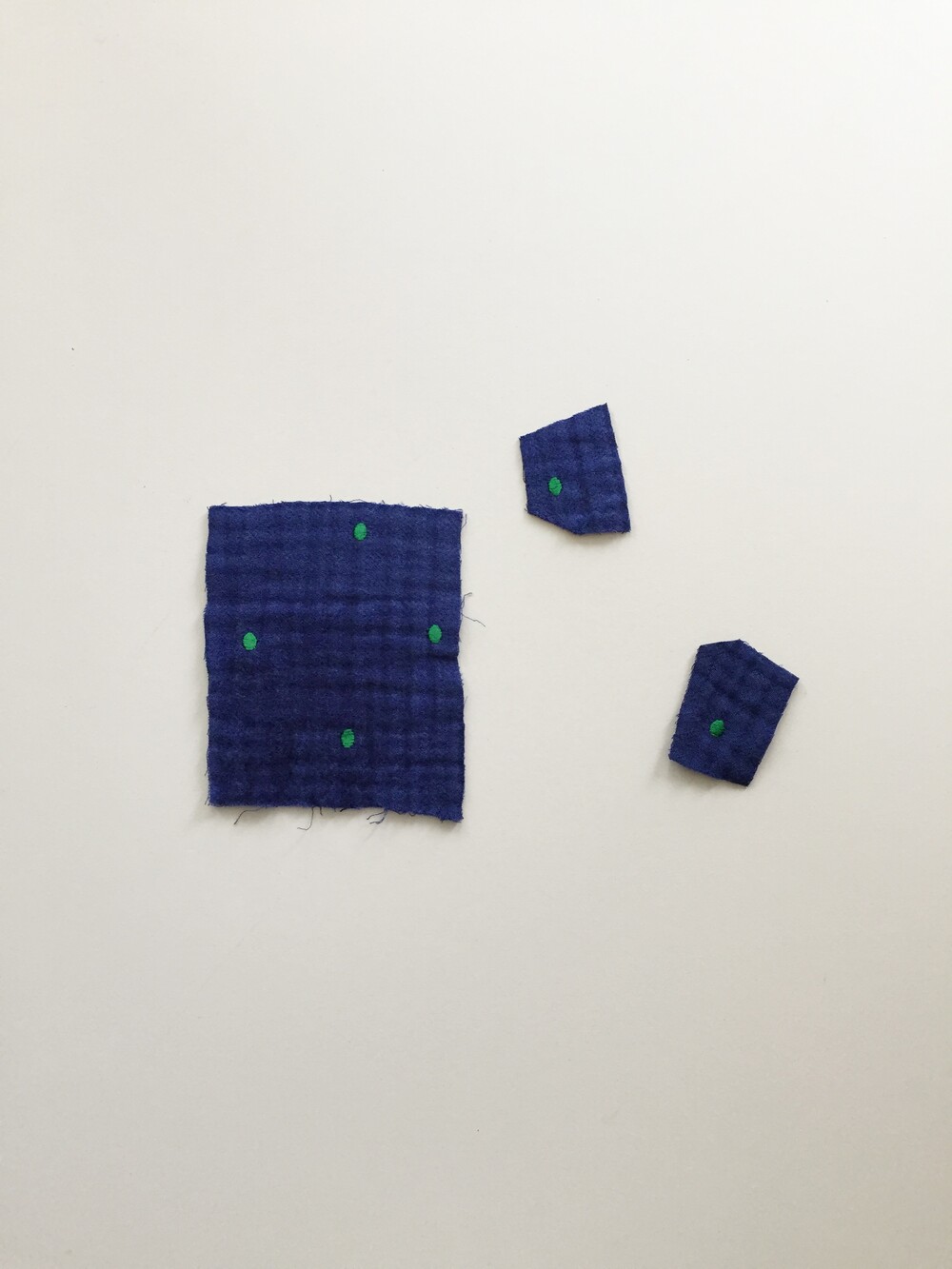 짙은 블루 컬러에 그린 컬러의 도트 자수로 유니크합니다.