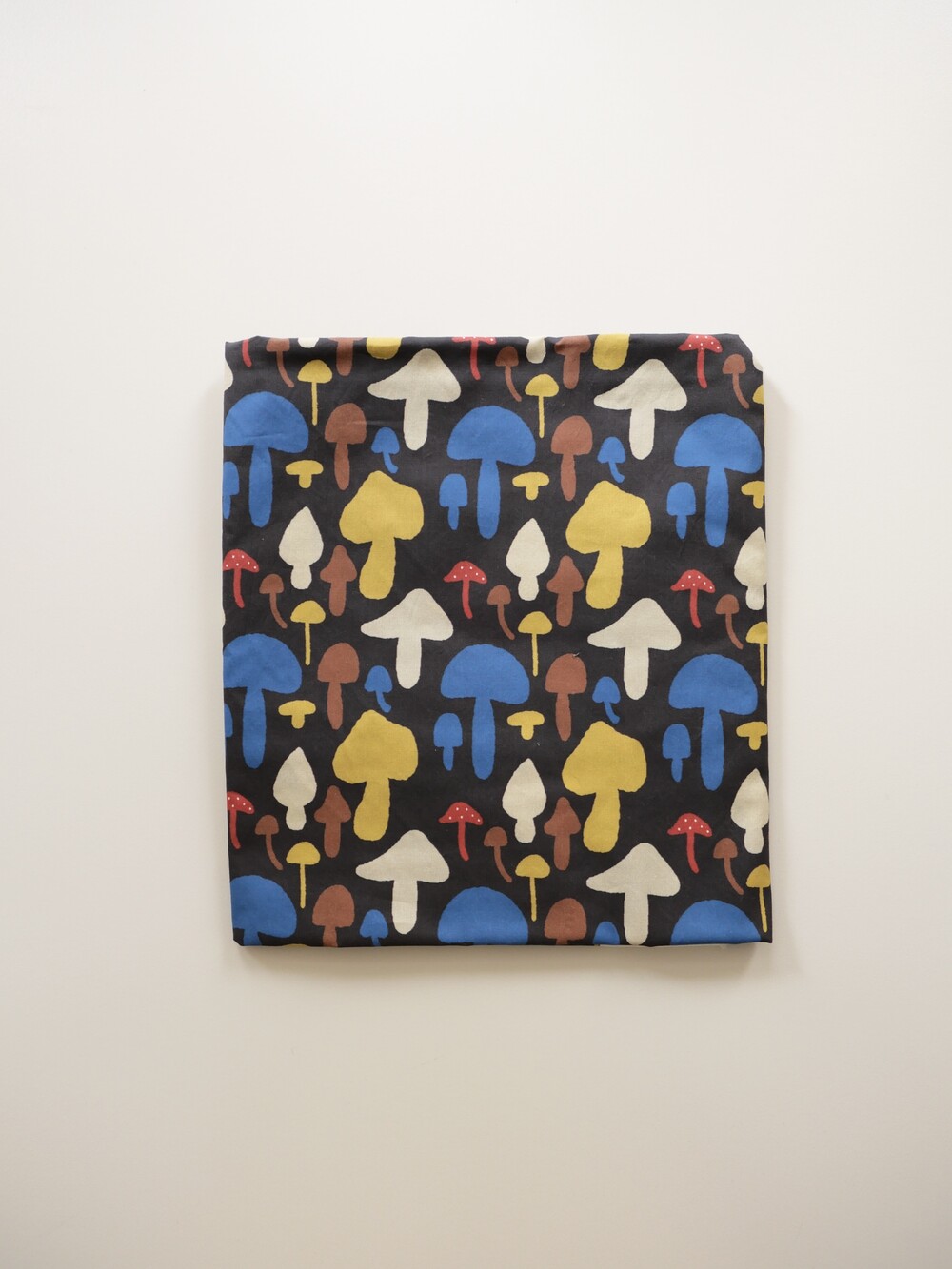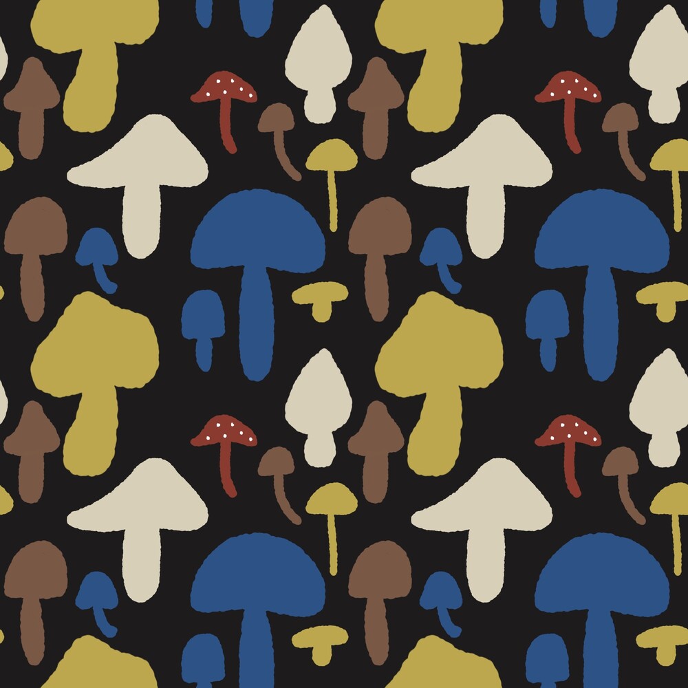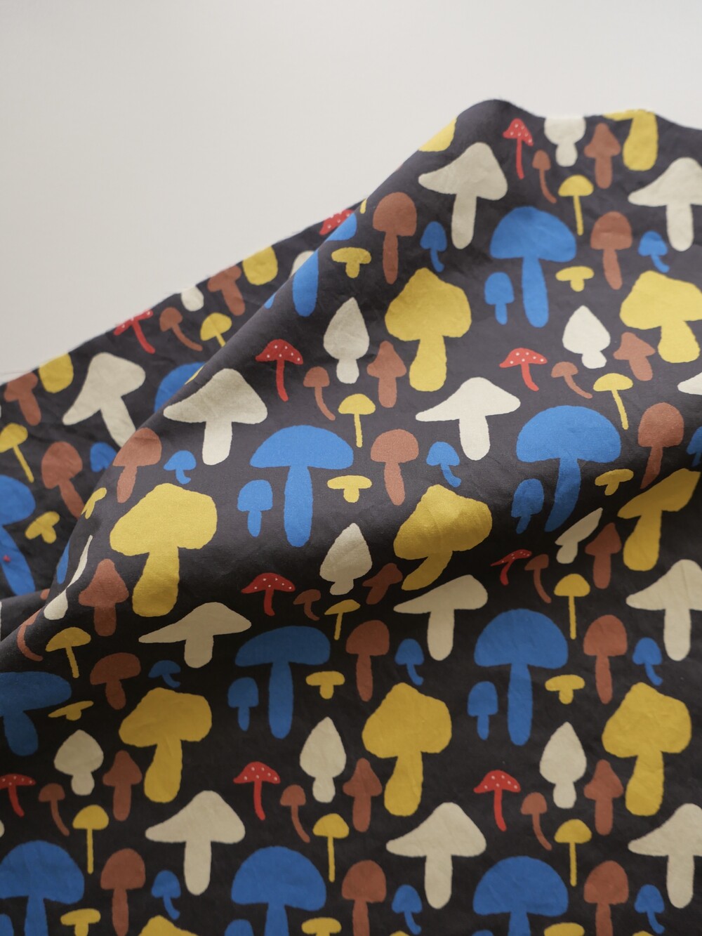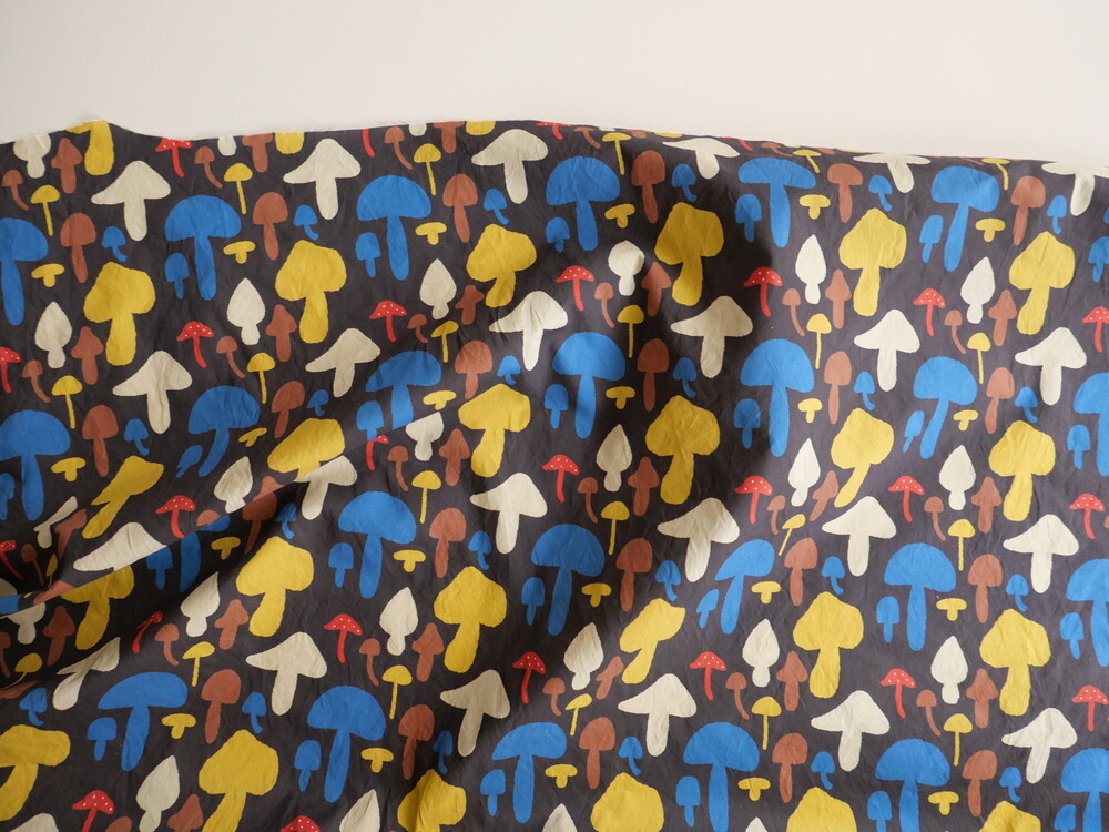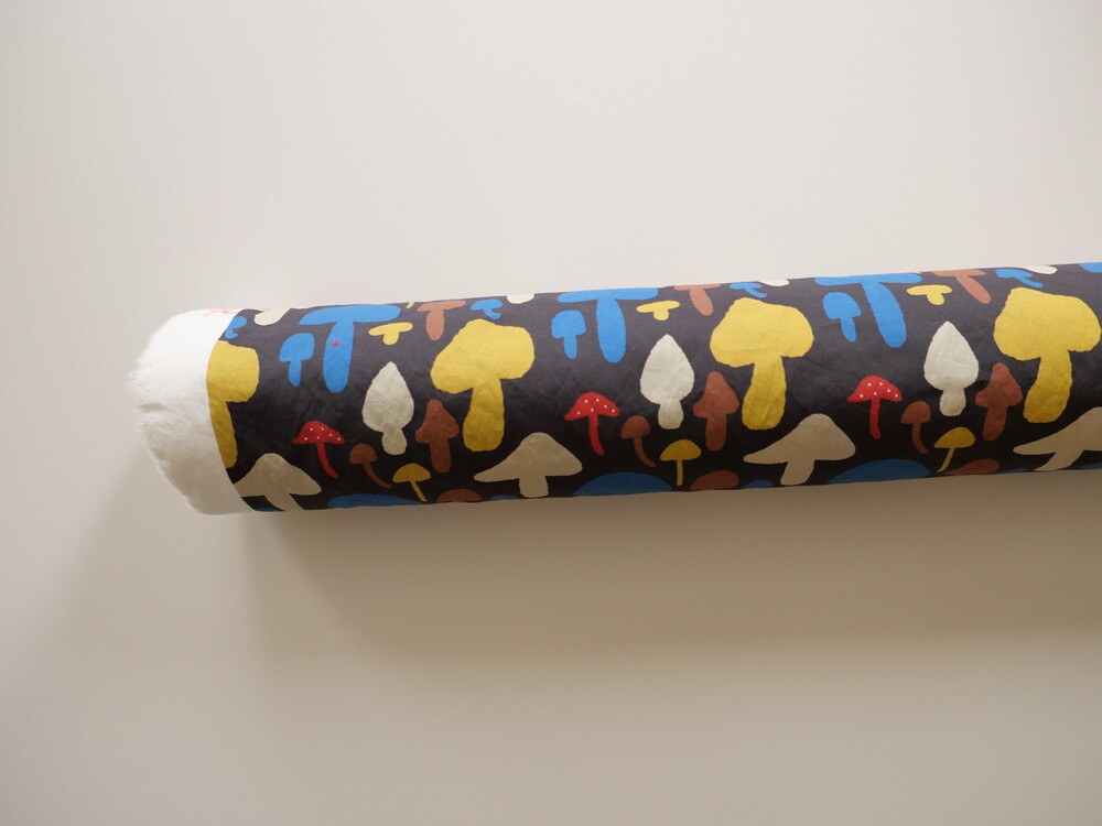 다양한 컬러와 모양의 버섯이 그려져 있는 패브릭입니다.