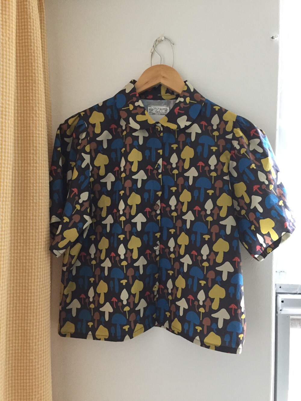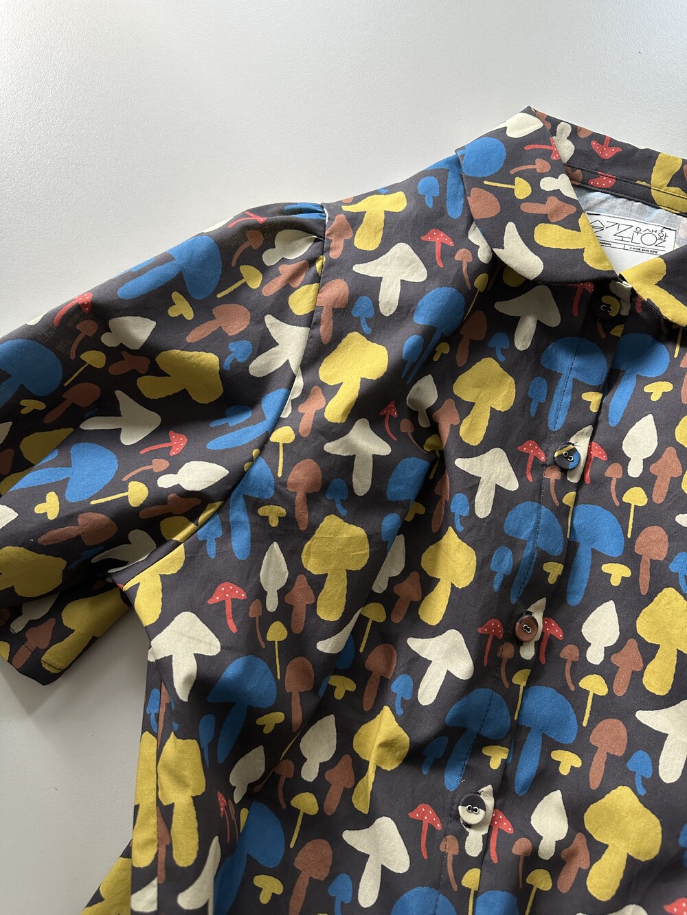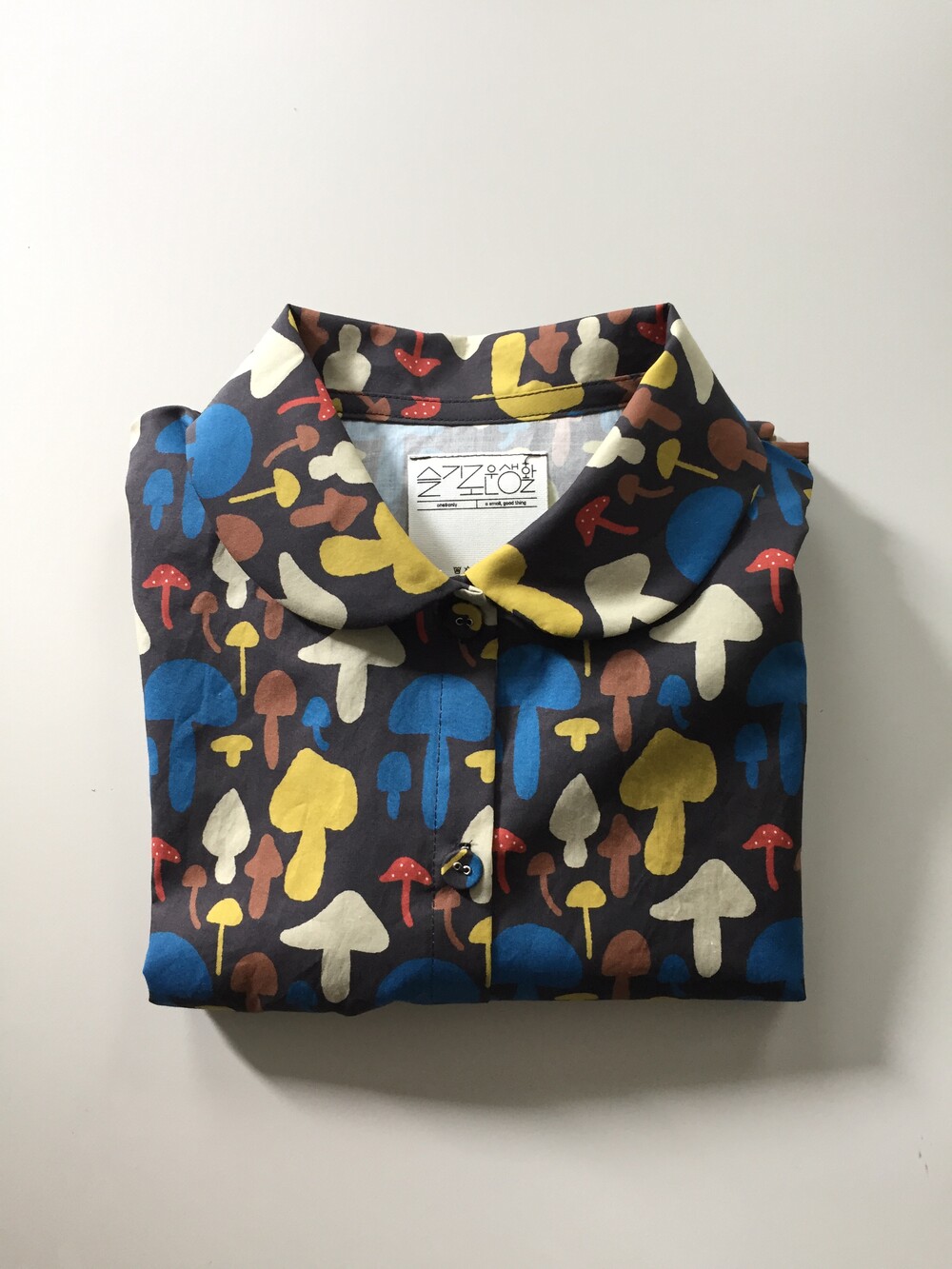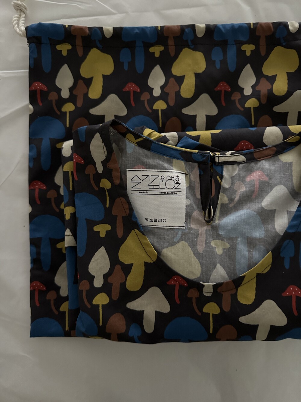 다양한 컬러와 모양의 버섯이 그려져 있는 패브릭입니다.