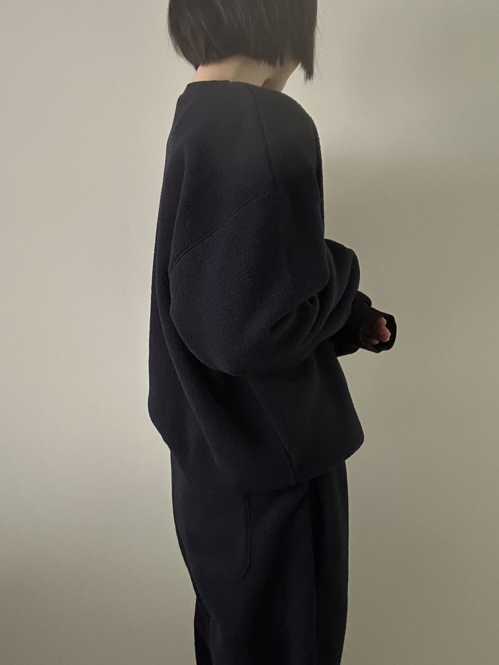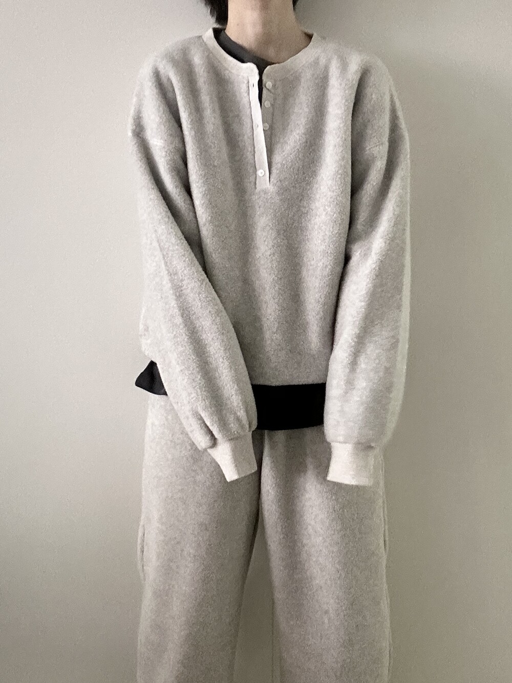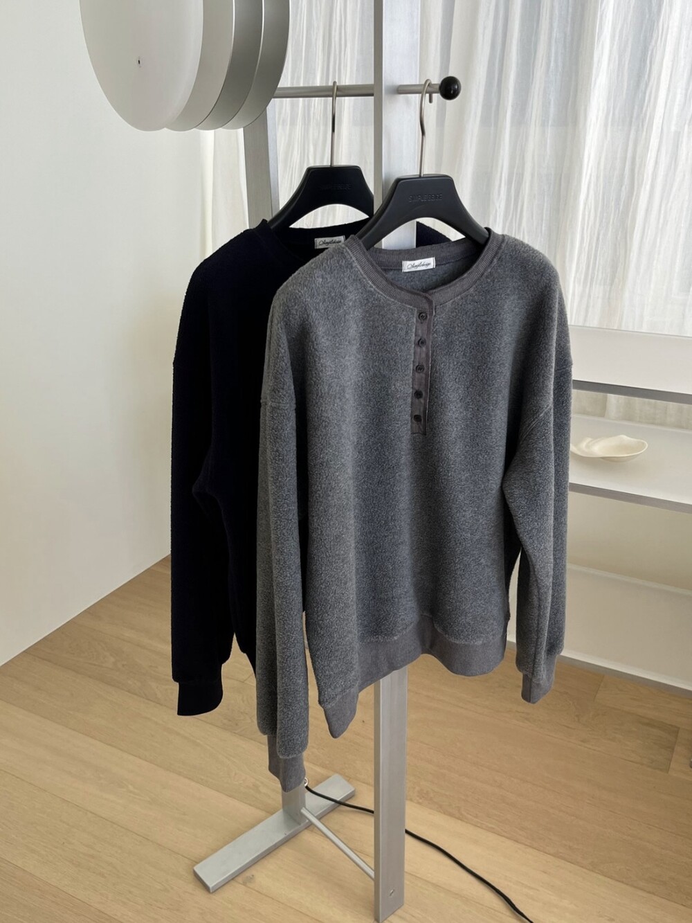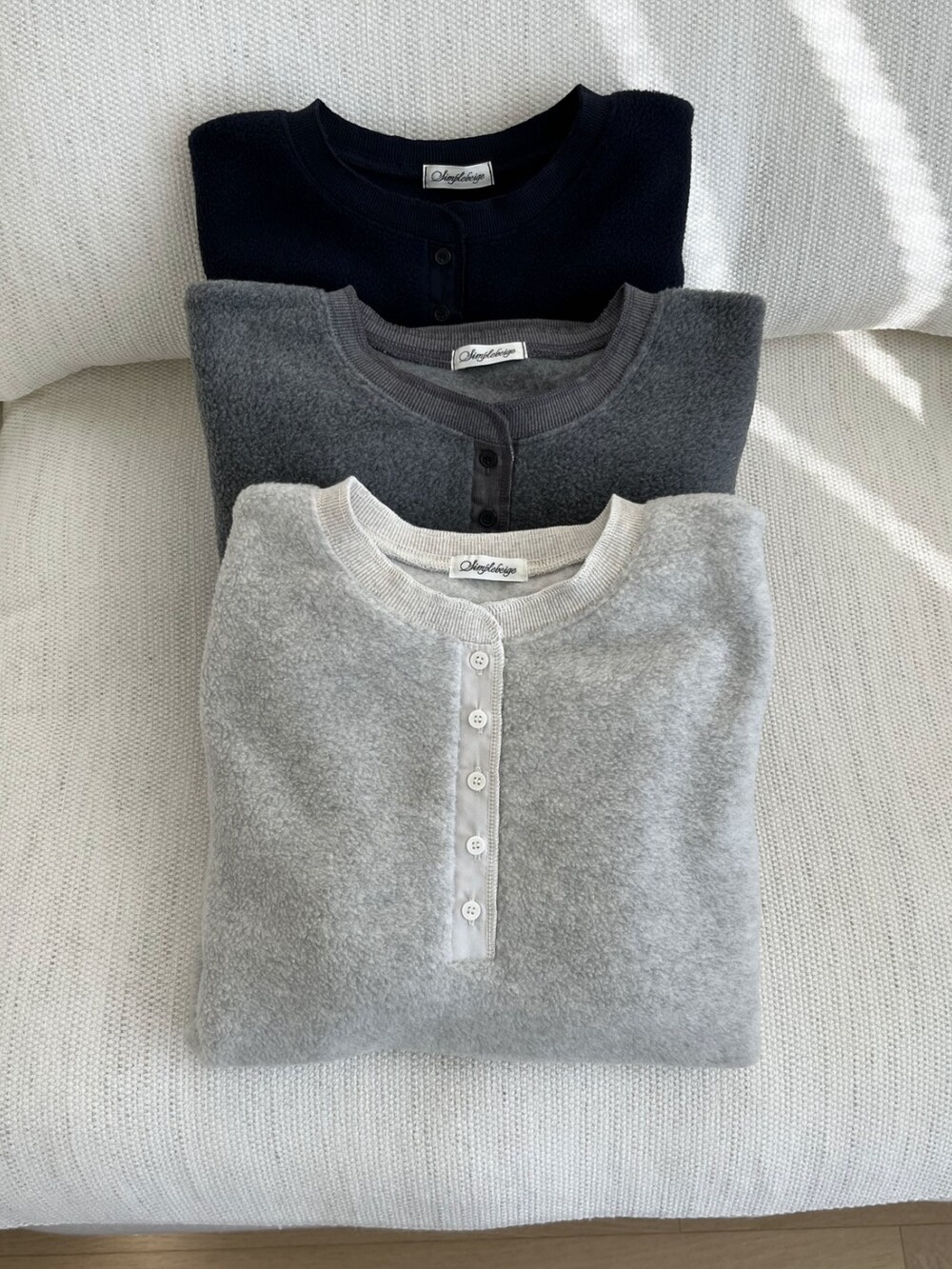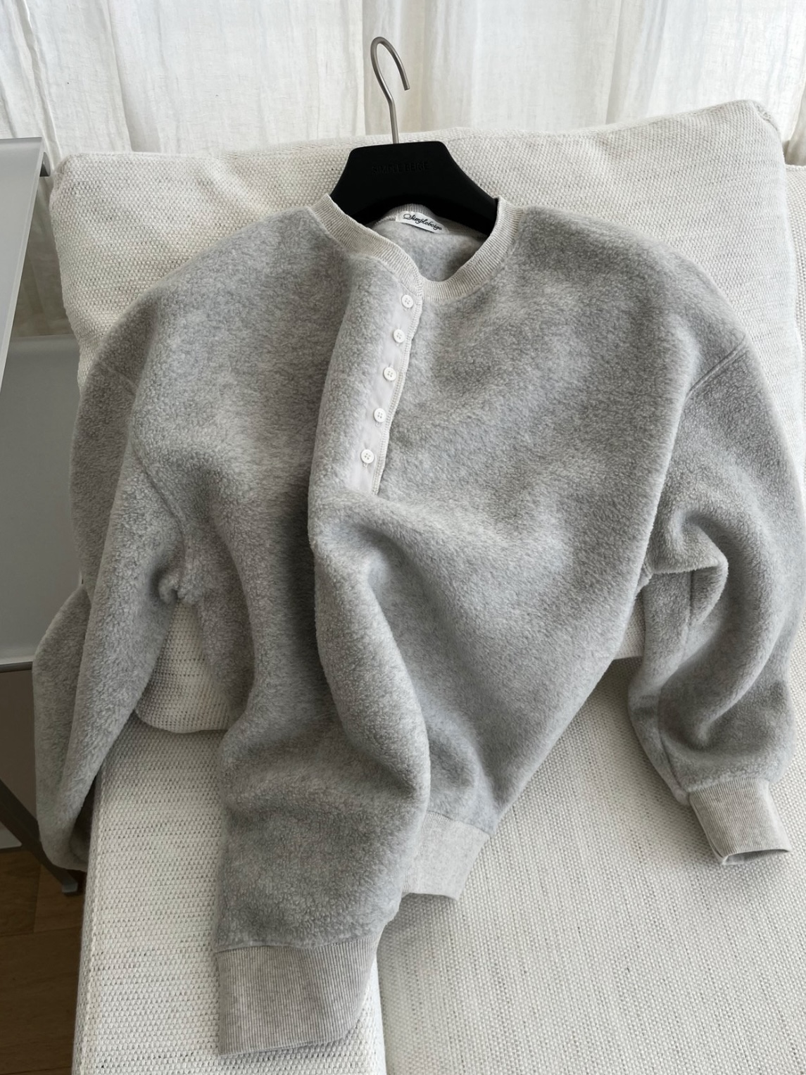 포근하고 가벼운 플리스 원단으로 제작된 웜 맨투맨입니다.
