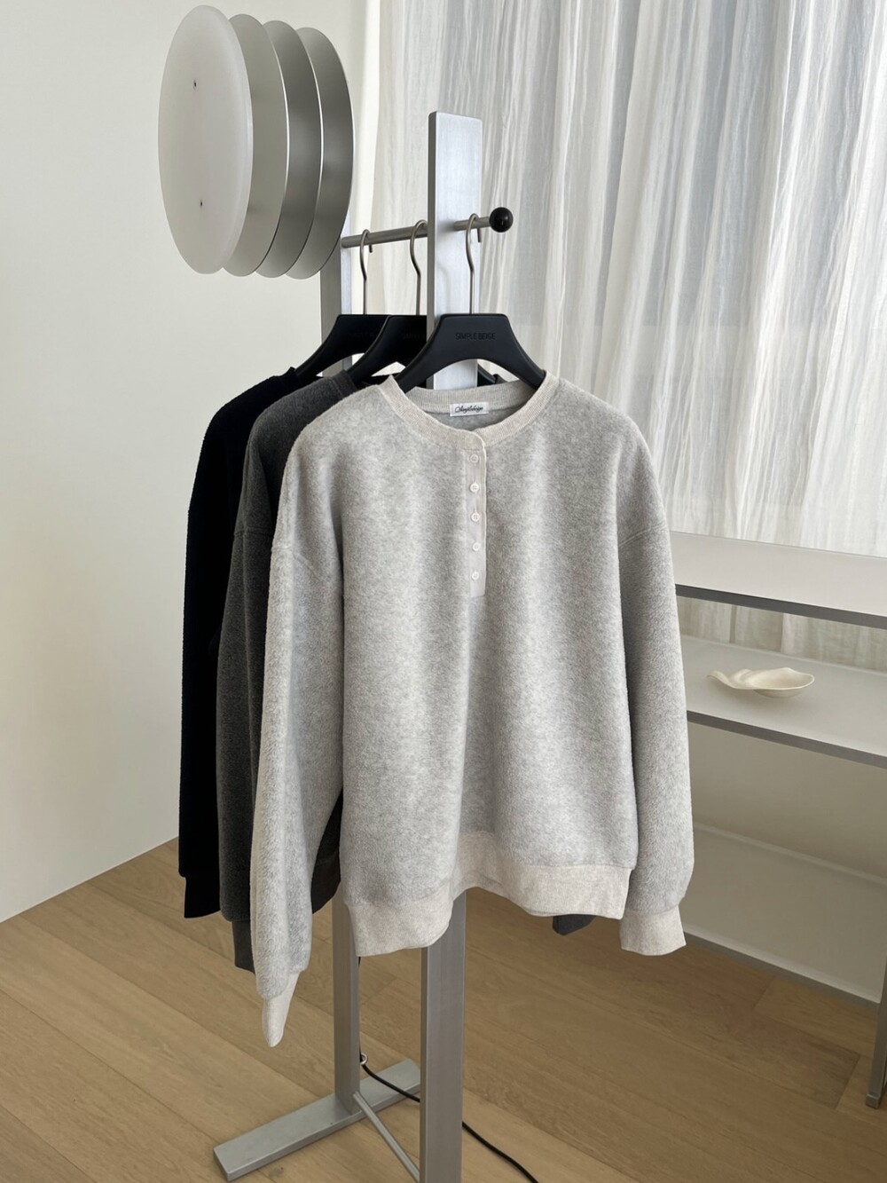 스판이 더해진 원단으로 움직임에 따라 자연스럽게 늘어나 답답함 없이 편안하며, 전체적으로 여유 있는 베이직 핏이라 레이어드용으로도 제격이에요.