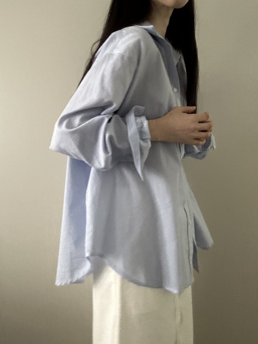 일반적으로 셔츠로 나오는 코튼 소재와는 다르게 트윌면처럼 결이 살아있고 사각거리는 느낌이 아닌 부드럽고 유연한 느낌으로 몸에 맞게 흐르는 핏이 멋스럽습니다.