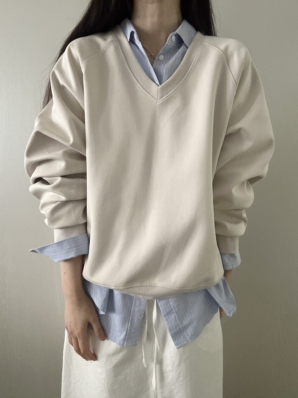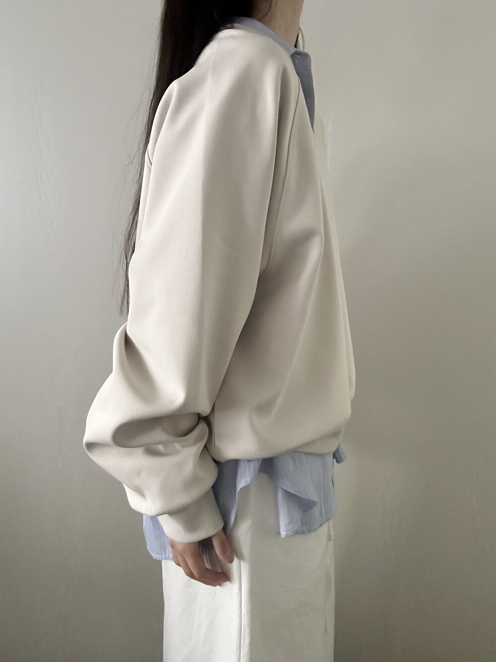 큼직하지 않은 카라가 단정해 보이며 전체적인 품 , 암홀 라인이 여유 있어 체형에 구애 없이 추천합니다.