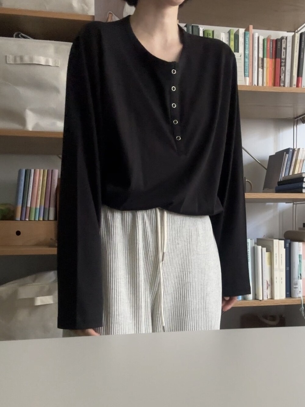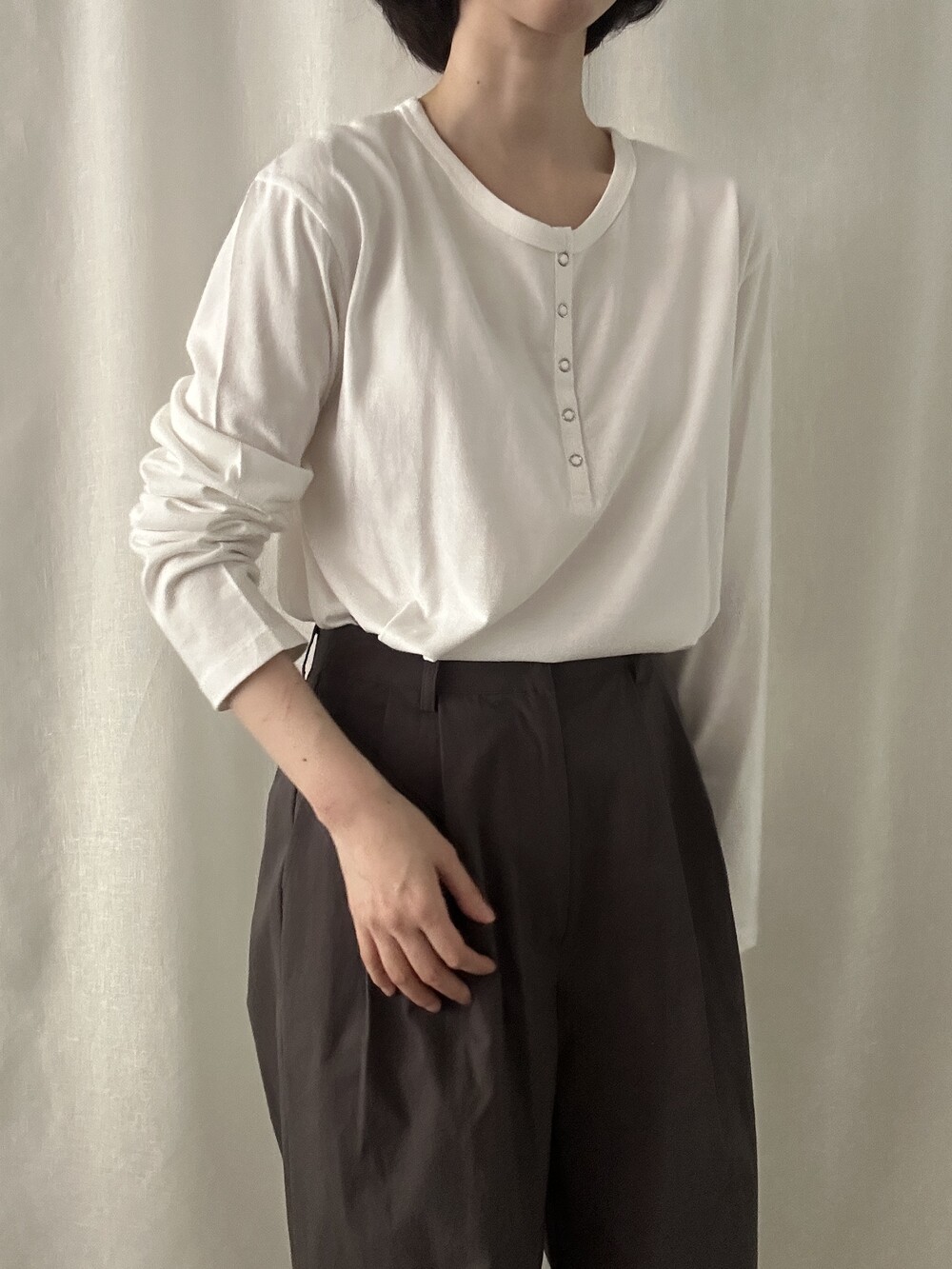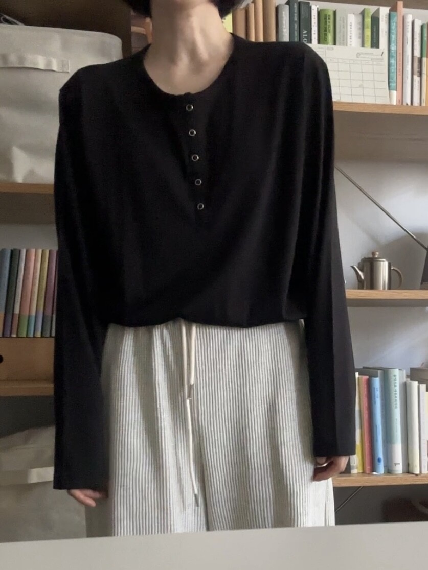 탄탄하면서도 적당히 유연함이 느껴지는 소재는 단독으로 입기 좋으며 겨울엔 가디건 이너로 활용하기 좋습니다.
