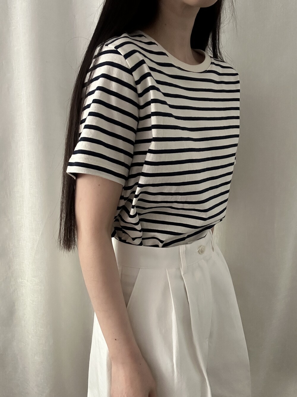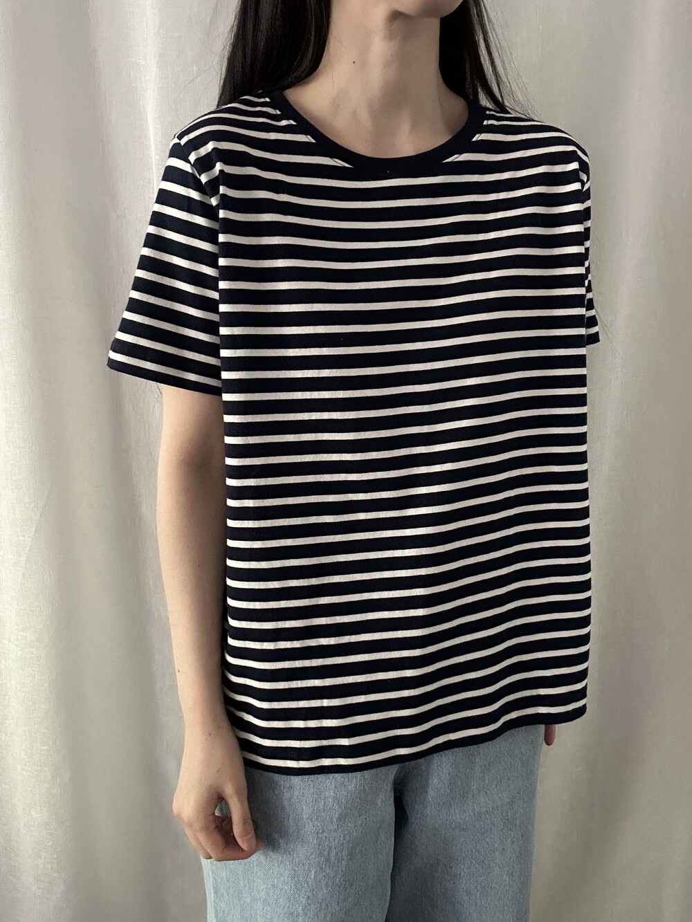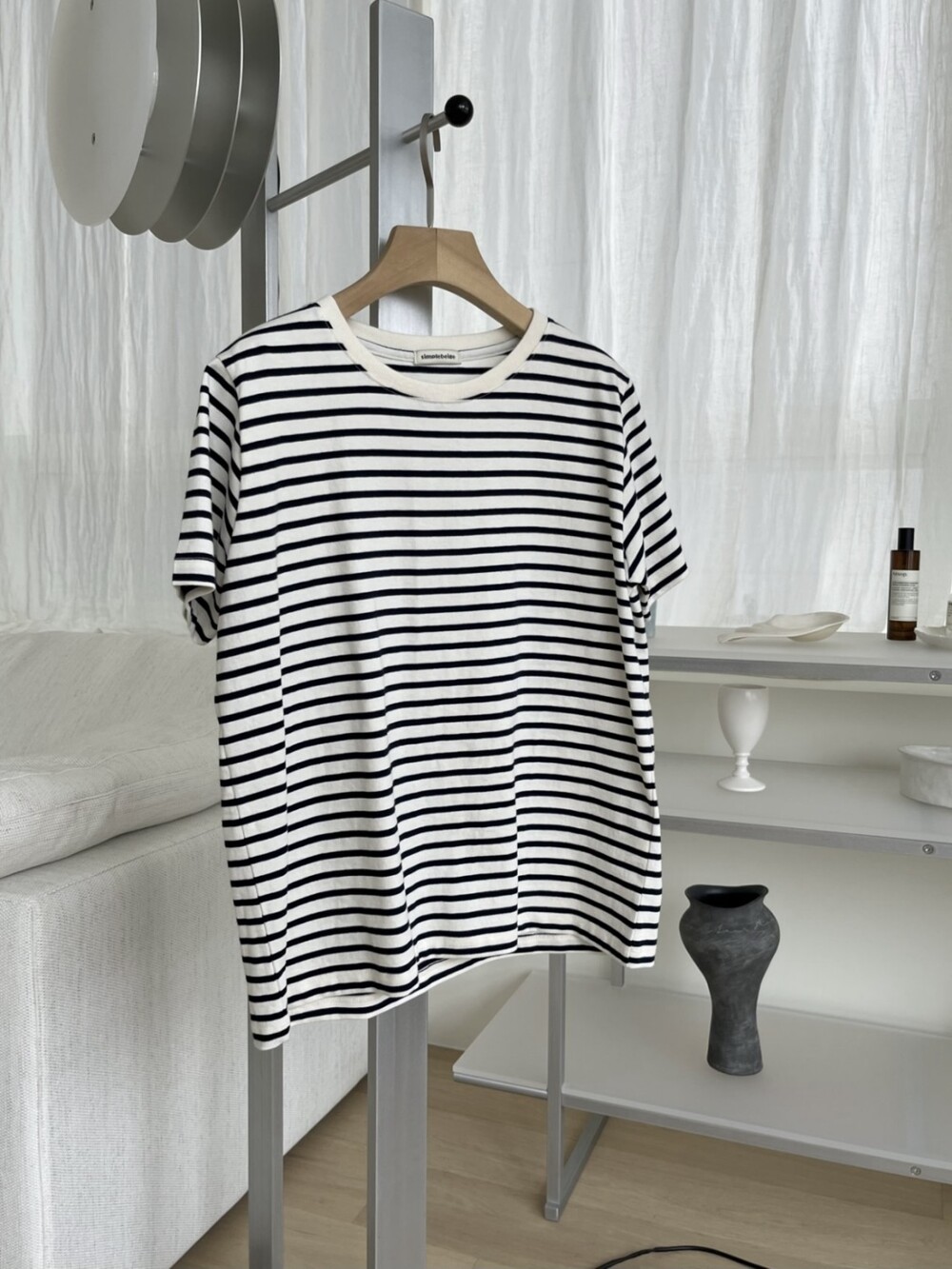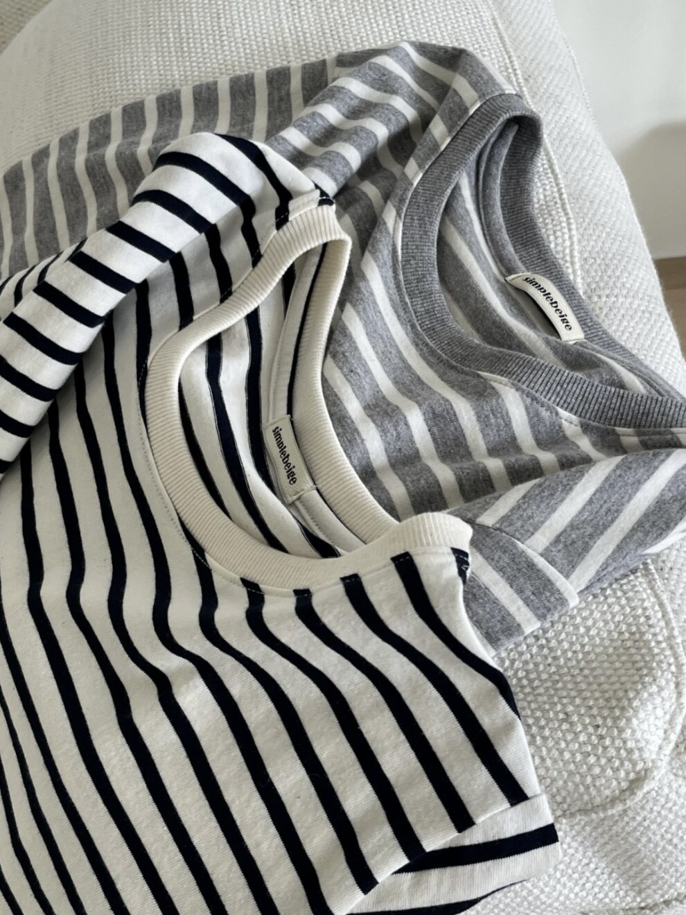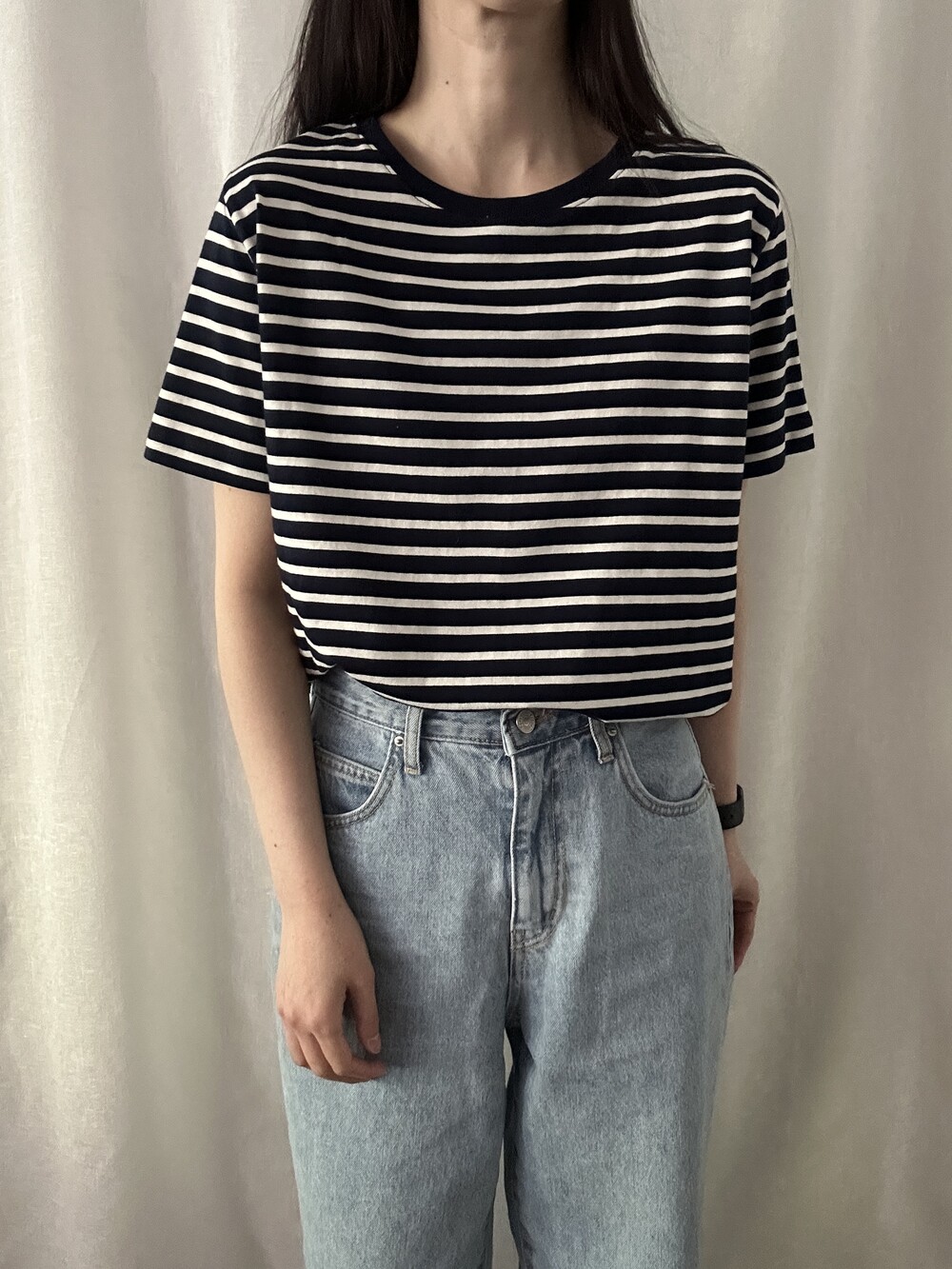 소매길이 , 총장 모두 짧지 않아 부담 없이 입기 좋으며 시간이 지나도 촌스럽지 않은 스트라이프 패턴으로 하나쯤 있으면 여름 내내 든든합니다.