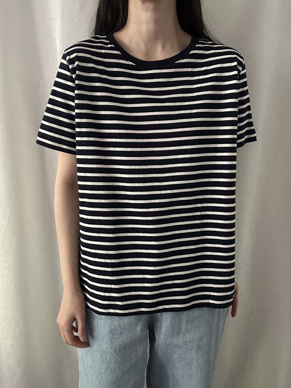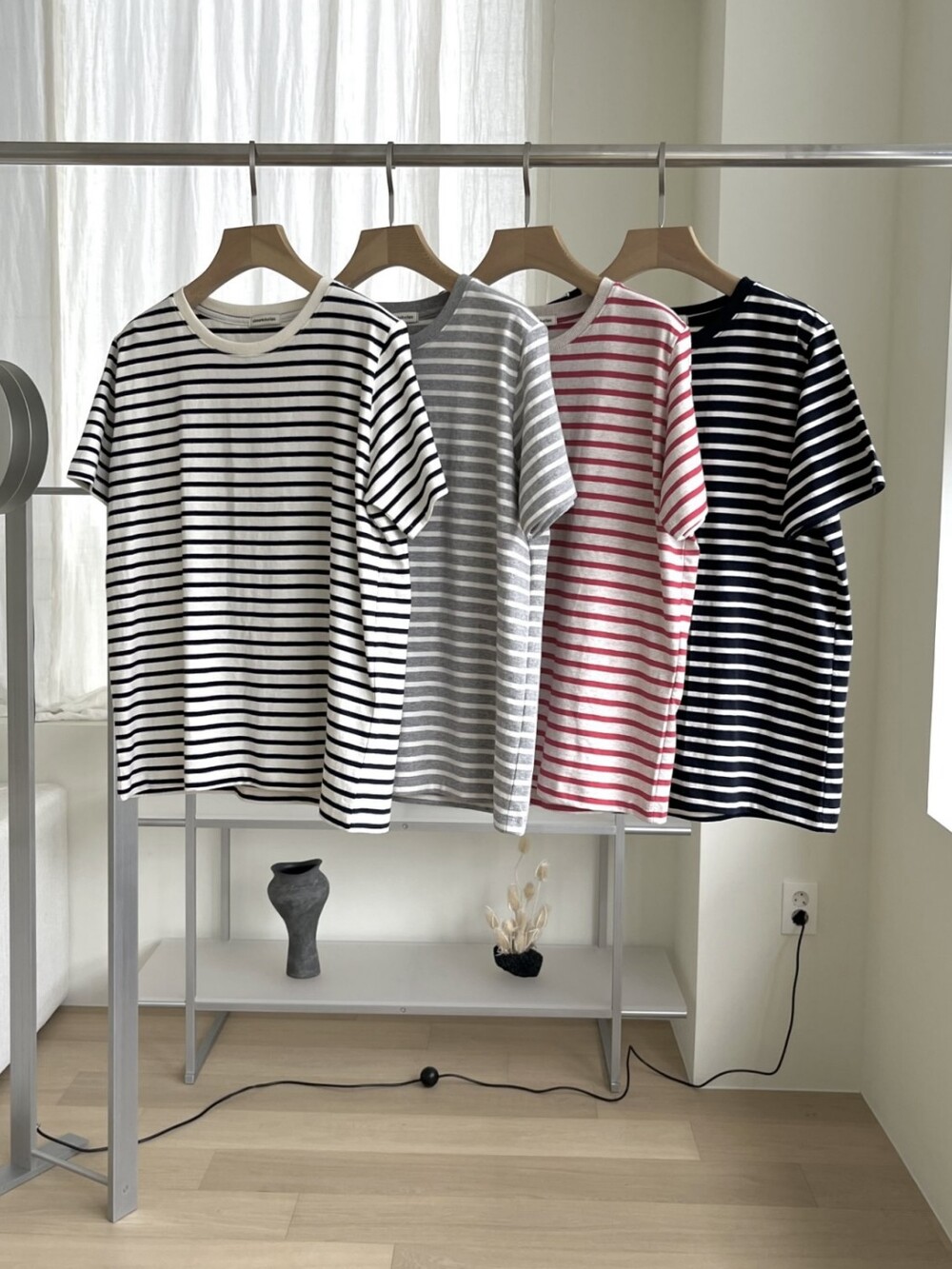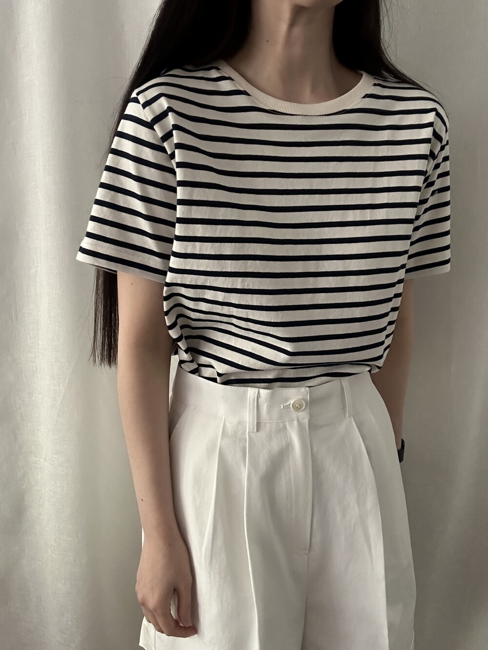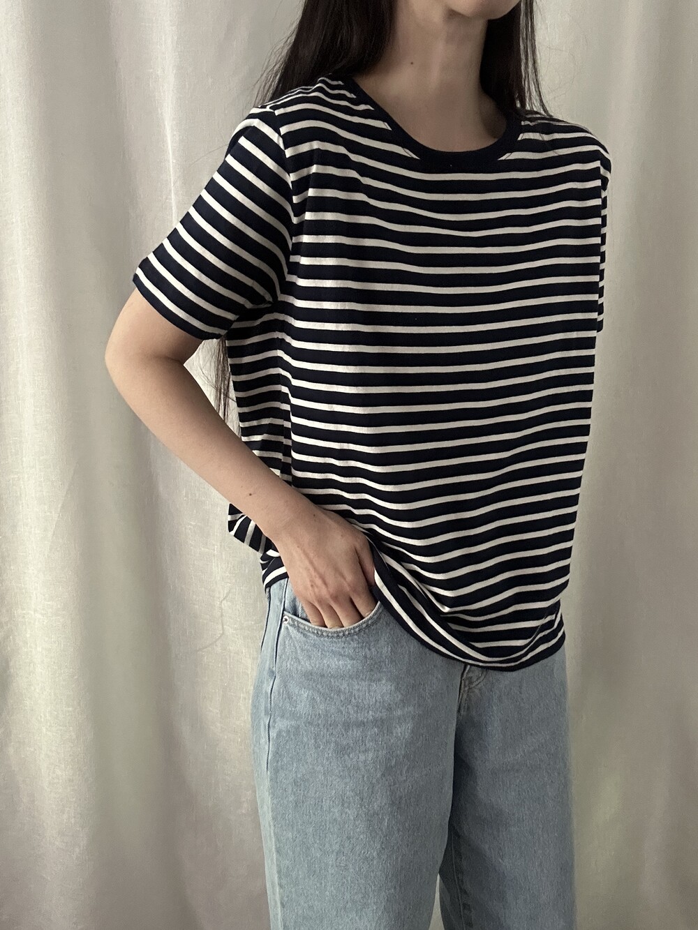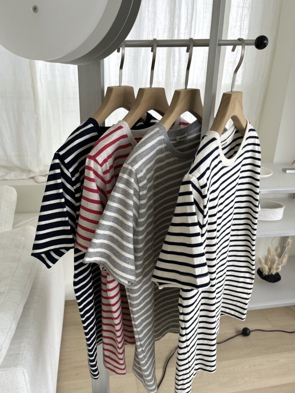 소매길이 , 총장 모두 짧지 않아 부담 없이 입기 좋으며 시간이 지나도 촌스럽지 않은 스트라이프 패턴으로 하나쯤 있으면 여름 내내 든든합니다.