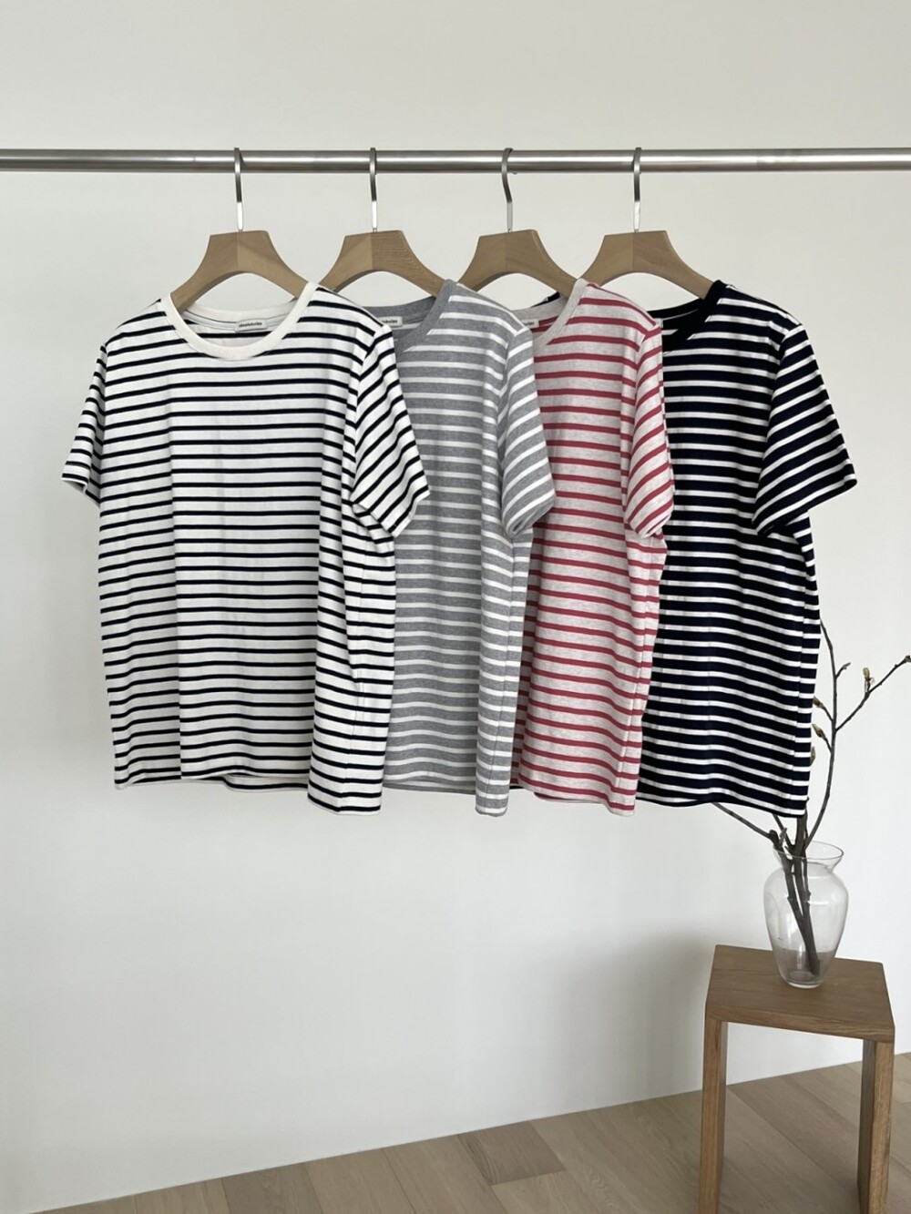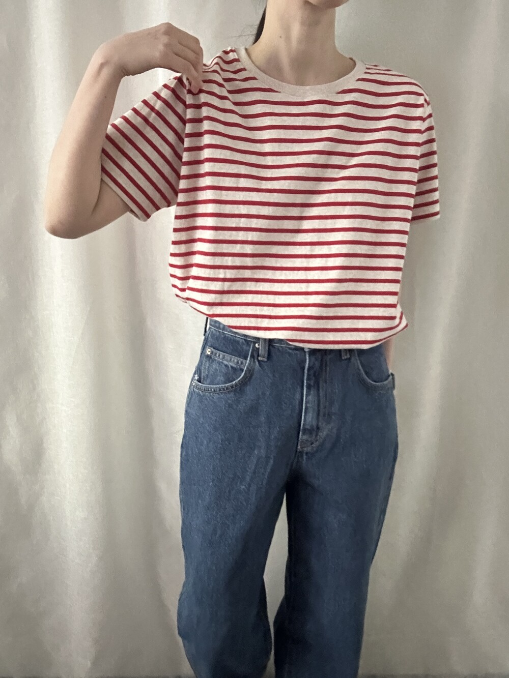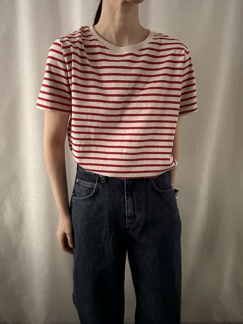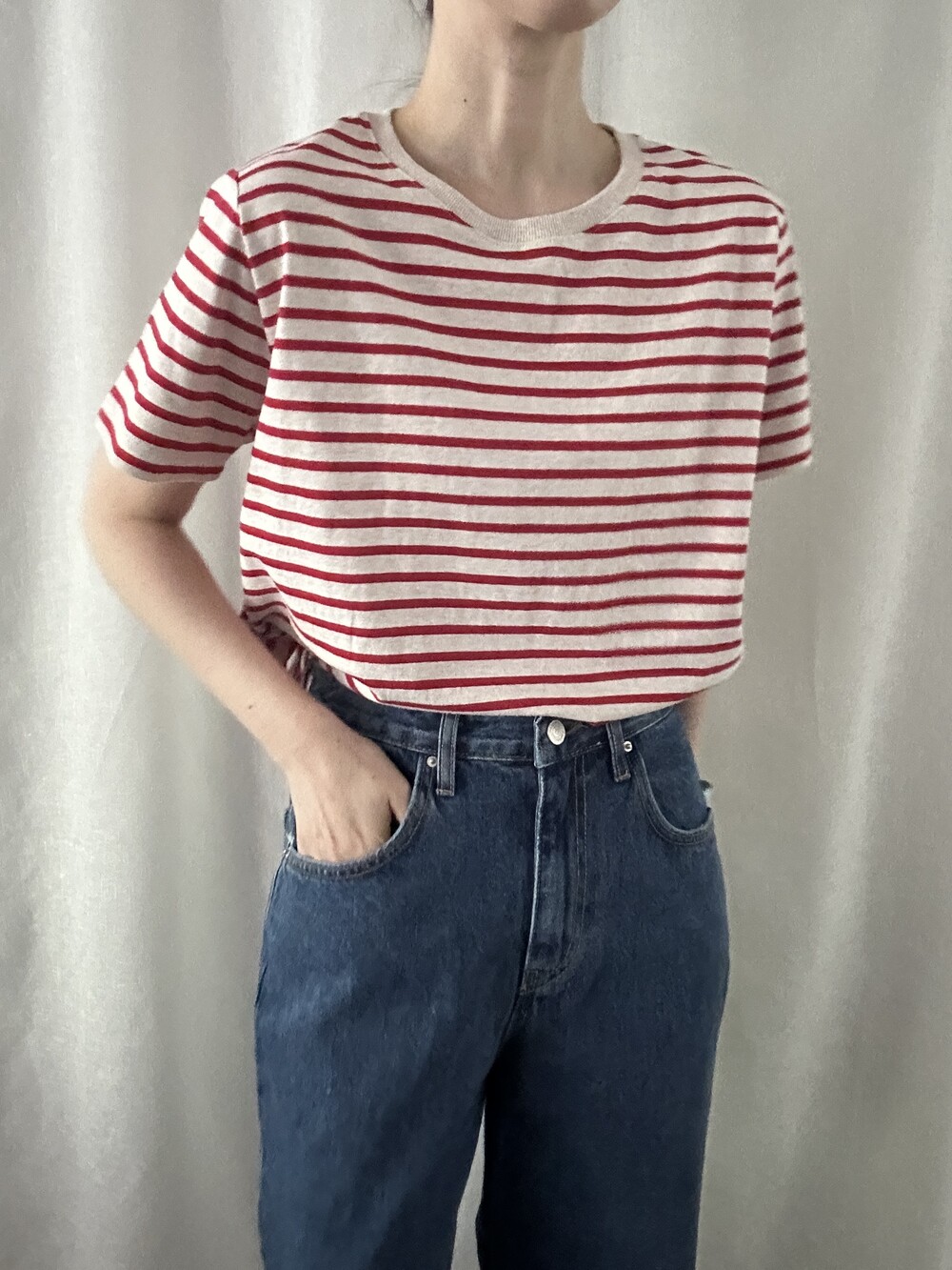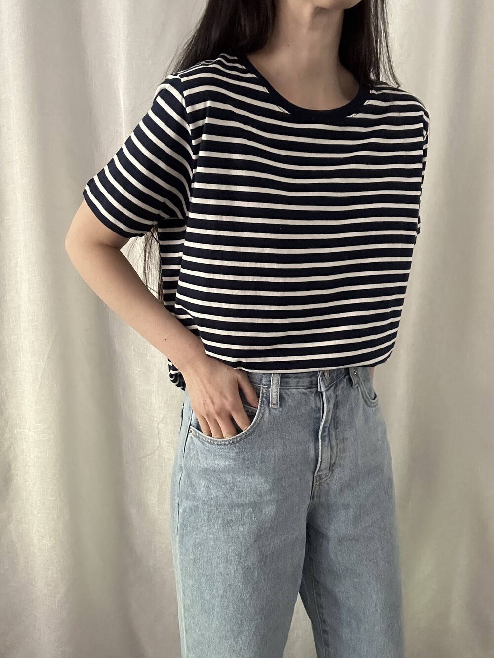 소매길이 , 총장 모두 짧지 않아 부담 없이 입기 좋으며 시간이 지나도 촌스럽지 않은 스트라이프 패턴으로 하나쯤 있으면 여름 내내 든든합니다.