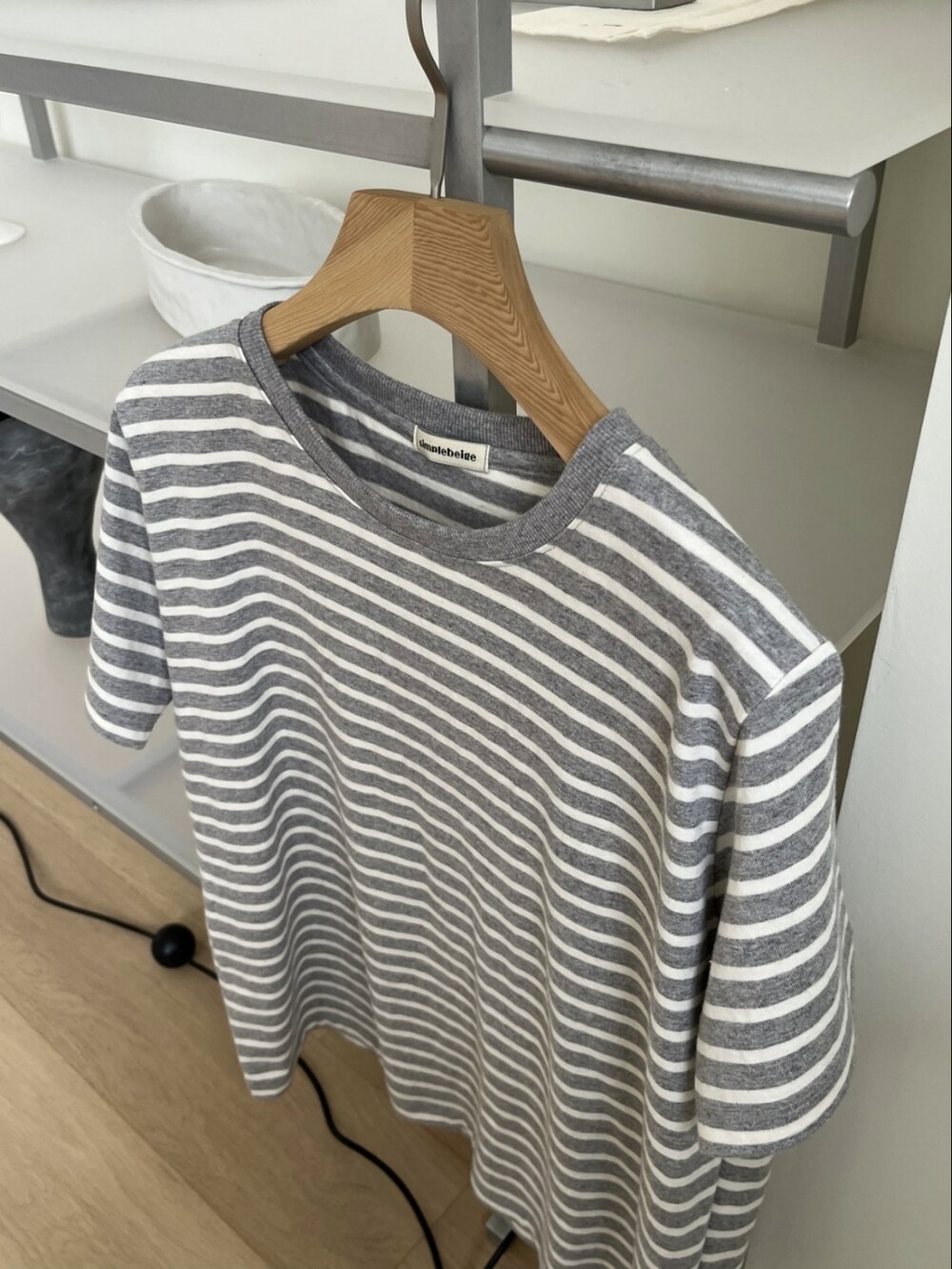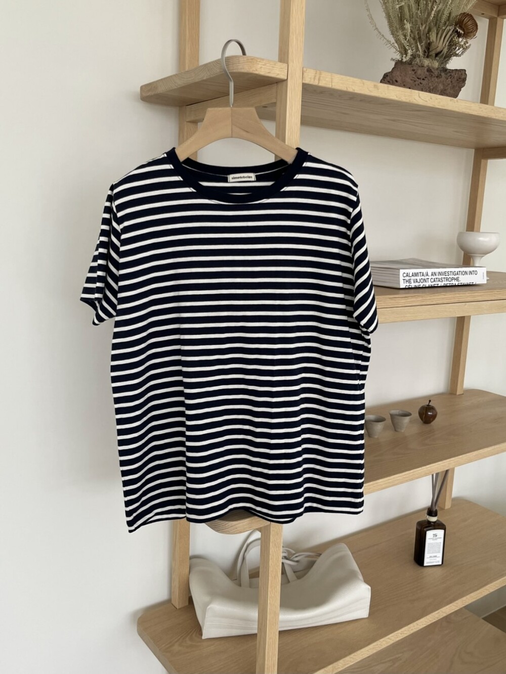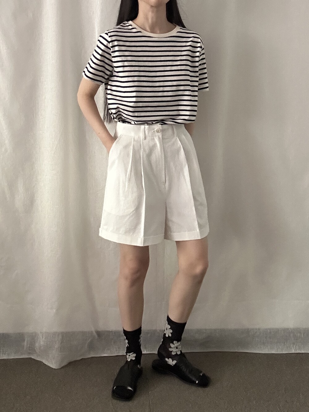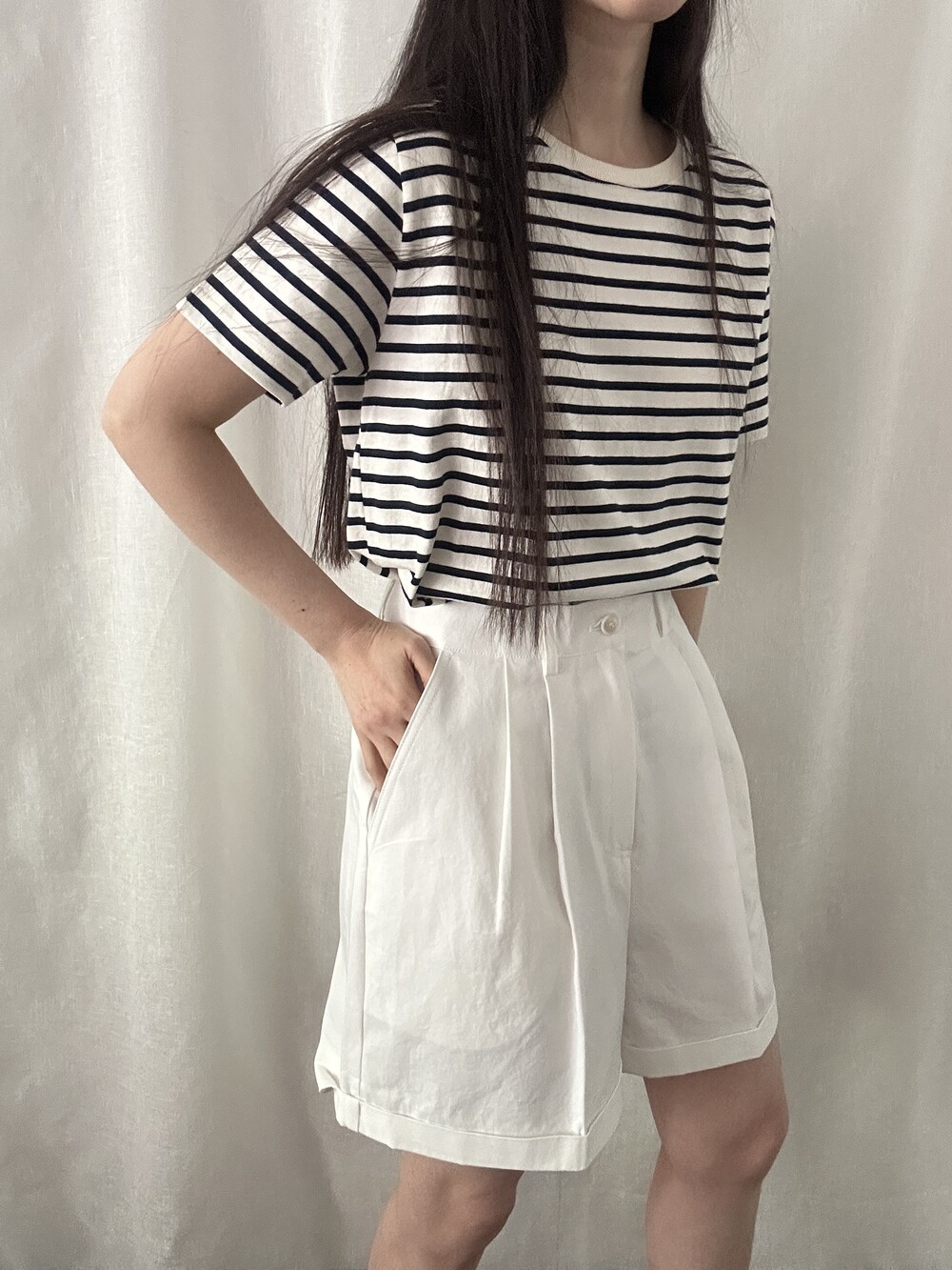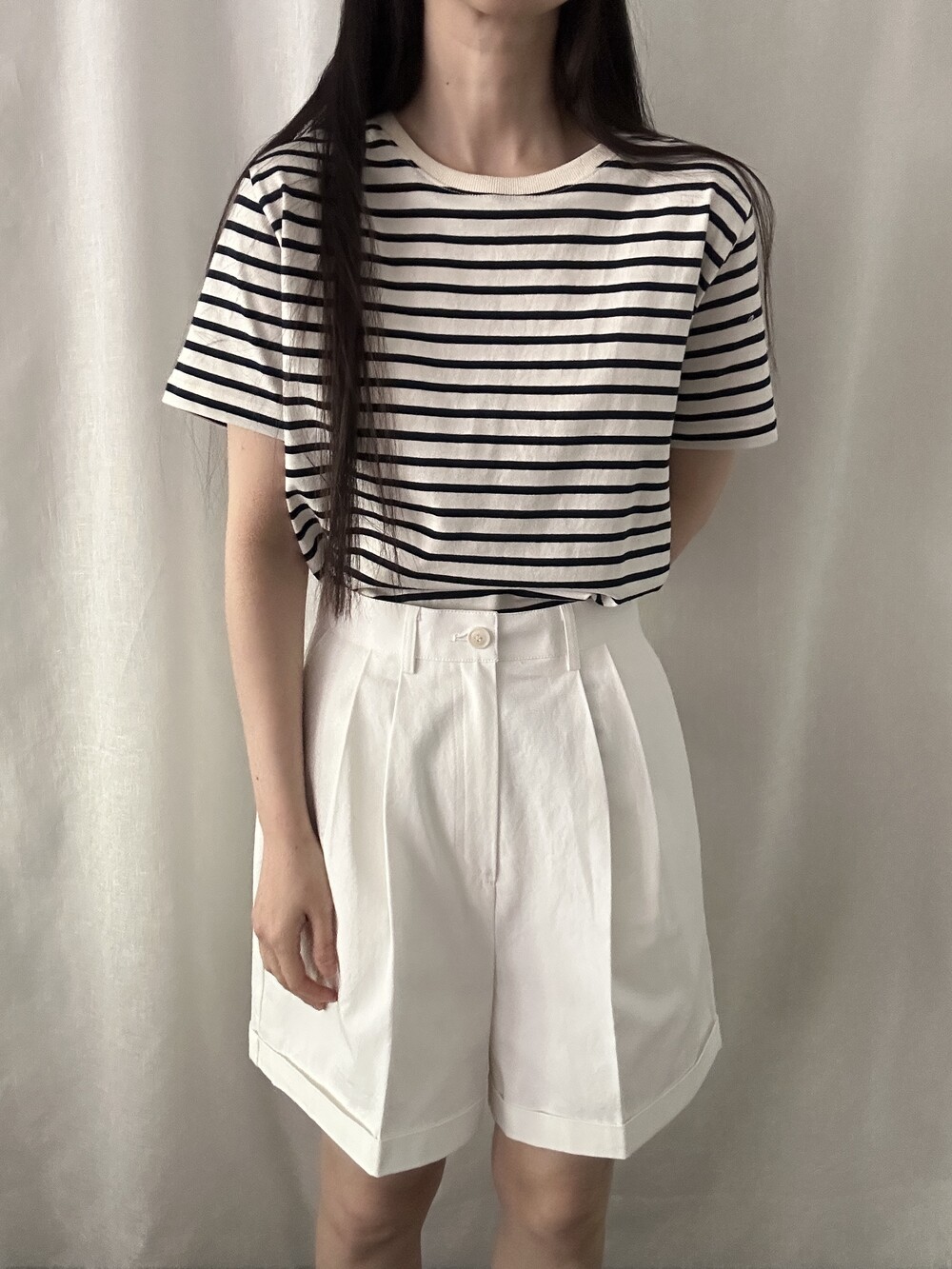 소매길이 , 총장 모두 짧지 않아 부담 없이 입기 좋으며 시간이 지나도 촌스럽지 않은 스트라이프 패턴으로 하나쯤 있으면 여름 내내 든든합니다.