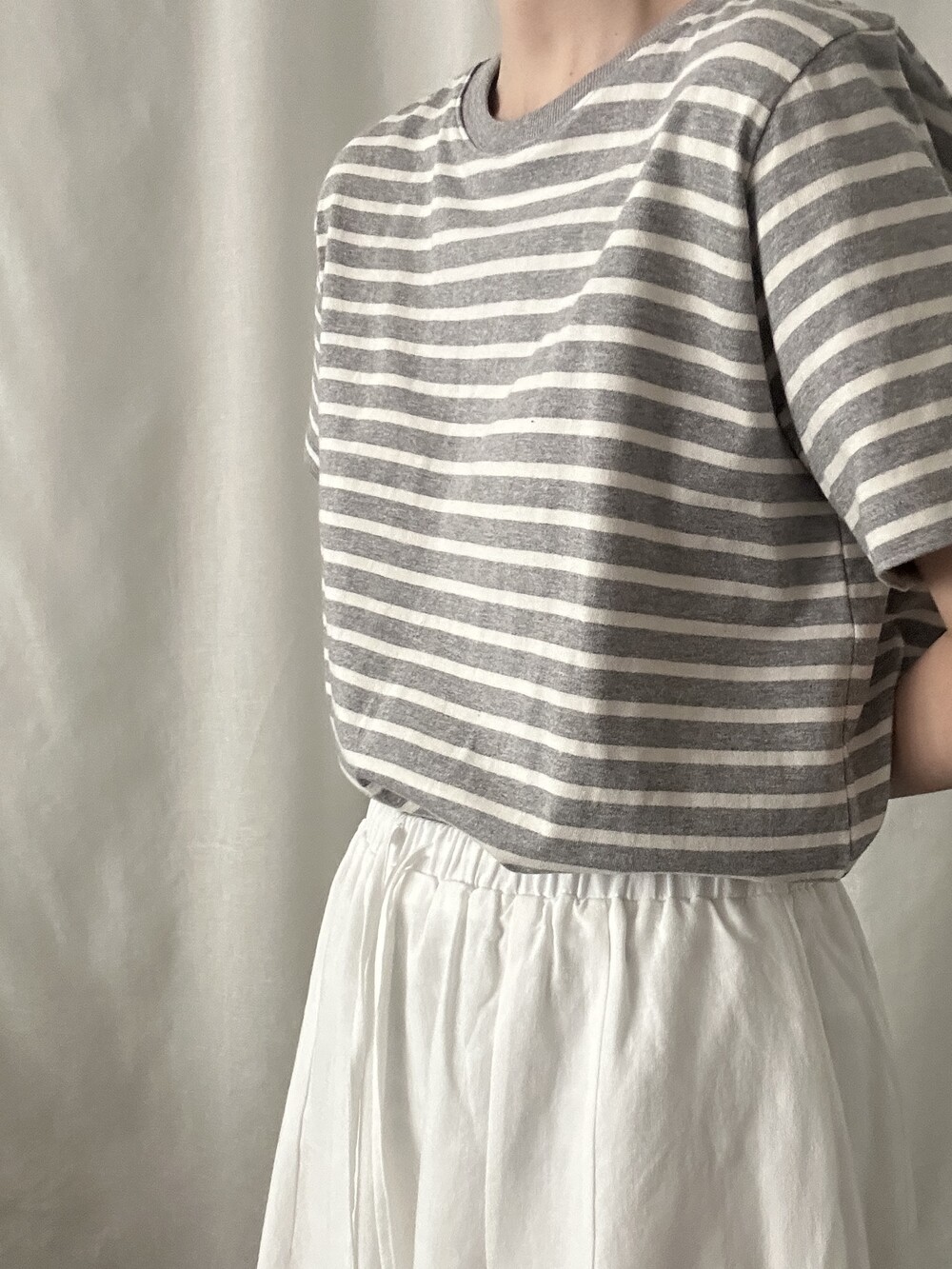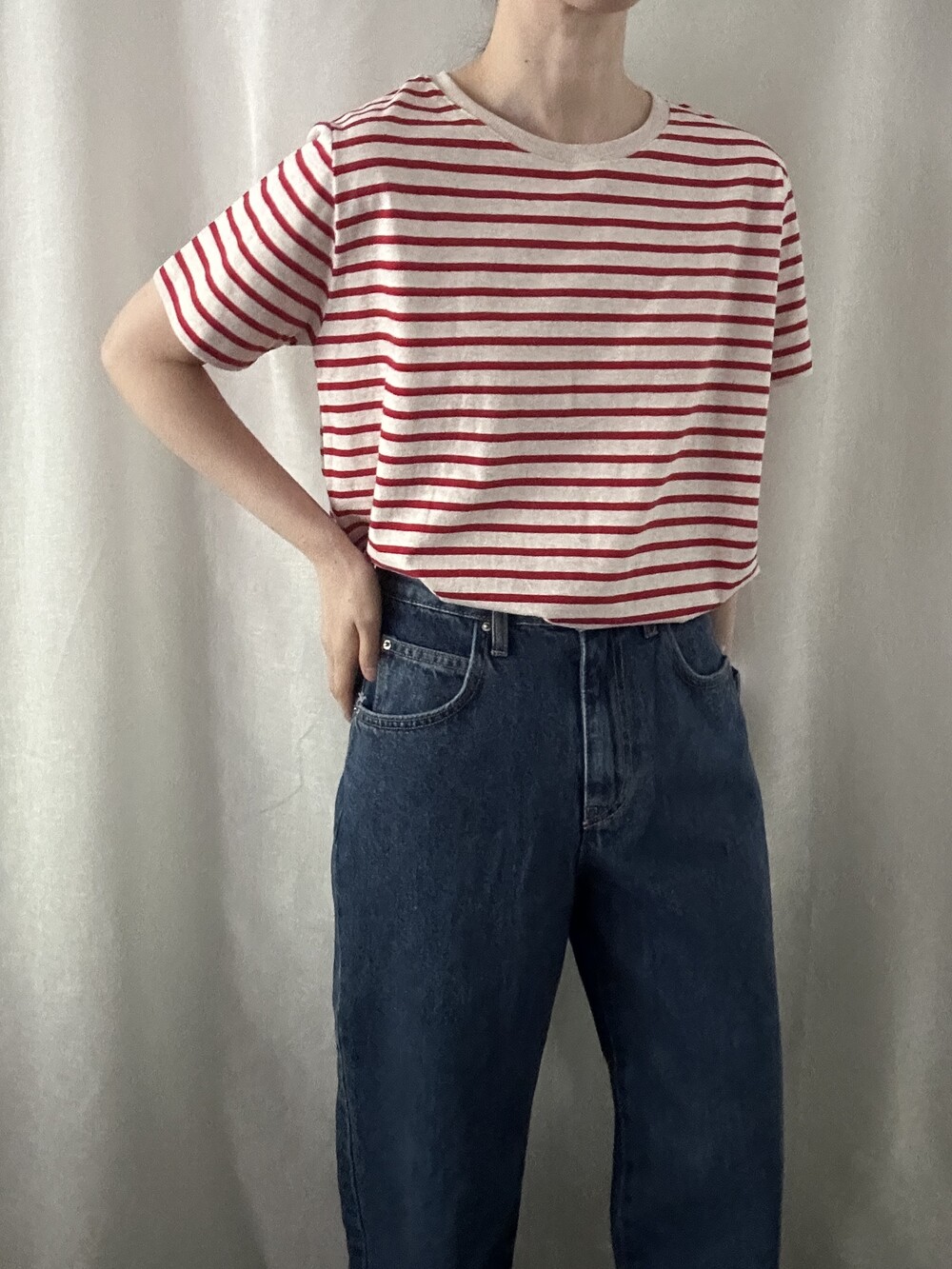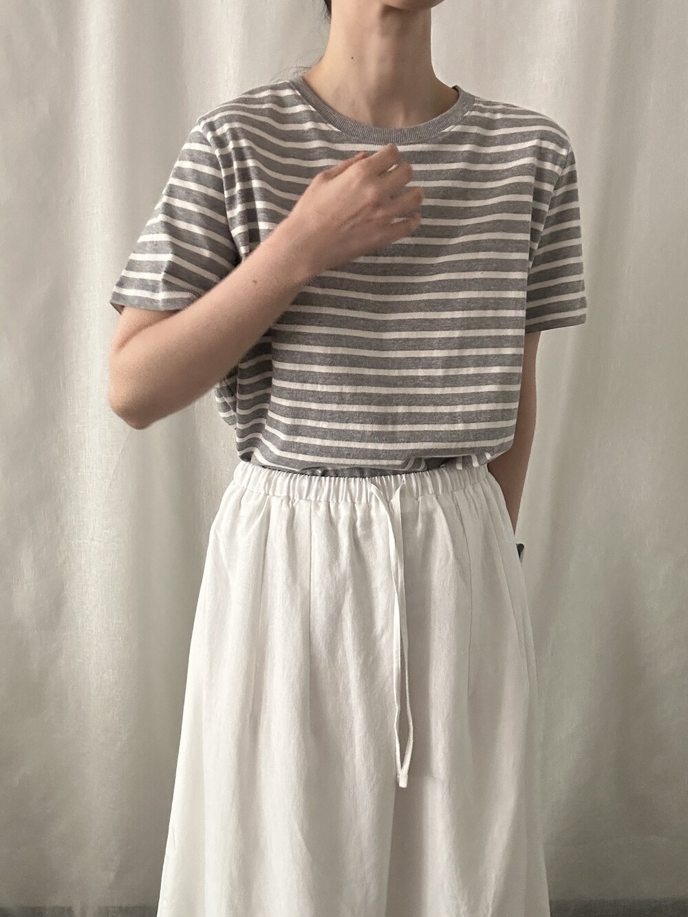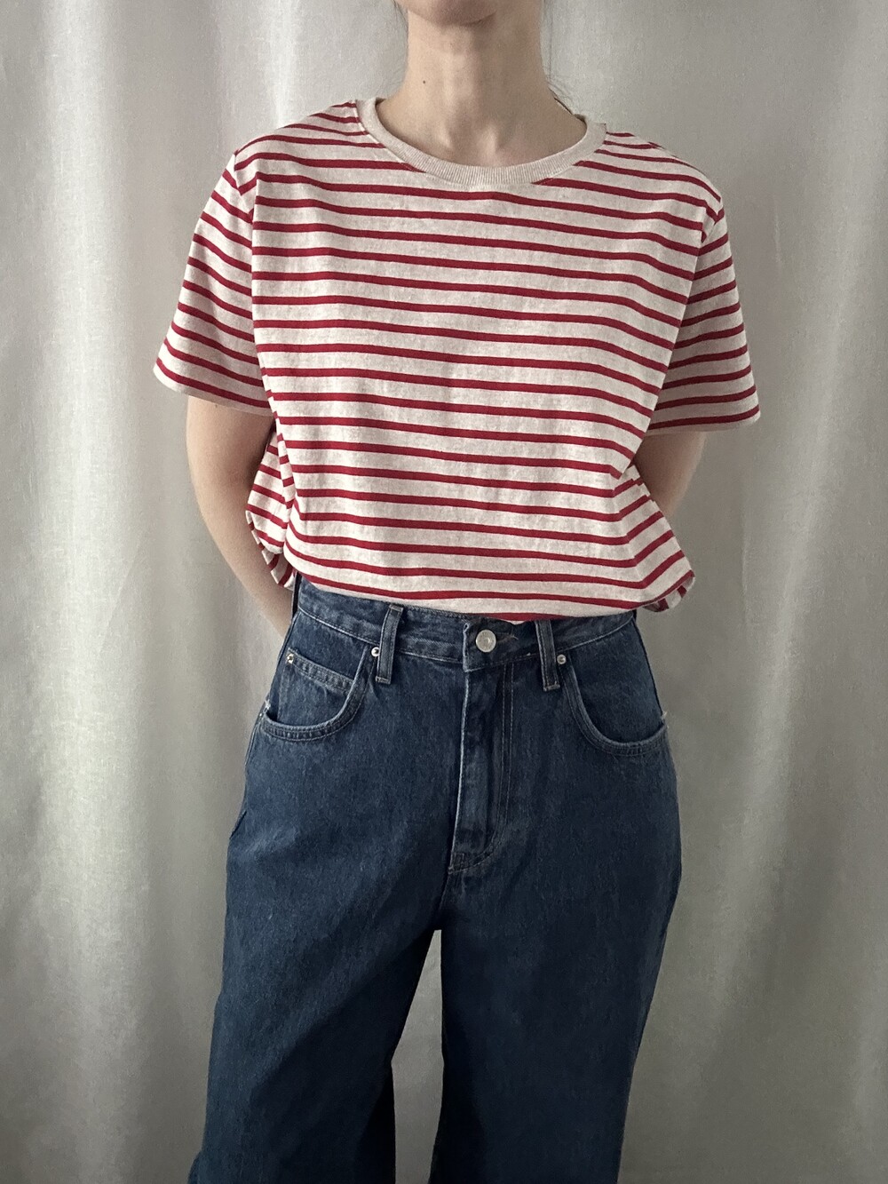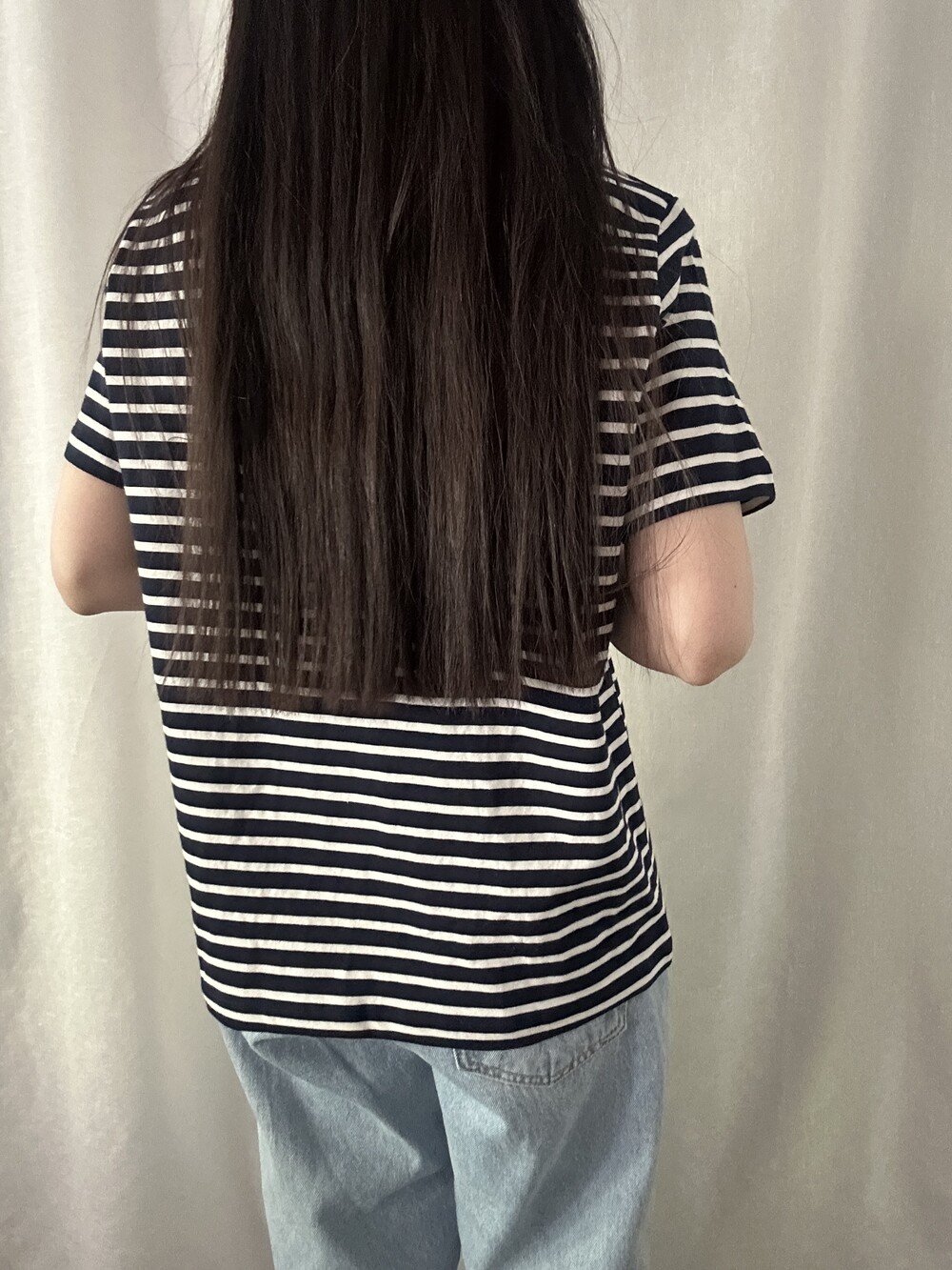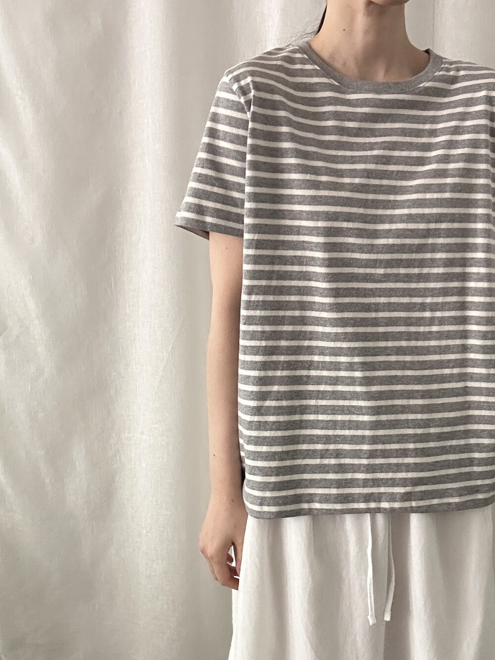 소매길이 , 총장 모두 짧지 않아 부담 없이 입기 좋으며 시간이 지나도 촌스럽지 않은 스트라이프 패턴으로 하나쯤 있으면 여름 내내 든든합니다.
