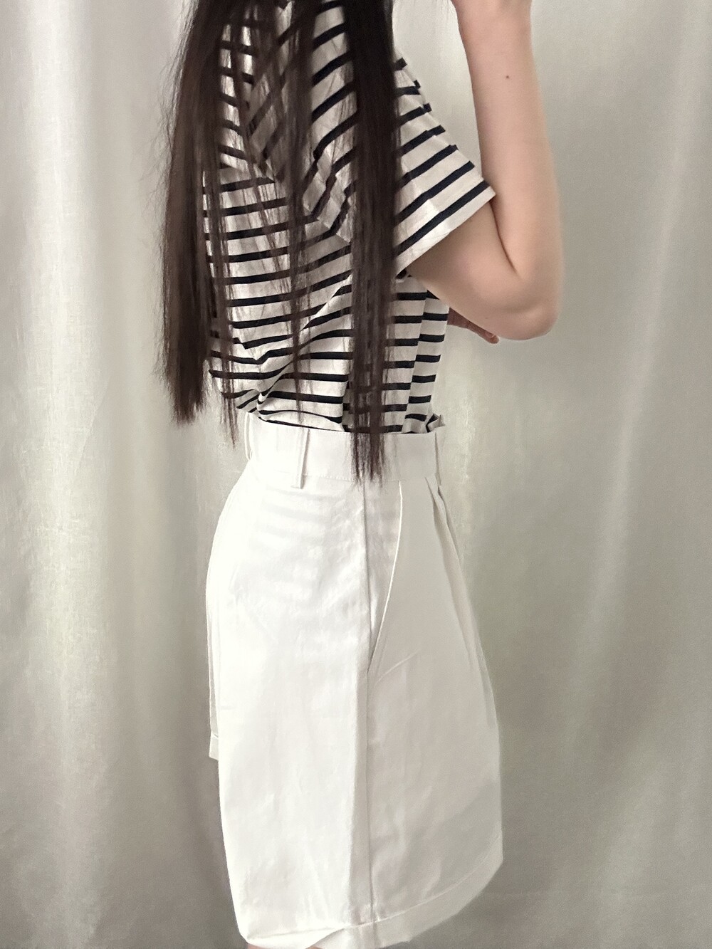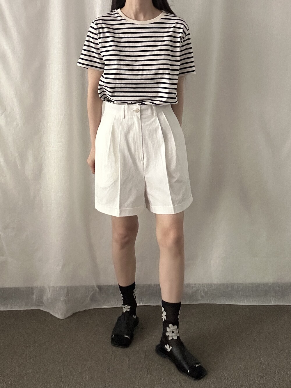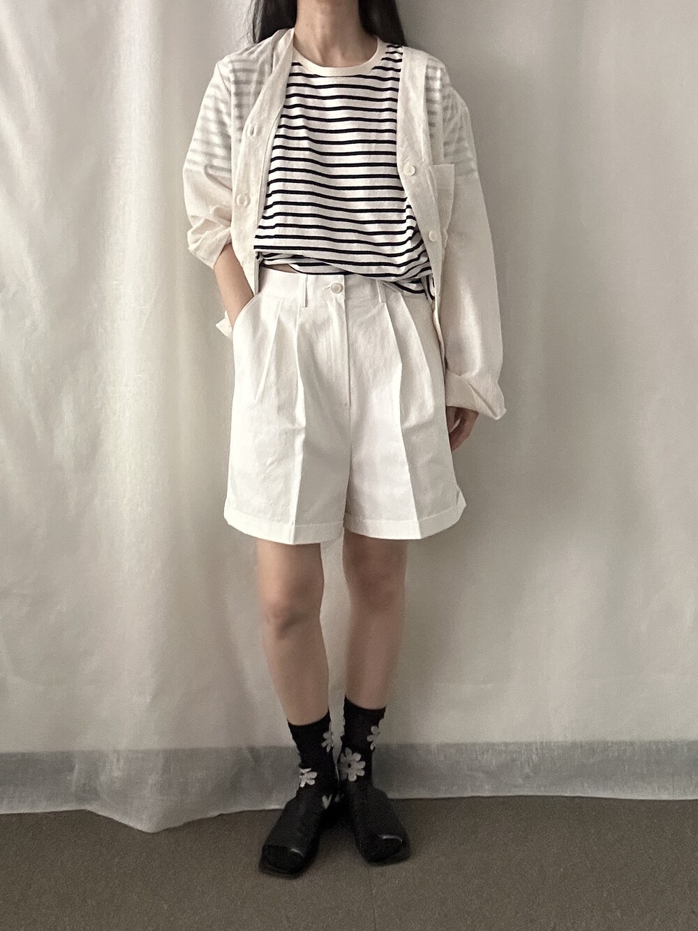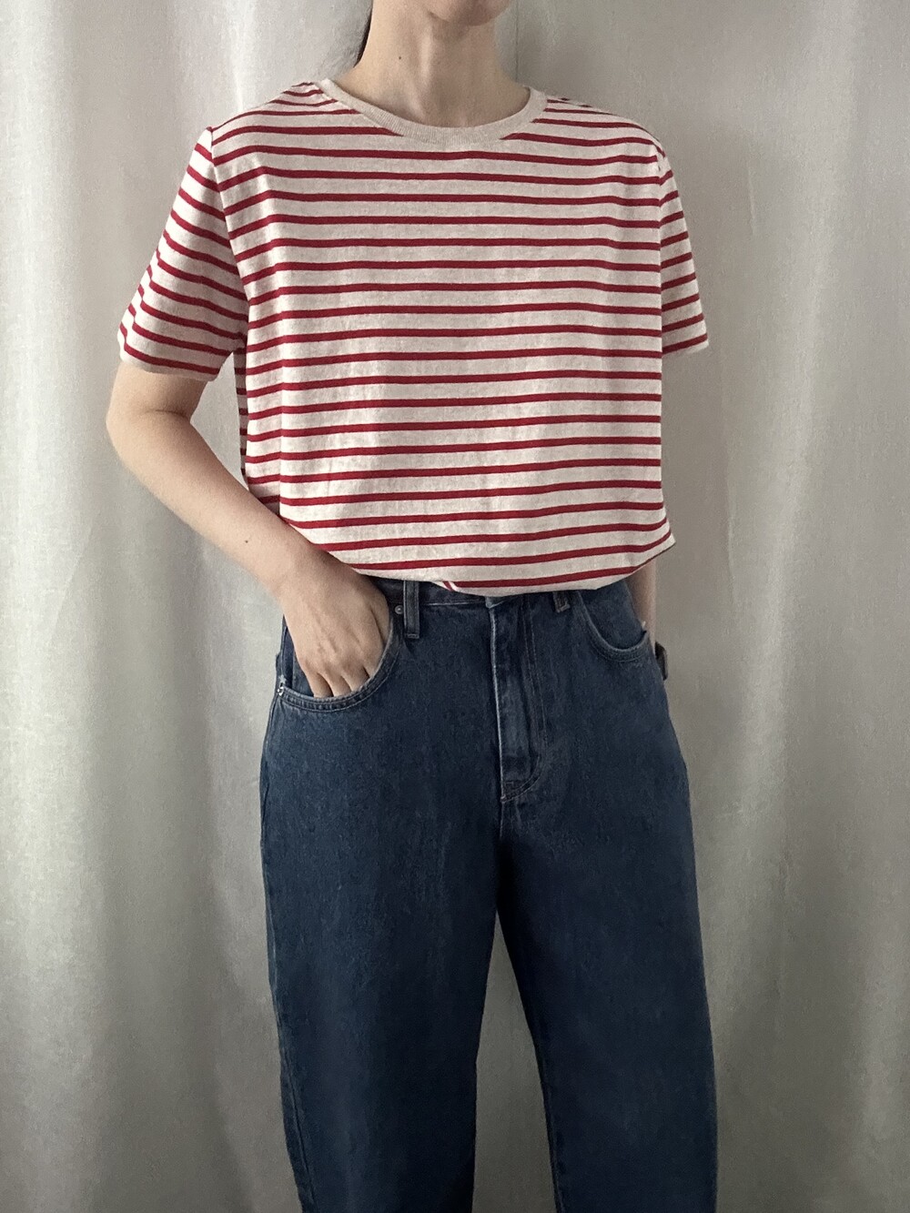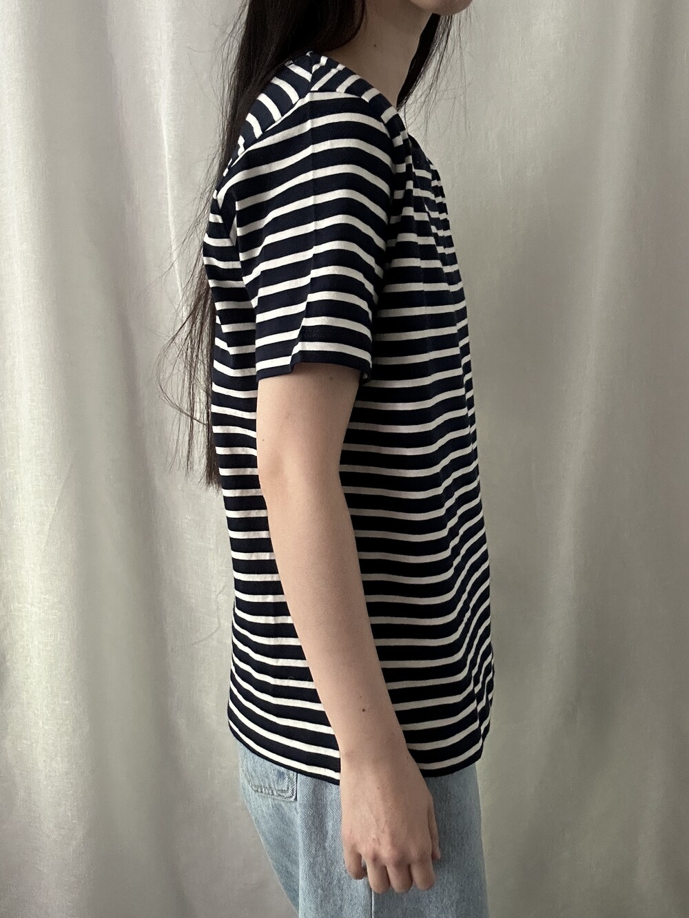 소매길이 , 총장 모두 짧지 않아 부담 없이 입기 좋으며 시간이 지나도 촌스럽지 않은 스트라이프 패턴으로 하나쯤 있으면 여름 내내 든든합니다.